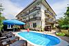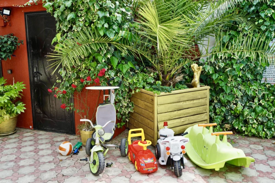Гостевой дом «Sanremo» предлагает теплый бассейн с детской горкой и шезлонгами по периметру — отличное место для отдыха как детей, так и взрослых.