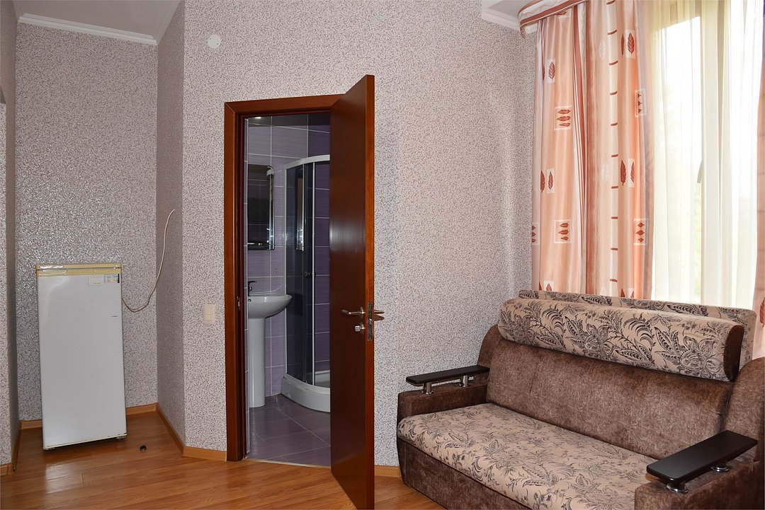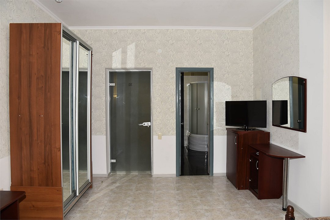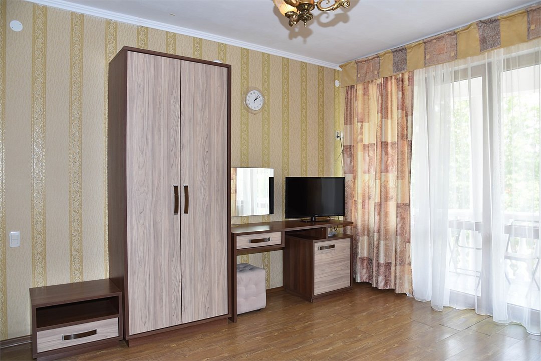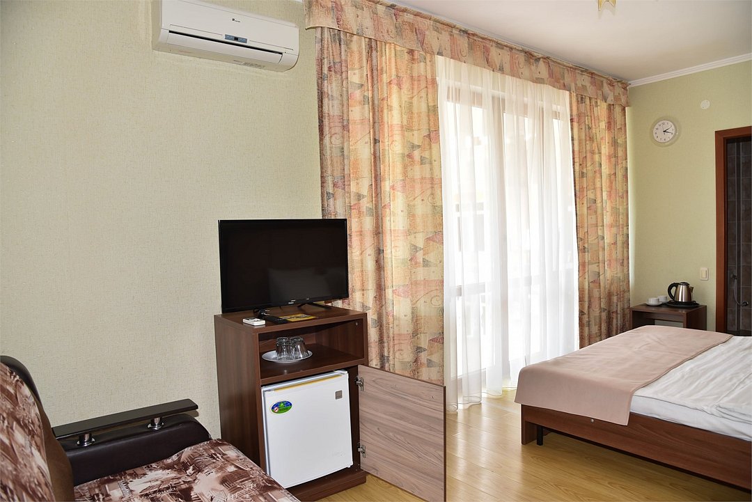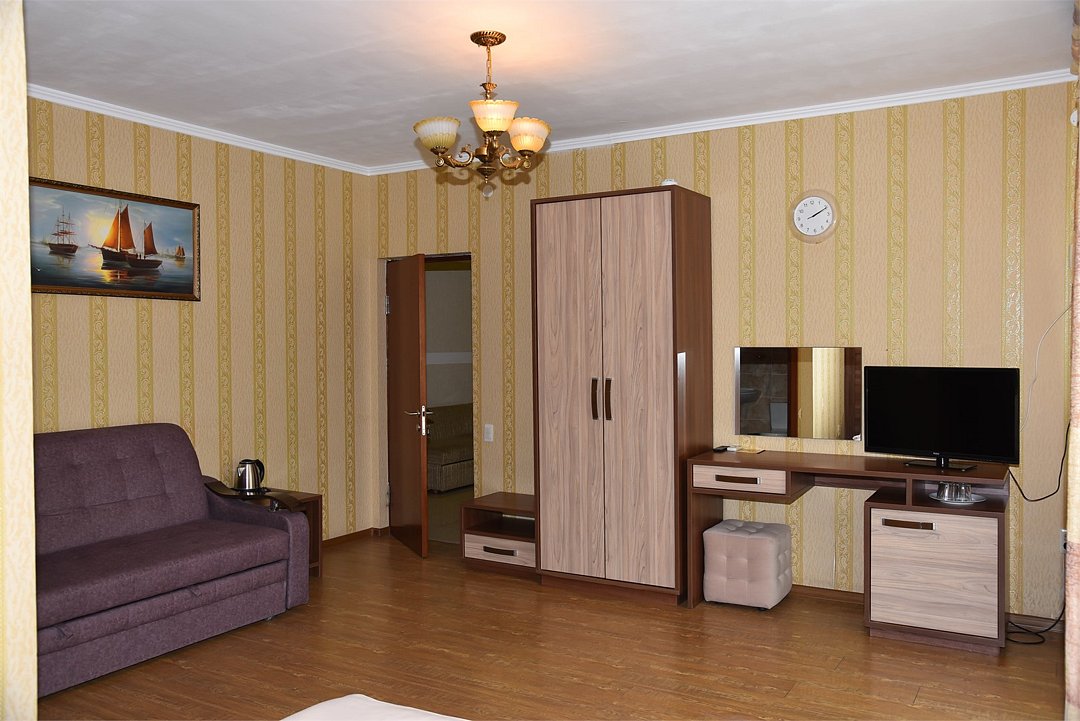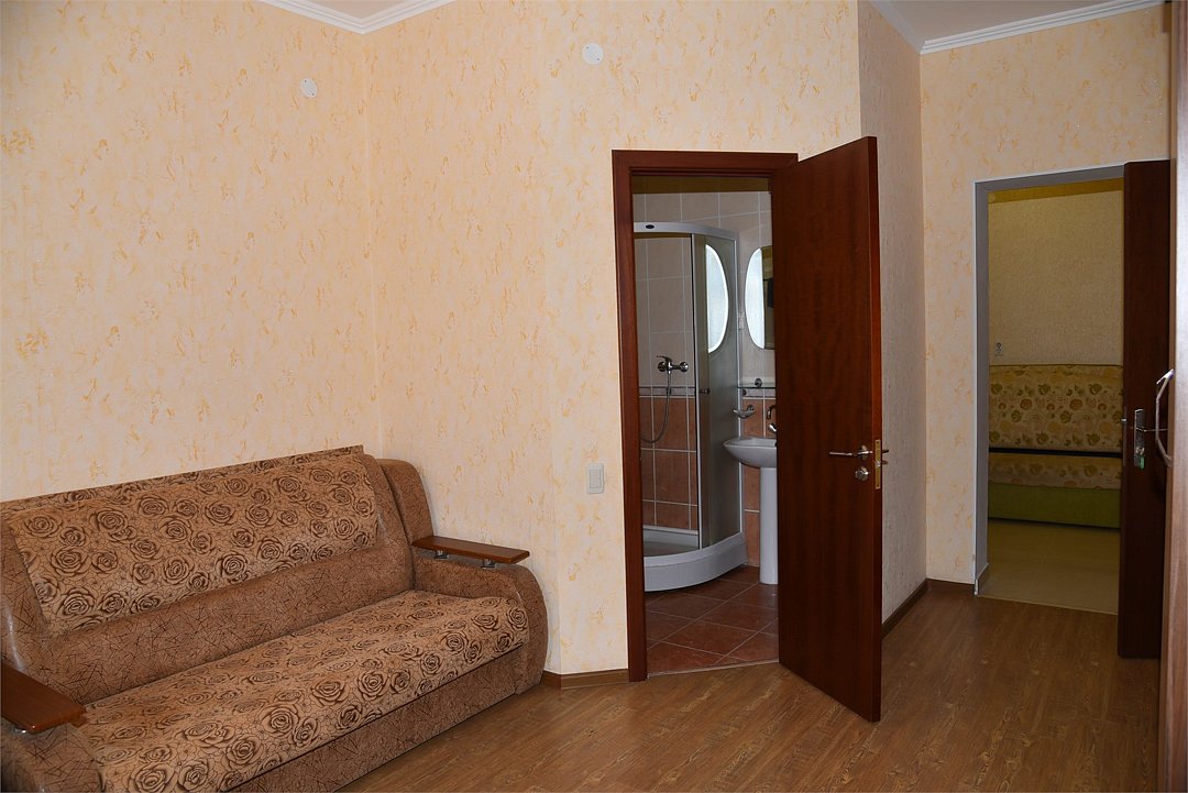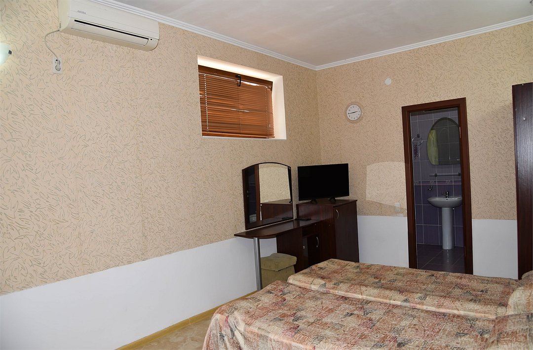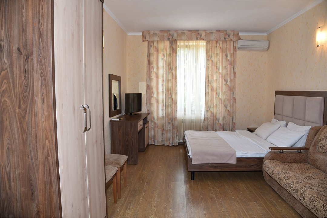 В номере двуспальная кровать, большой диван, телевизор, мини-холодильник, кондиционер,шкаф, тумбочки, журнальный столик, санузел в номере( душ).Пятиместный номер"Полу-цоколь"
