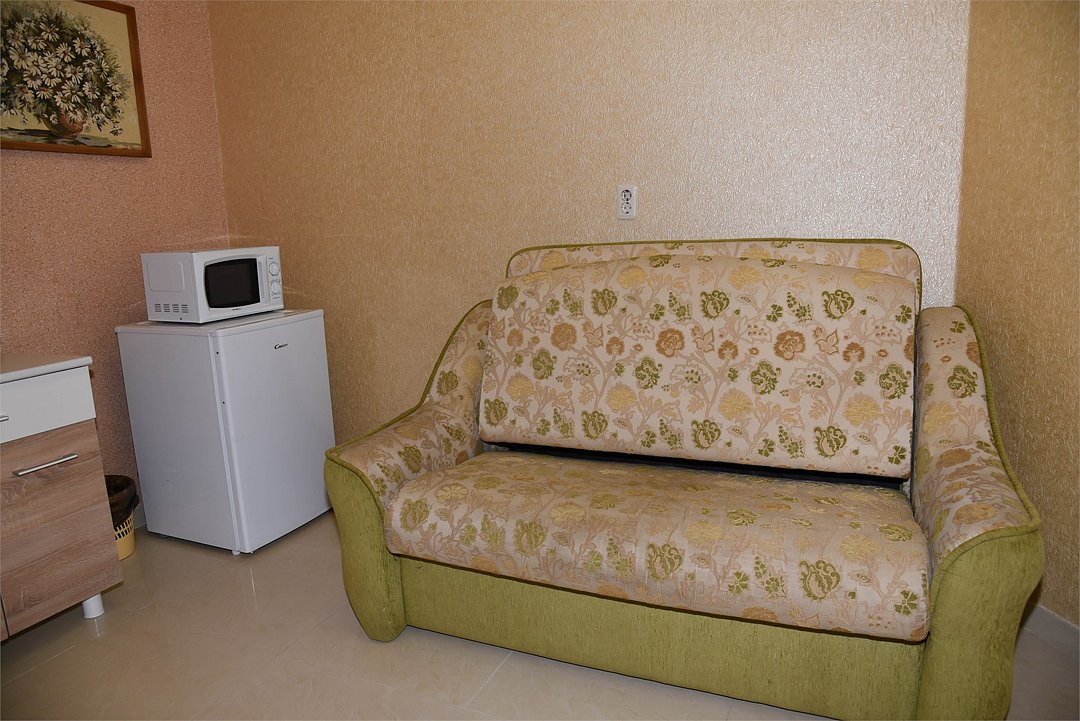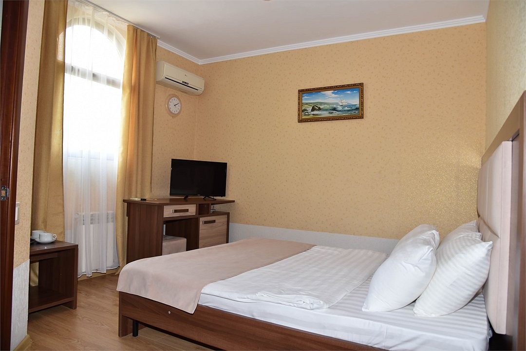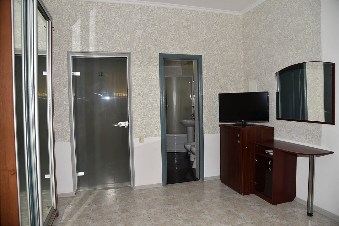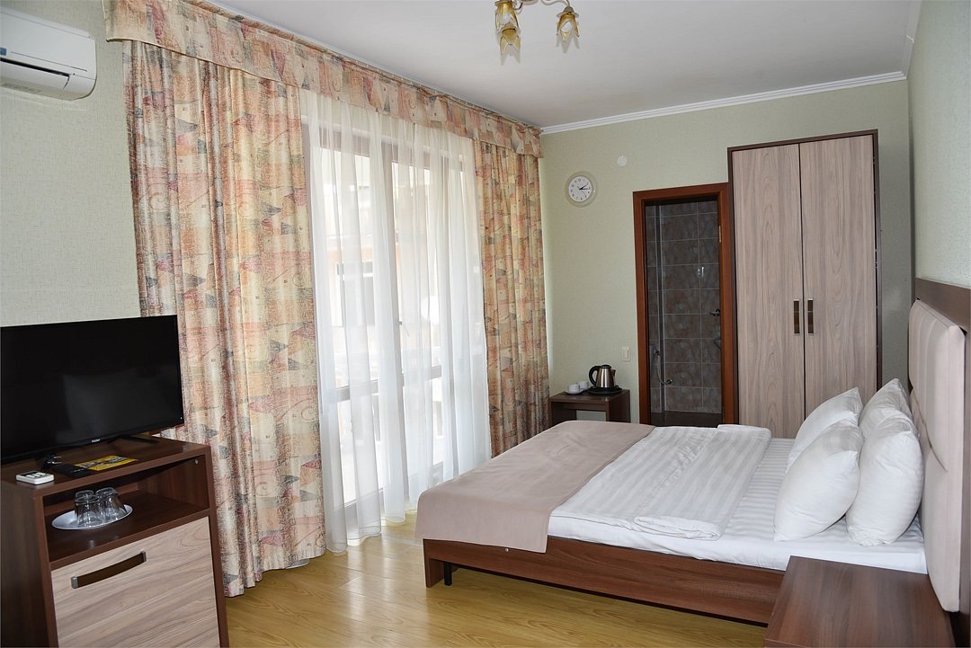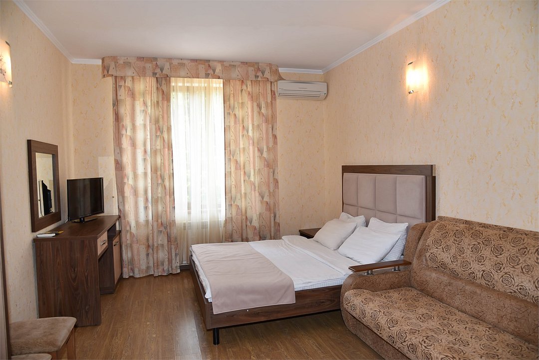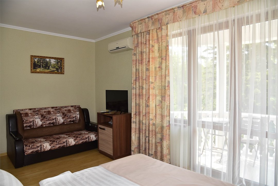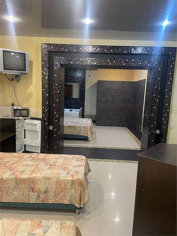 В номере двуспальная кровать, большой диван, телевизор, мини-холодильник, кондиционер,шкаф, тумбочки, журнальный столик, санузел в номере( душ).Пятиместный номер"Полу-цоколь"