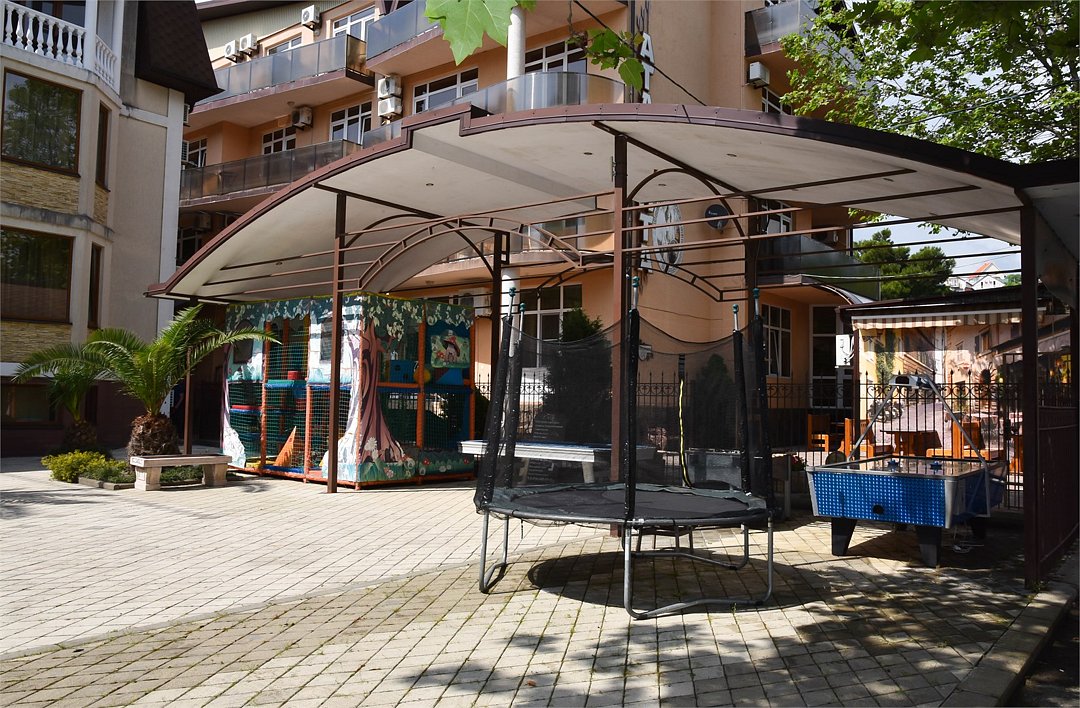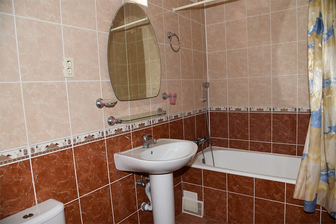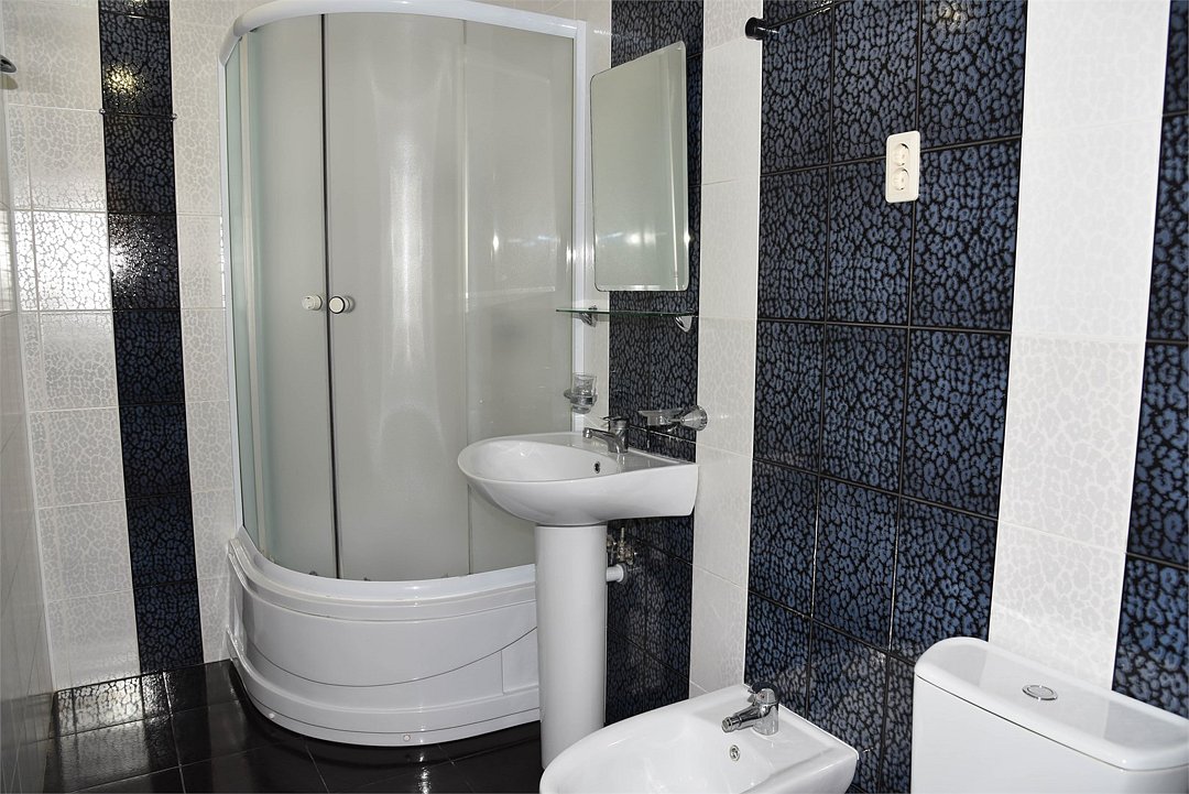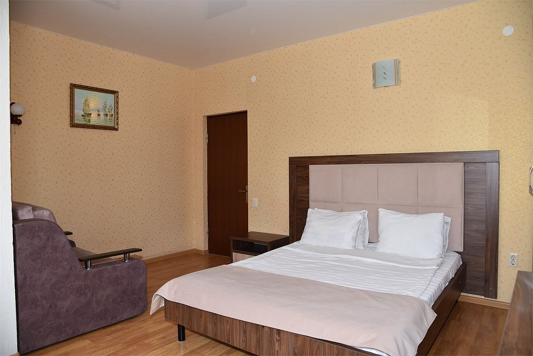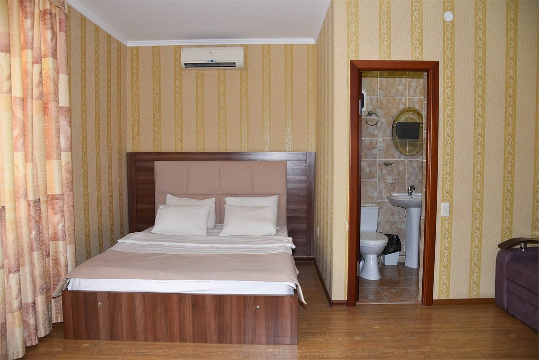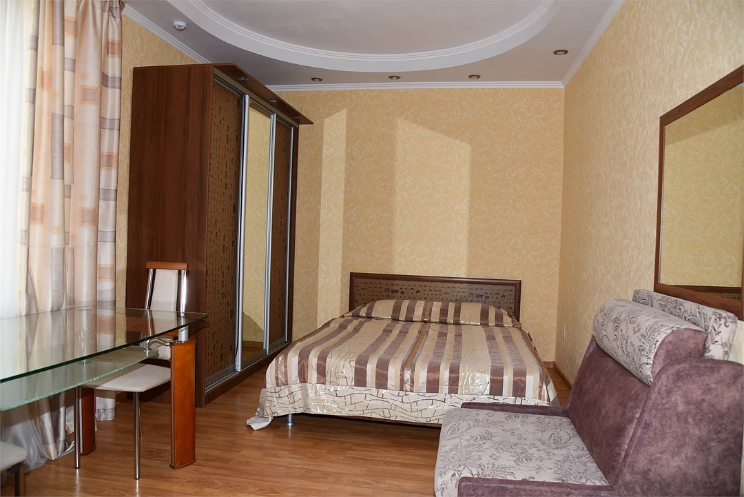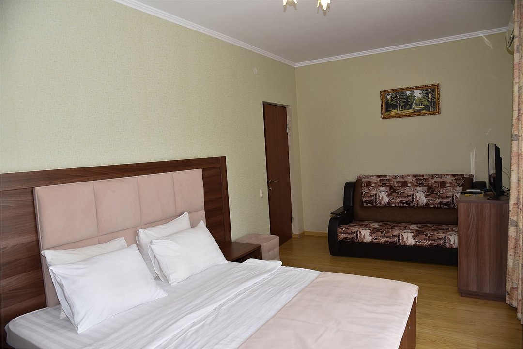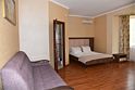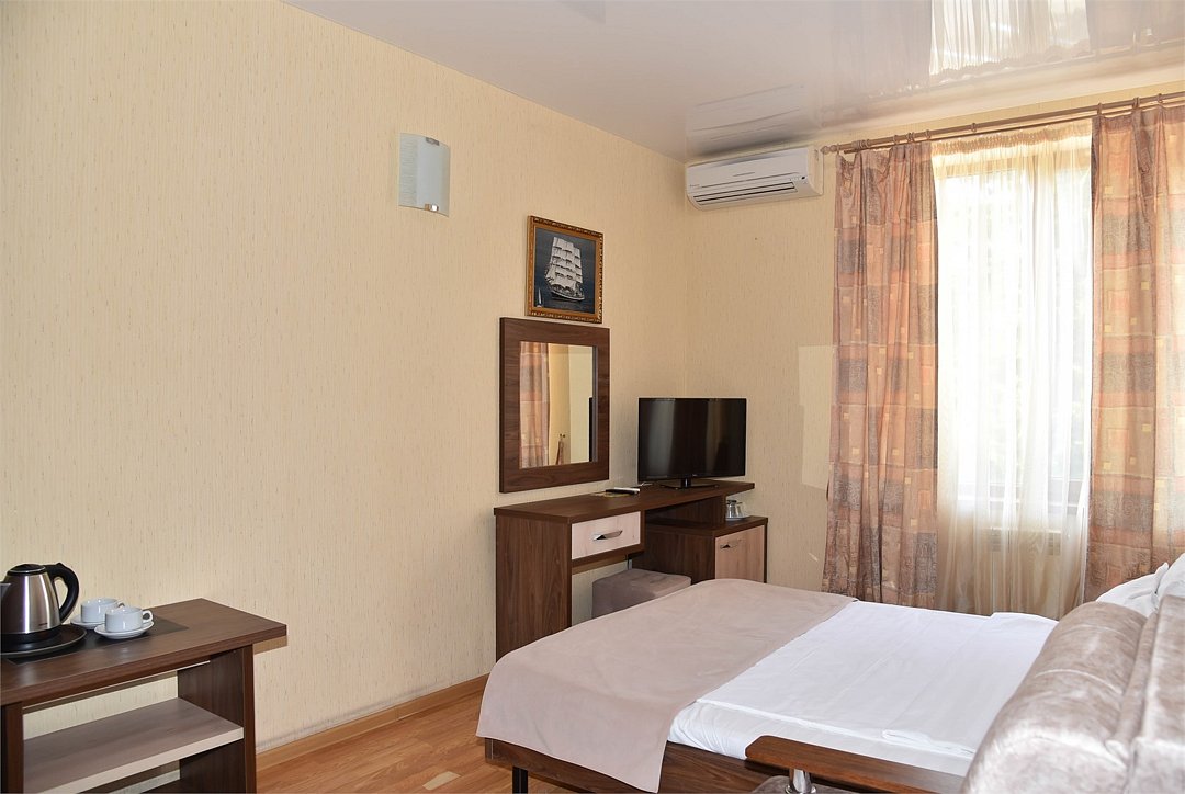 В номере двуспальная кровать, большой диван, телевизор, мини-холодильник, кондиционер,шкаф, тумбочки, журнальный столик, санузел в номере( душ).Пятиместный номер"Полу-цоколь"