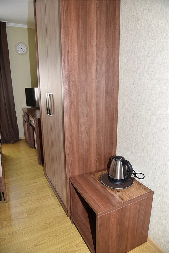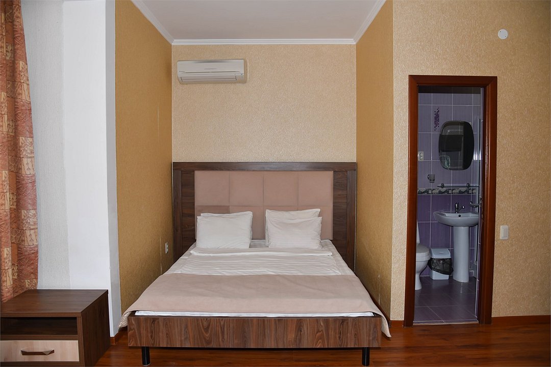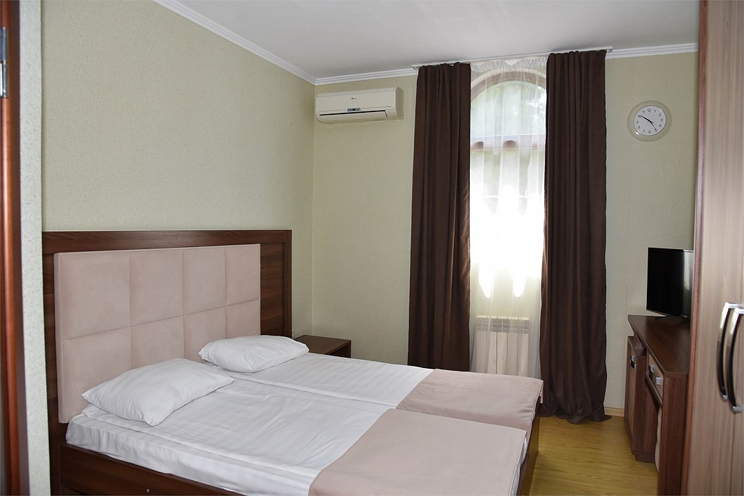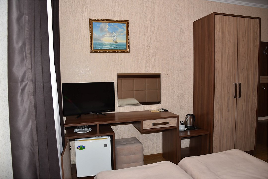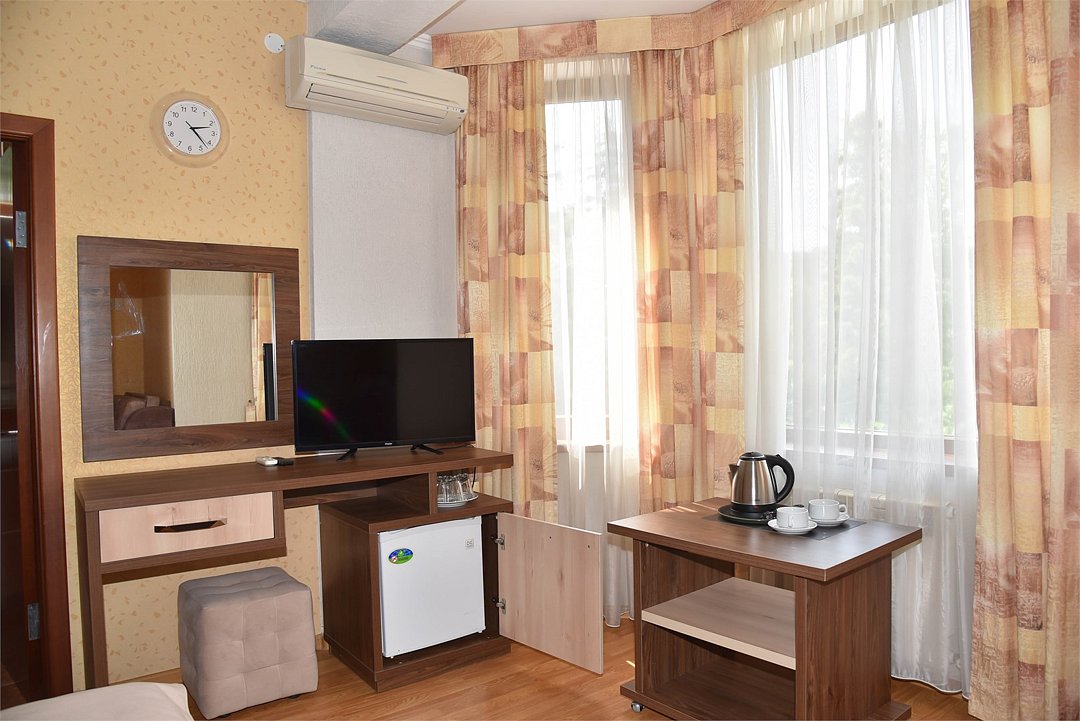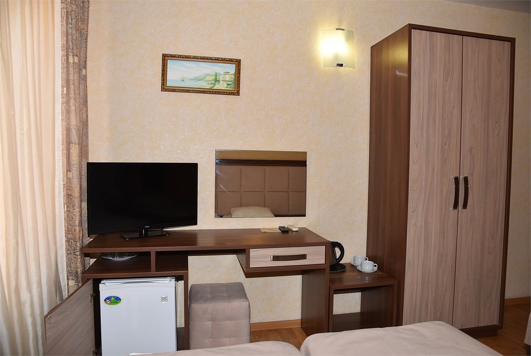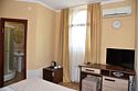 2 местный номер с двумя раздельными кроватями. В номере телевизор, мини-холодильник, кондиционер, шкаф, тумбочки,журнальный столик,санузел в номере, без балкона.Двухместный номер с двуспальной кроватью