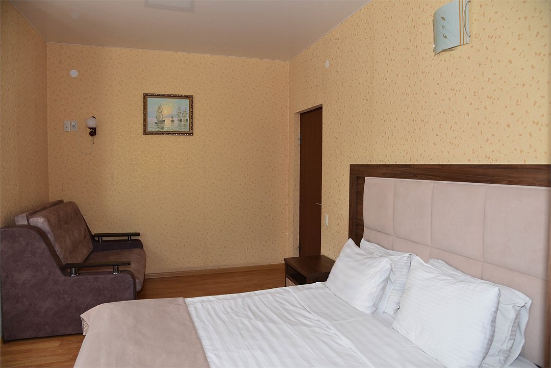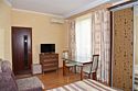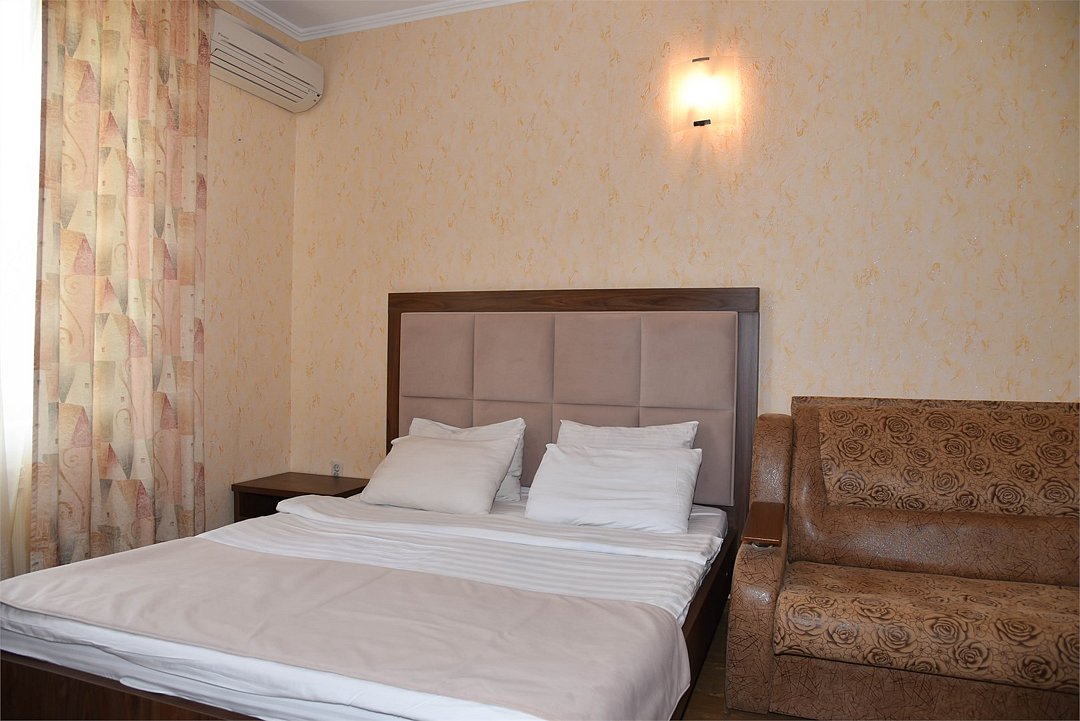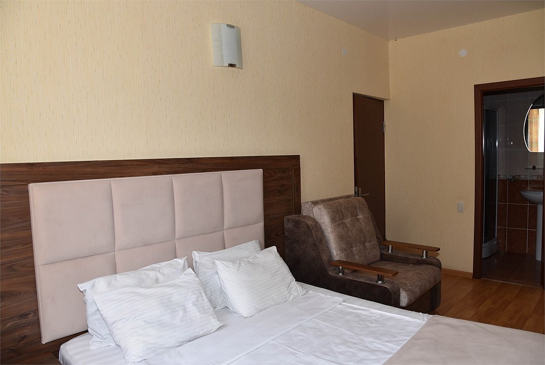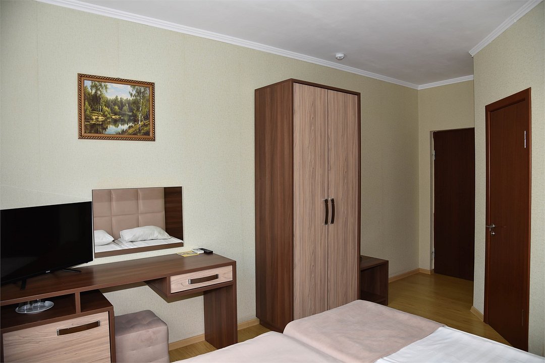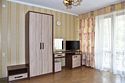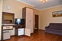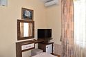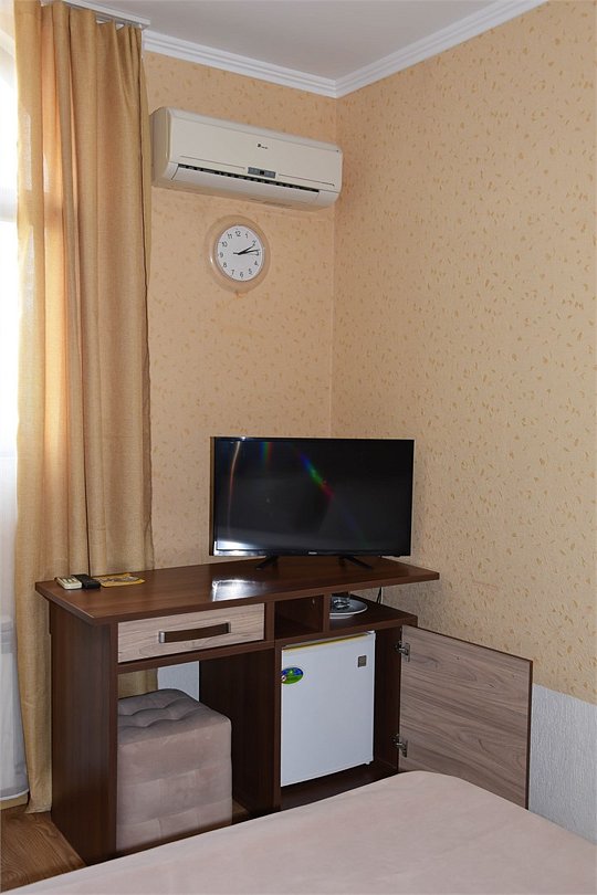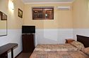 Двухместный номер с двуспальной кроватью. В номере телевизор, мини-холодильник, кондиционер, шкаф, тумбочки,журнальный столик. Санузел в номере(душ). Без балкона.Трехместный номер "Полу-цоколь"