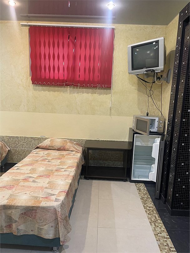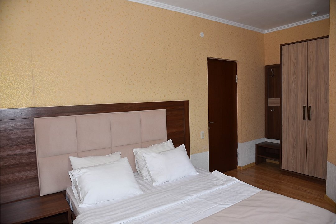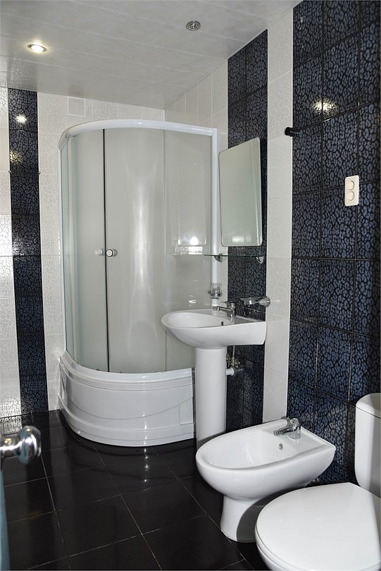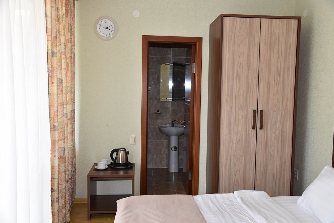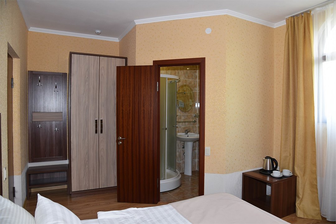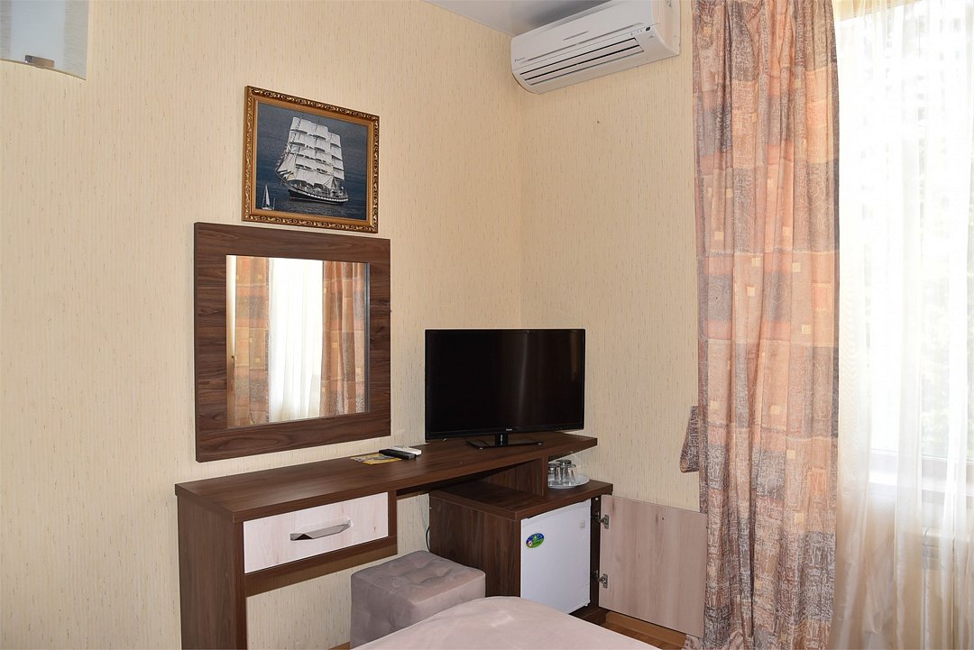 Двухместный номер с двуспальной кроватью. В номере телевизор, мини-холодильник, кондиционер, шкаф, тумбочки,журнальный столик. Санузел в номере(душ). Без балкона.Трехместный номер "Полу-цоколь"