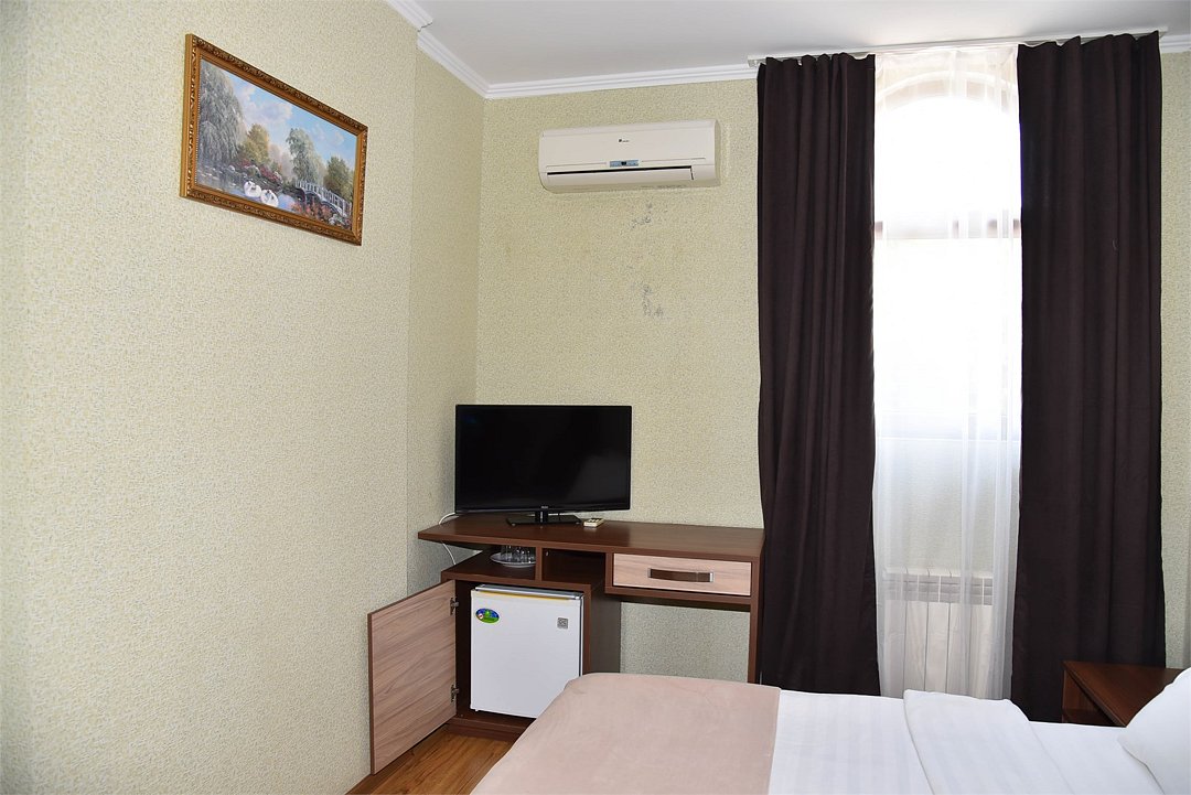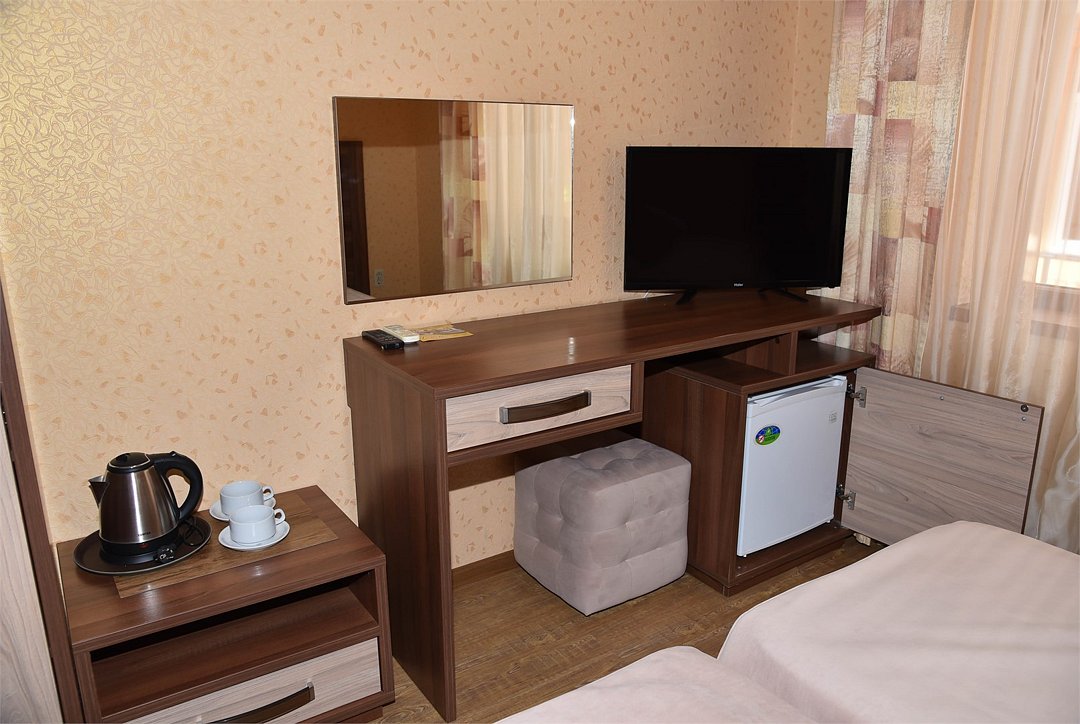В номере санузел, кондиционер, телевизор, мини холодильник, чайник