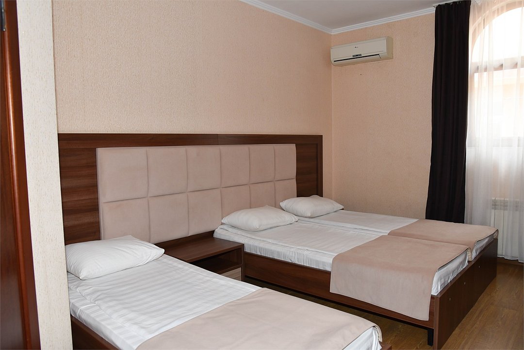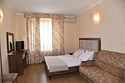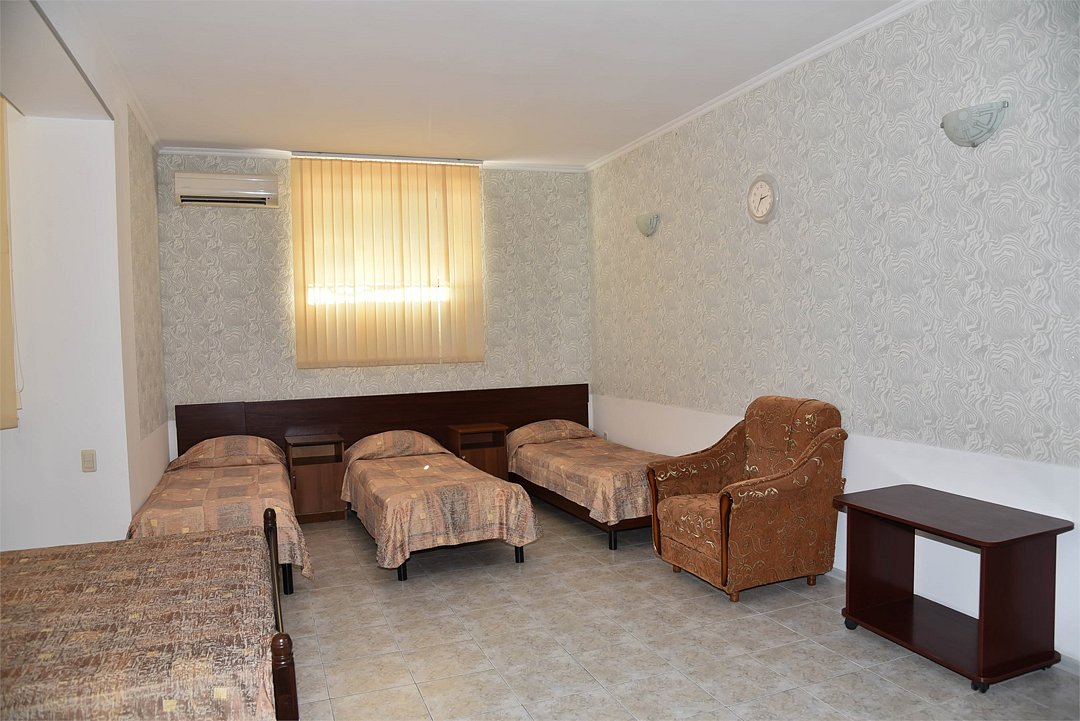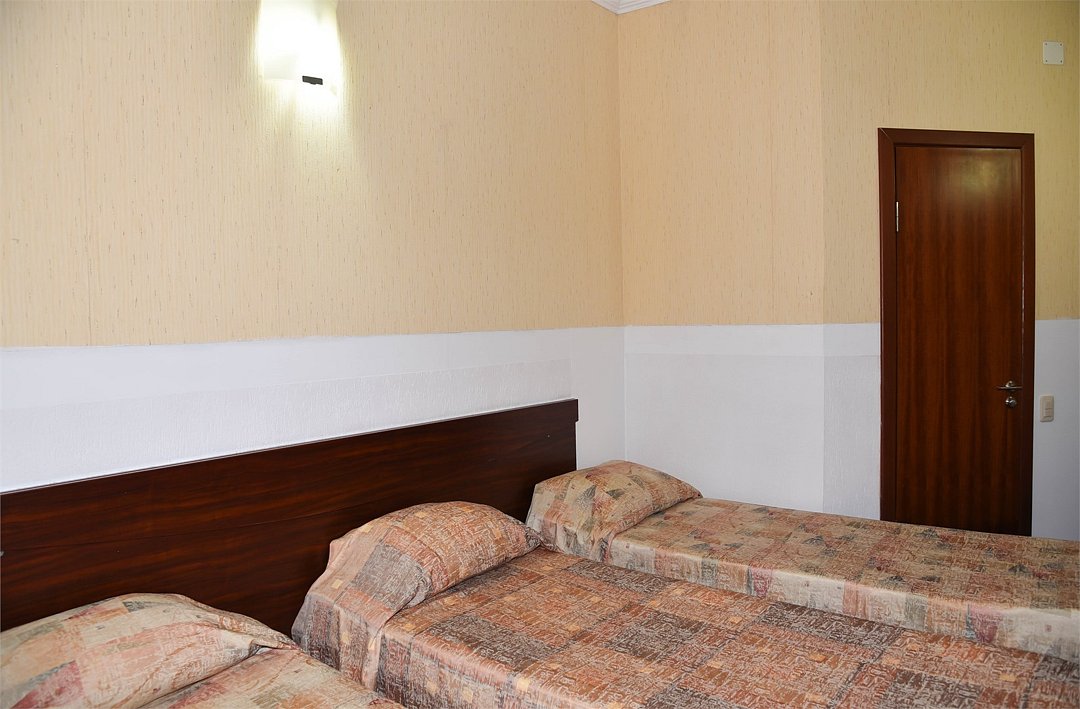 Трехместный номер с двуспальной кроватью и раскладным креслом. В номере телевизор,мини-холодильник, кондиционер,шкаф, тумбочки,журнальный столик. В номере санузел ( душ).Трехместный номер с 3 кроватями