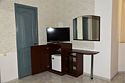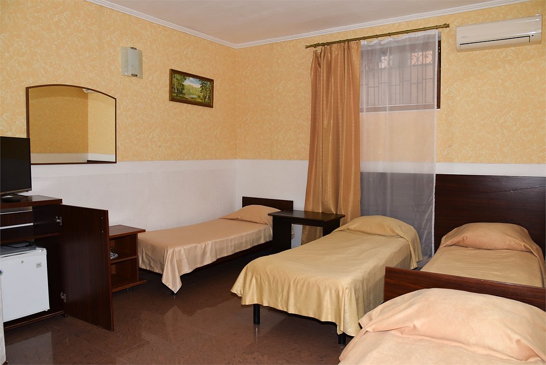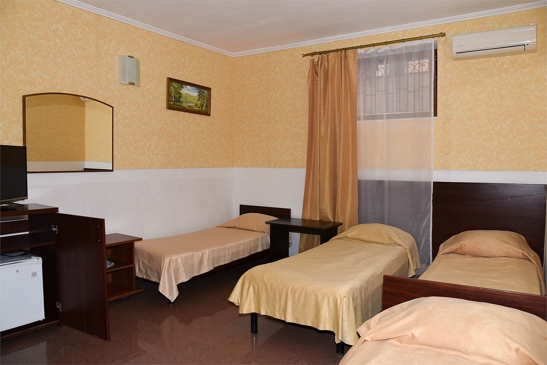 В номере три односпальные кровати,телевизор, мини-холодильник,кондиционер, шкаф,тумбочки,журнальный столик. Санузел в номере(душ).Трехместный номер с креслом