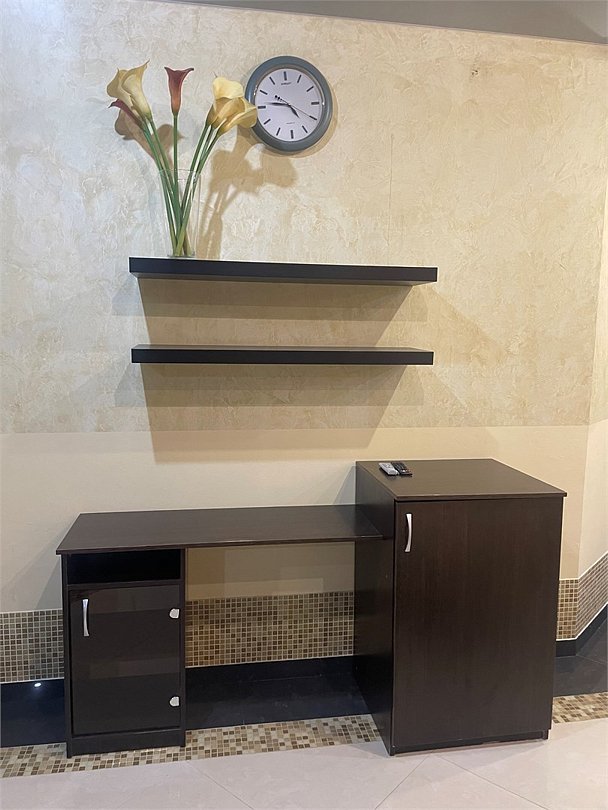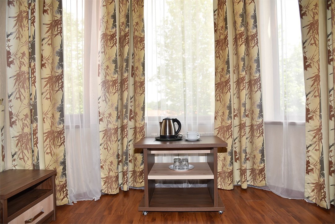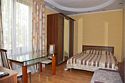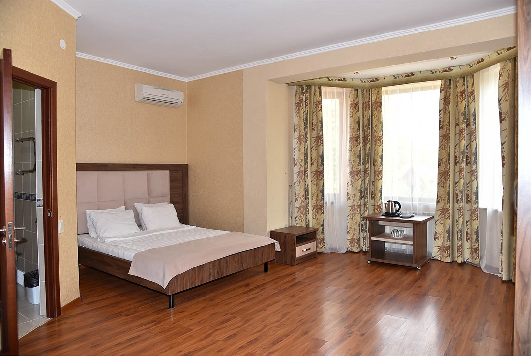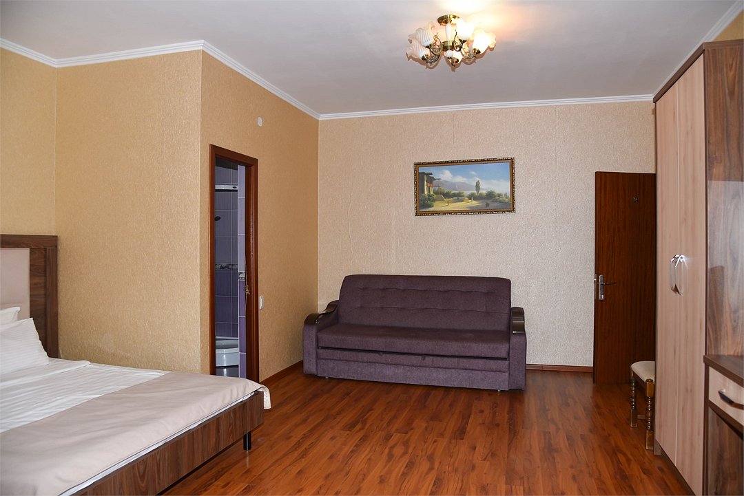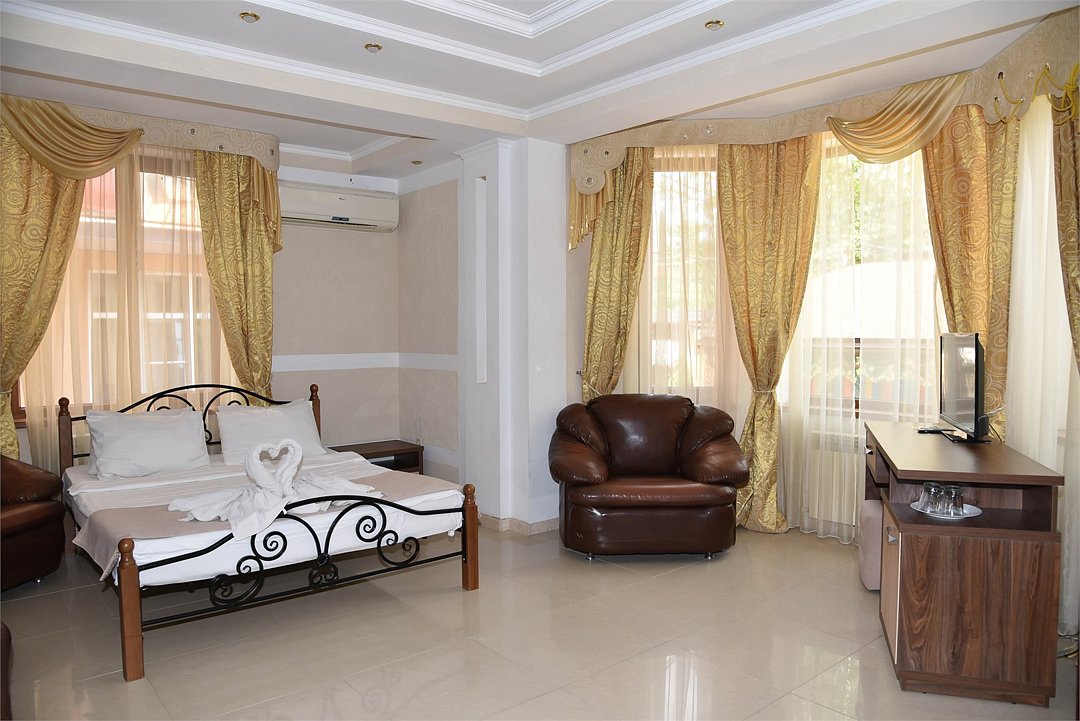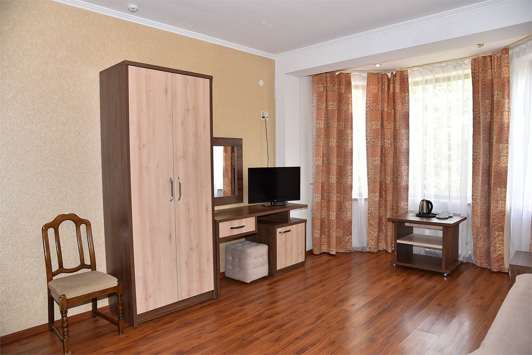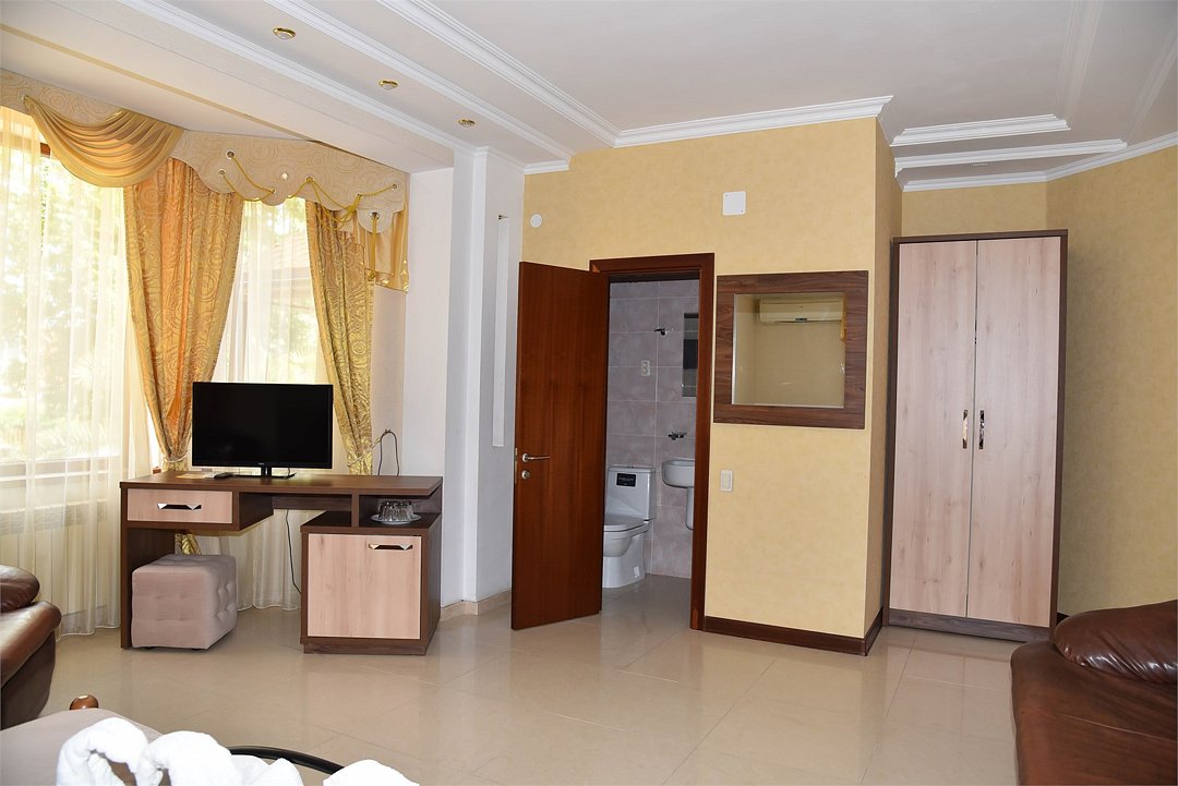 В номере двуспальная кровать, три односпальных кровати,телевизор, мини-холодильник,кондиционер, шкаф, журнальный столик,санузел в номере( душ).Двухкомнатный номер с мини-кухней