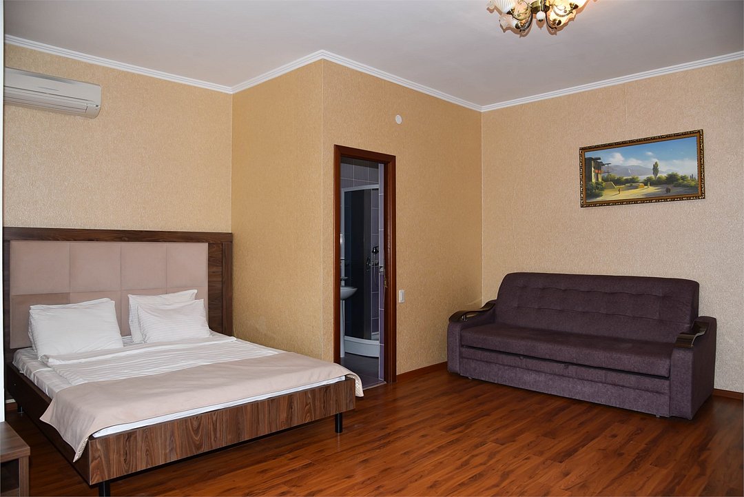 Двуспальная кровать, большой диван, телевизор, мини-холодильник, кондиционер, с/у, душ