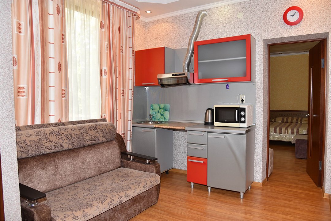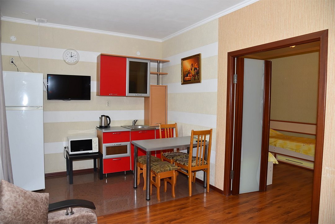 В номере двуспальная кровать, разборное кресло, диван, телевизор,холодильник, кондиционер, шкаф, журнальный столик,микроволновка, чайник, санузел в номере( душ)Трехкомнатные апартаменты с кухней