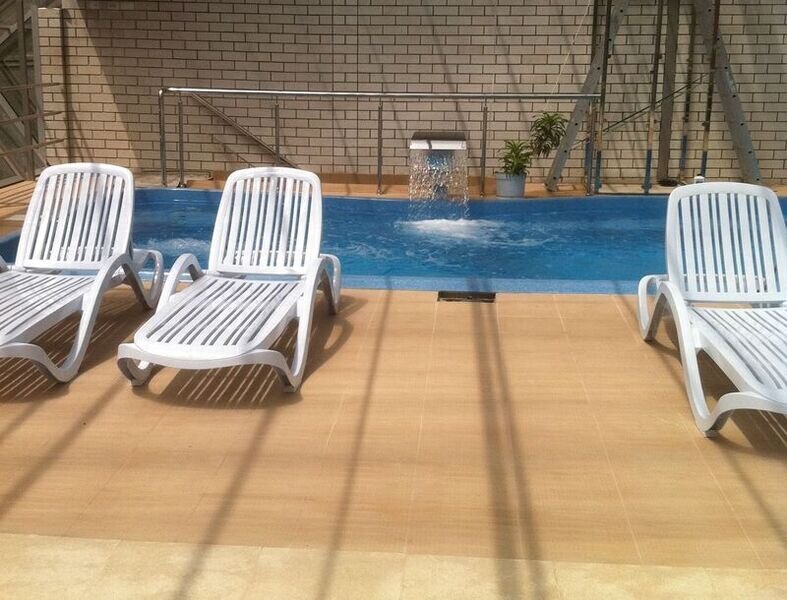 Вокруг бассейна расставлены удобные шезлонги, где можно расслабиться, понежиться на солнышке и насладиться мягким загаром, вдыхая целебный морской воздух под плеск освежающей воды.