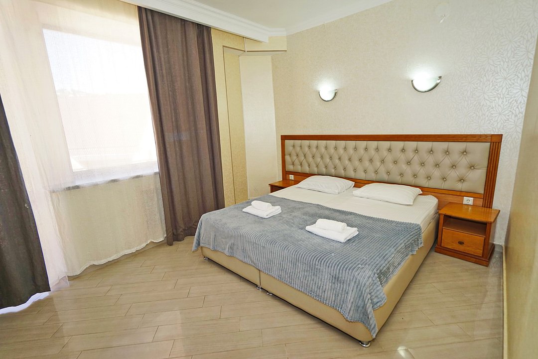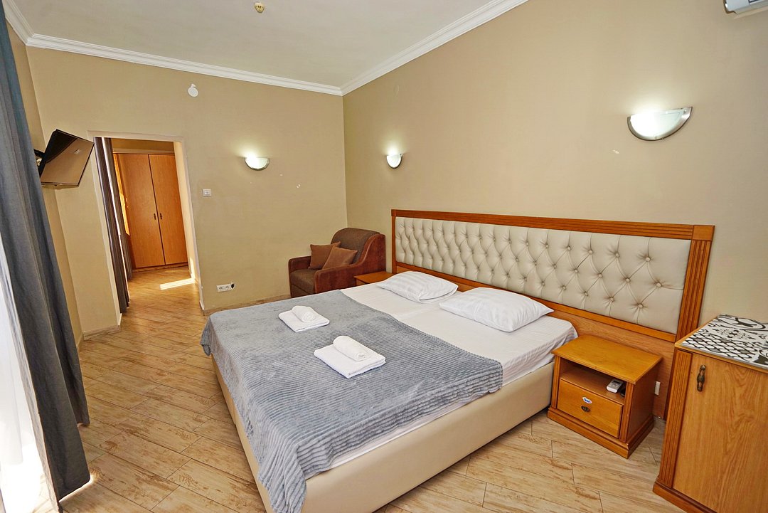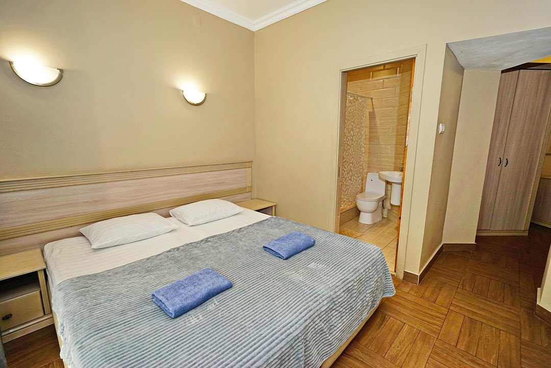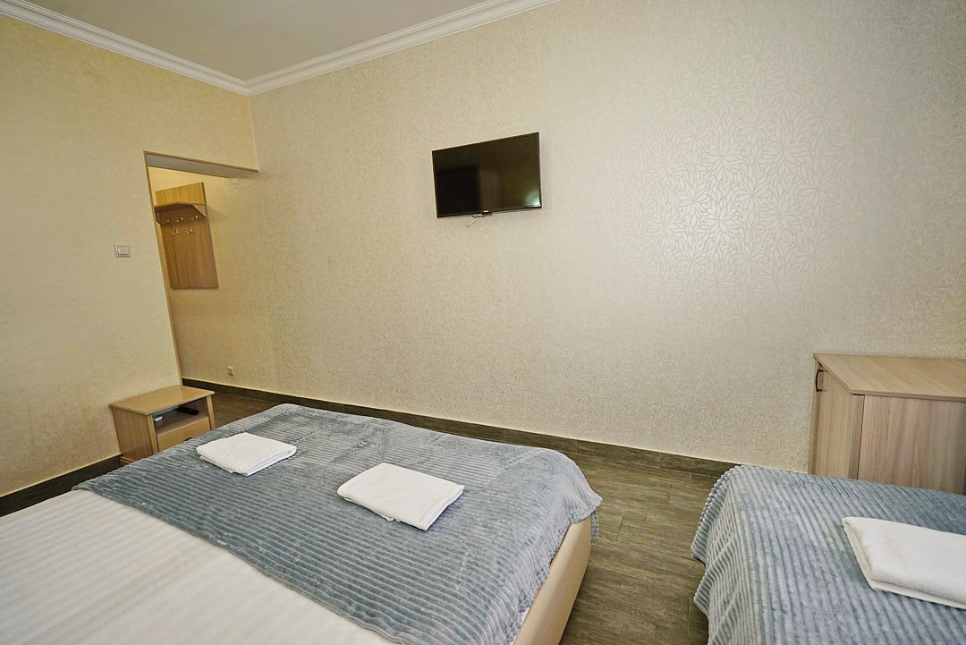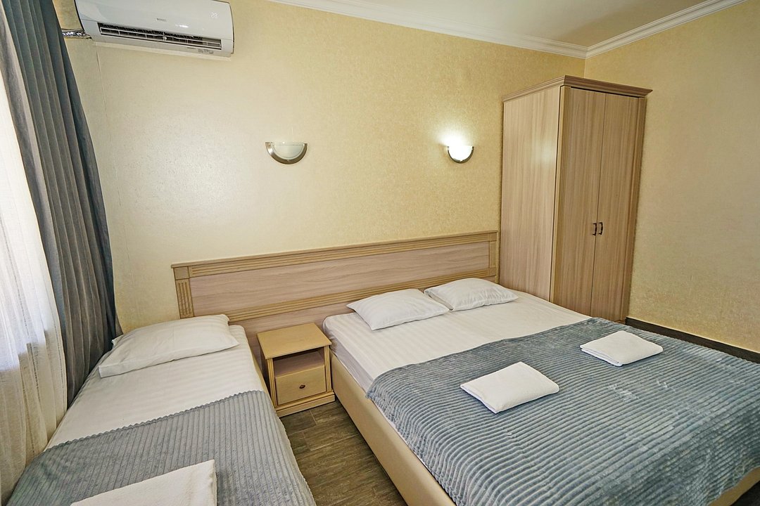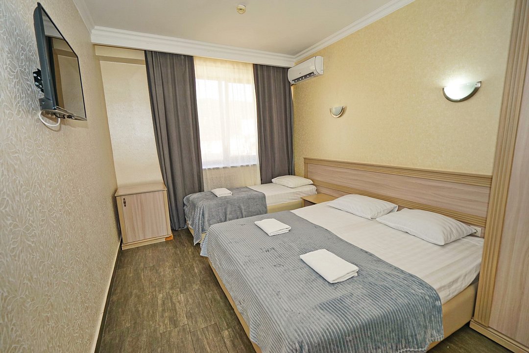 Комфортные номера со всей необходимой техникой. Прикроватные тумбы, стол, стулья, шкаф, вешалки, зеркало, постельное белье, полотенца, фен, телевизор, чайник, интернет, кабельное, кондиционер, холодильник, санузел совмещенный.