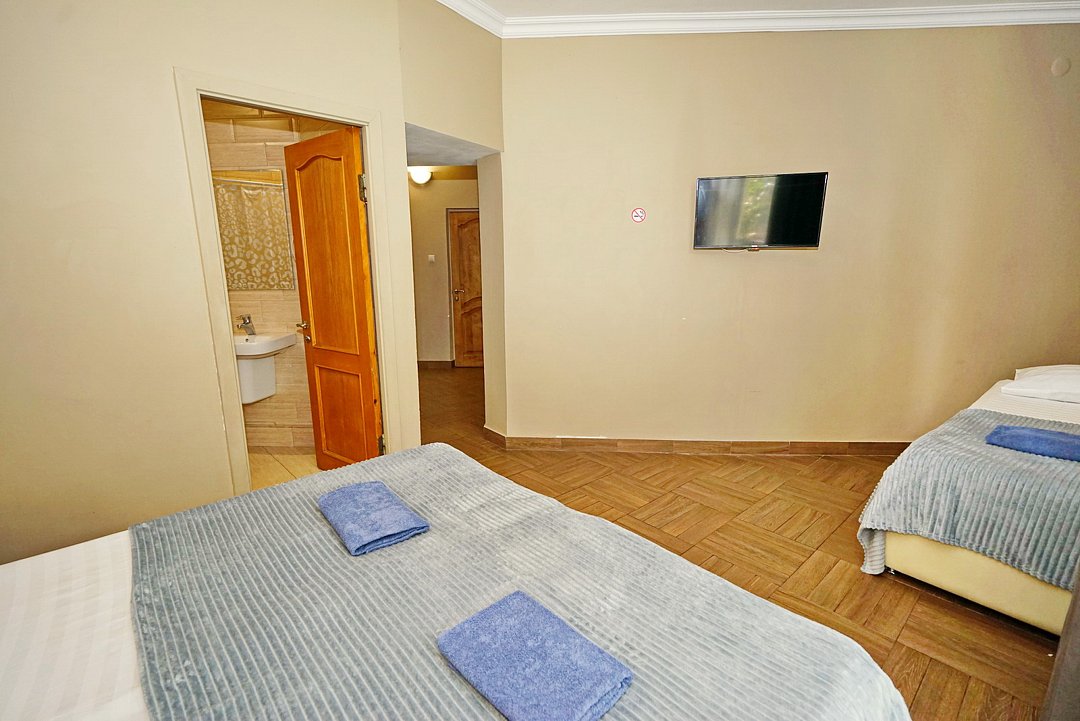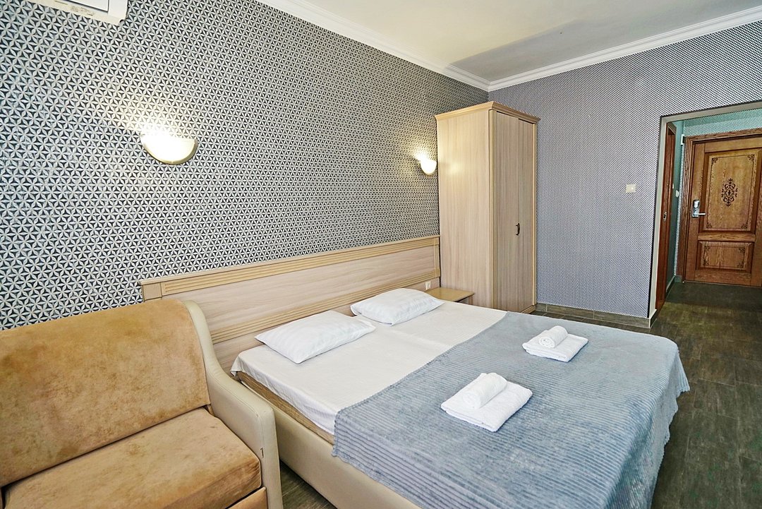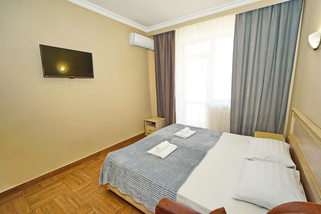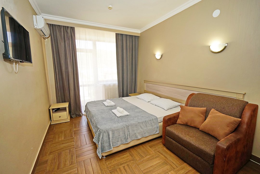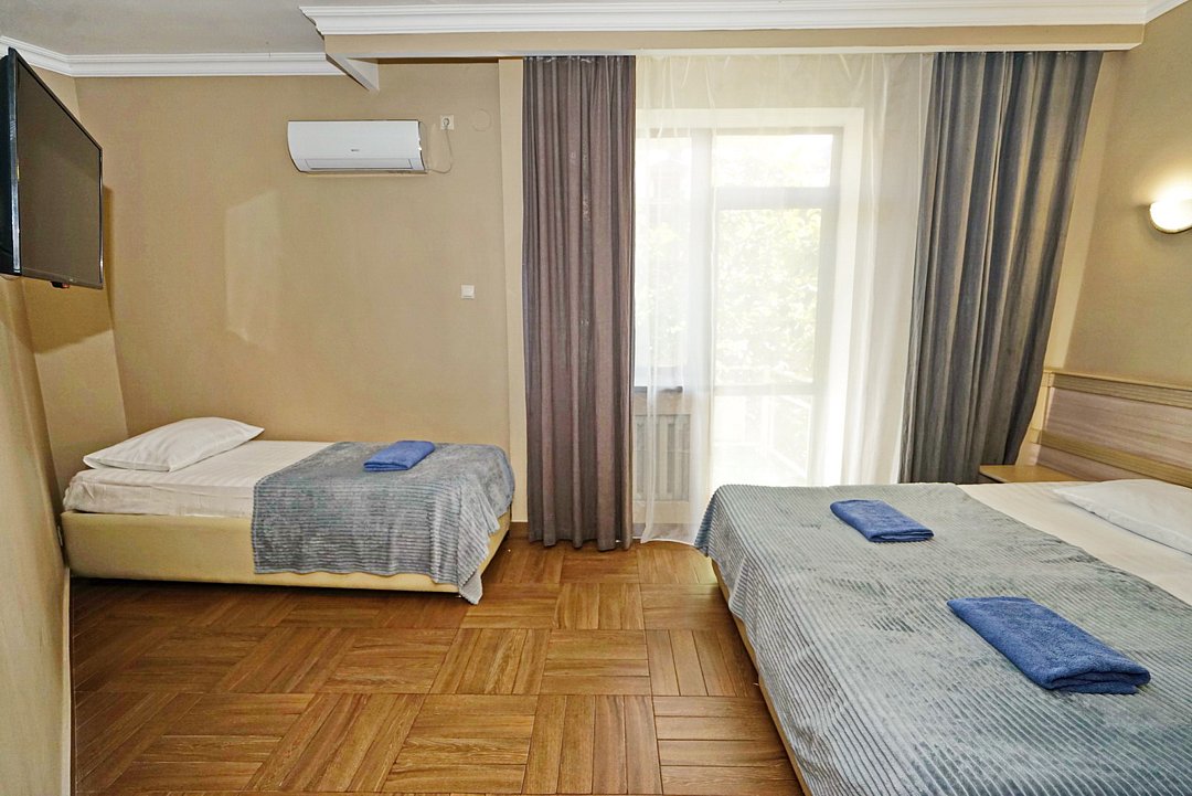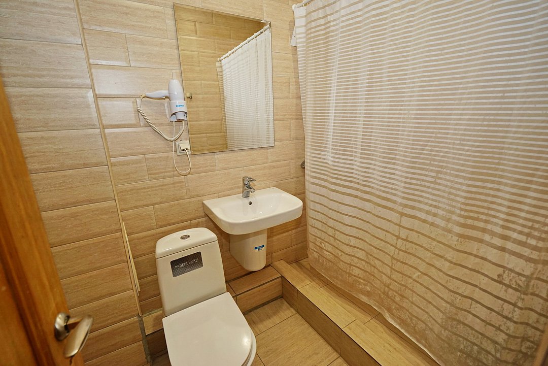Комфортные номера со всей необходимой техникой. Прикроватные тумбы, стол, стулья, шкаф, вешалки, зеркало, постельное белье, полотенца, фен, телевизор, чайник, интернет, кабельное, кондиционер, холодильник, санузел совмещенный.