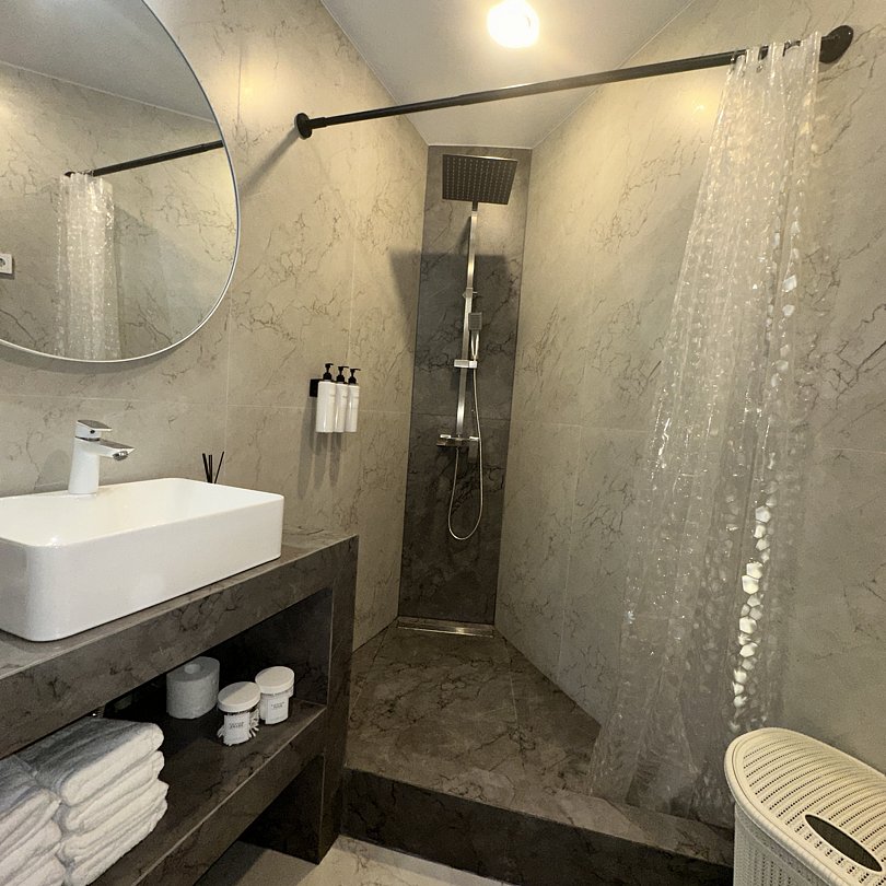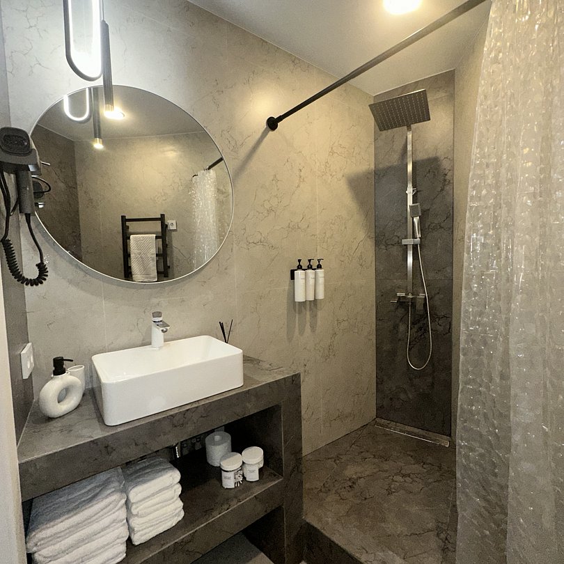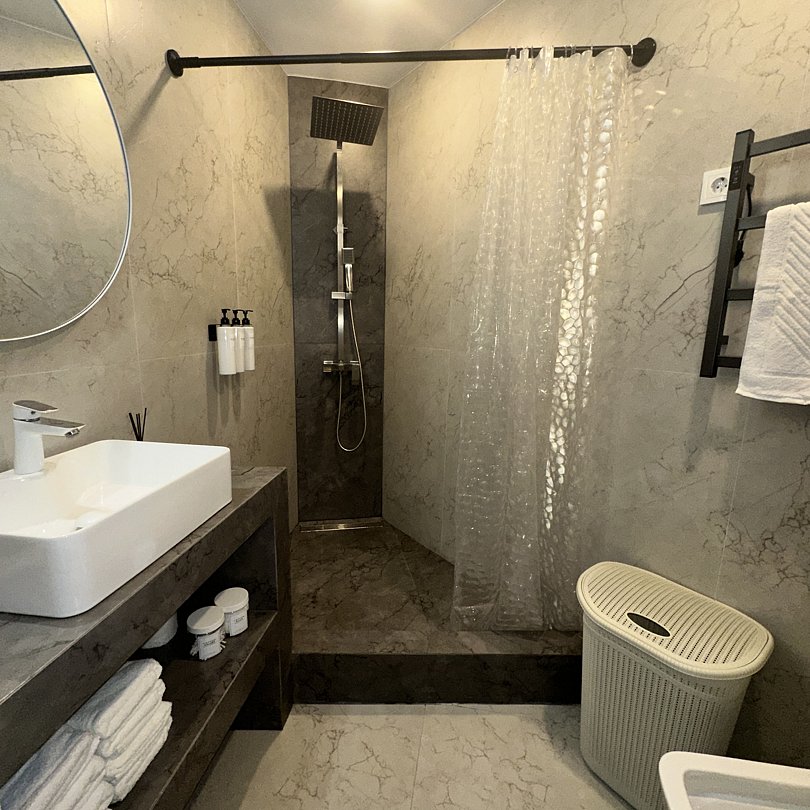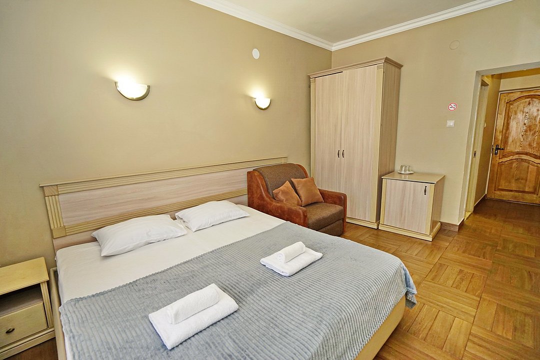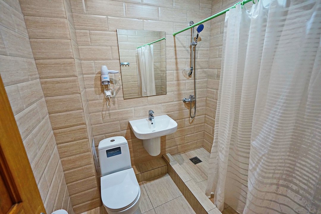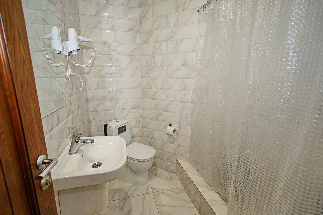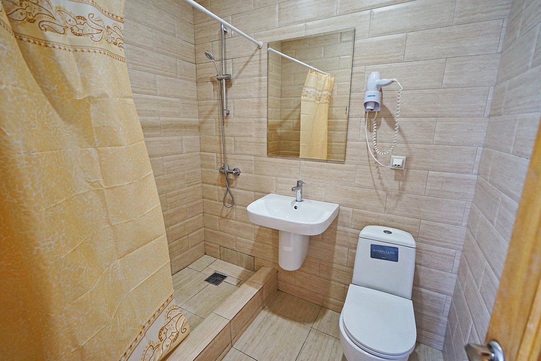Комфортные номера со всей необходимой техникой. Прикроватные тумбы, стол, стулья, шкаф, вешалки, зеркало, постельное белье, полотенца, фен, телевизор, чайник, интернет, кабельное, кондиционер, холодильник, санузел совмещенный.