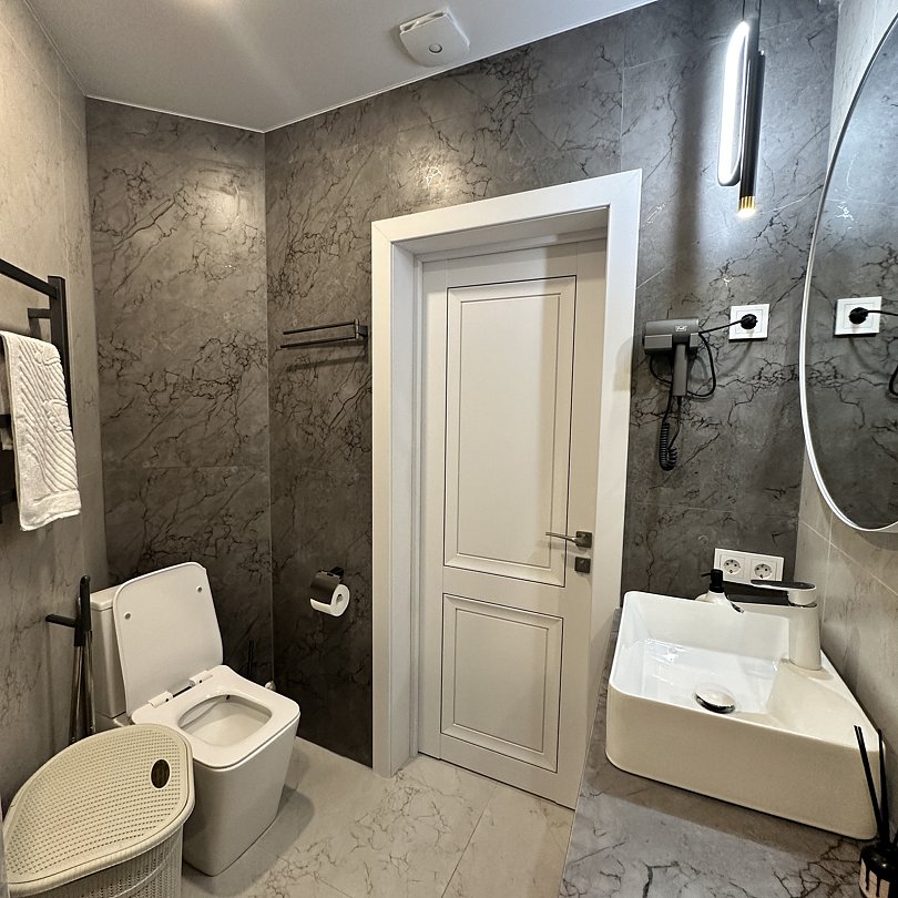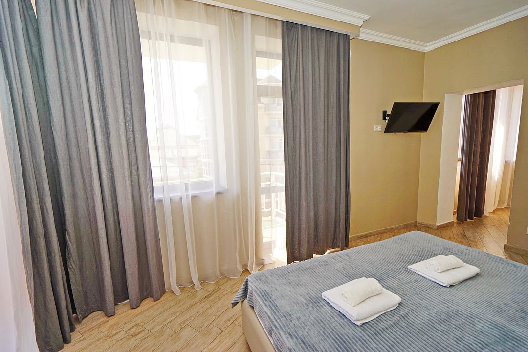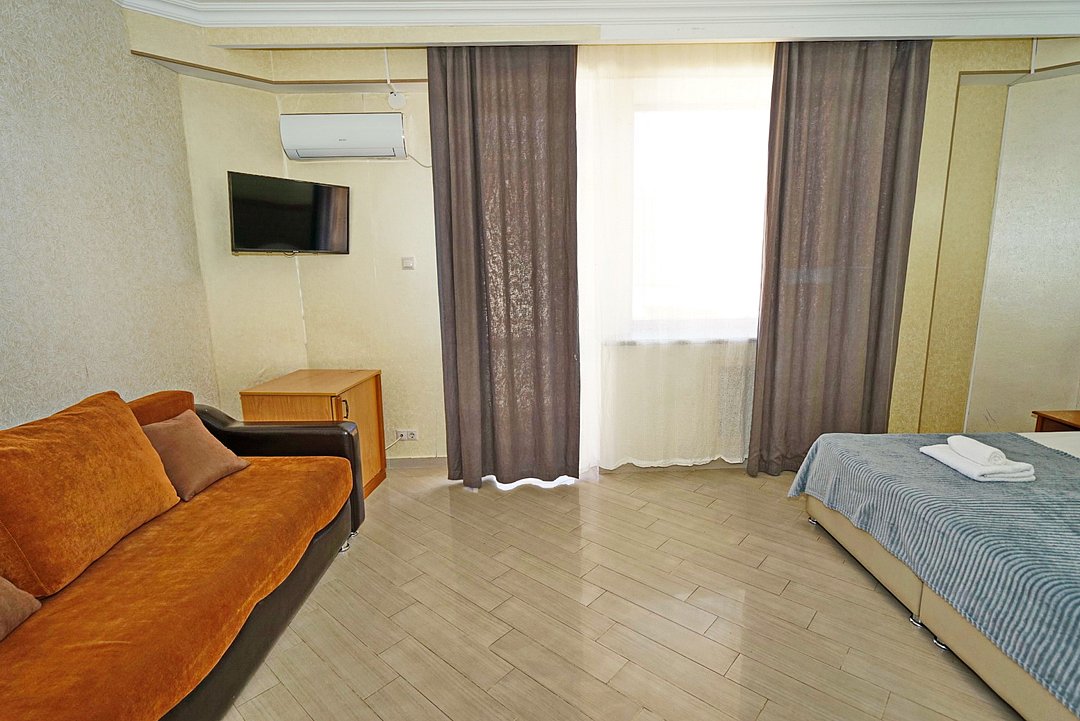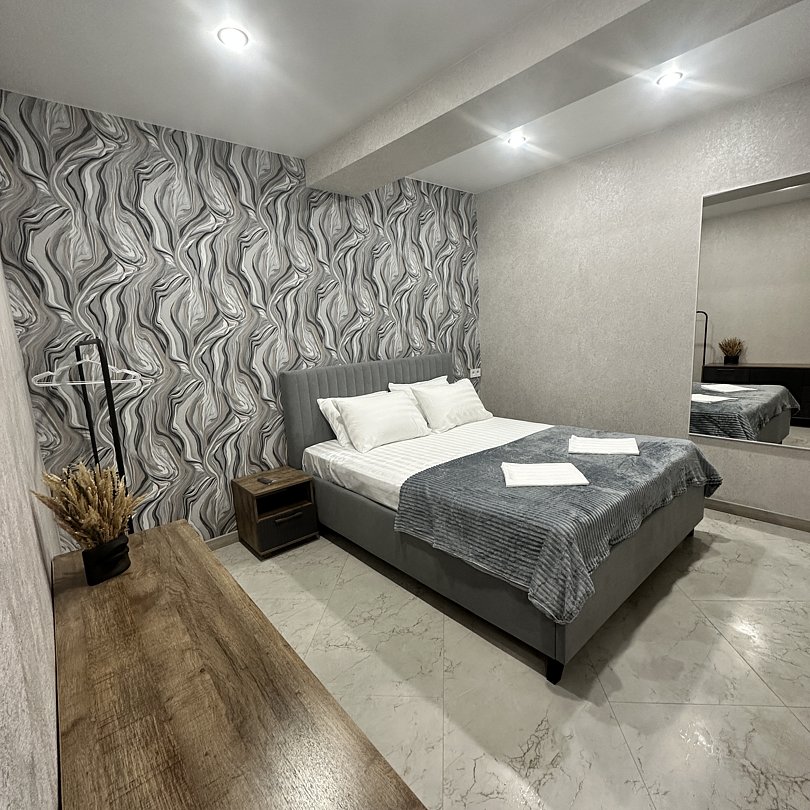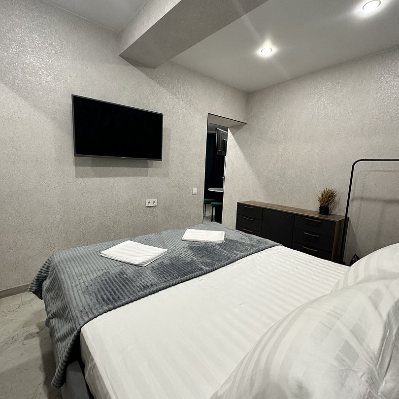Люксовые апартаменты с дизайнерским ремонтом по типу полноценной квартиры. Номер оснащен прикроватными тумбами, комодом, шкафом для вещей, обеденной зоной и кухней с необходимой посудой.