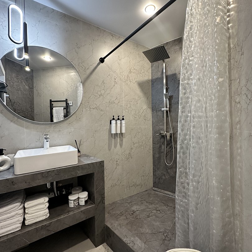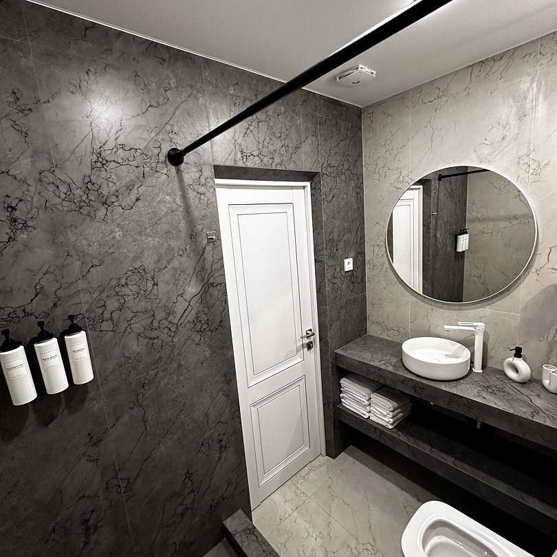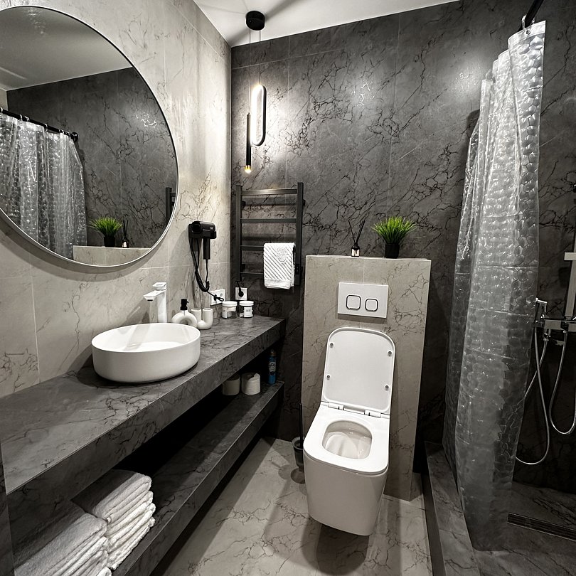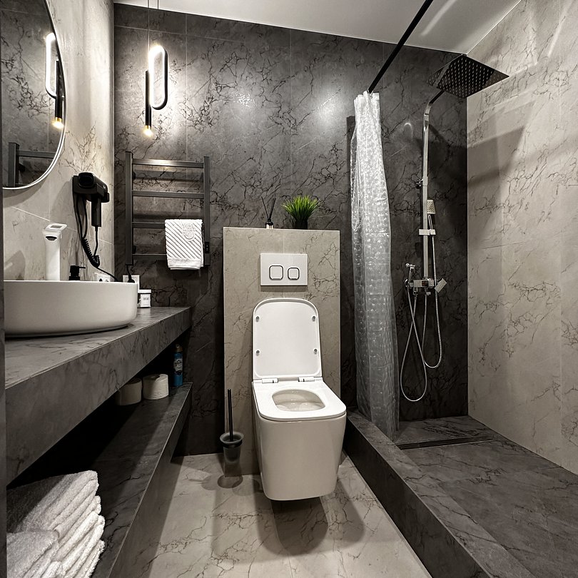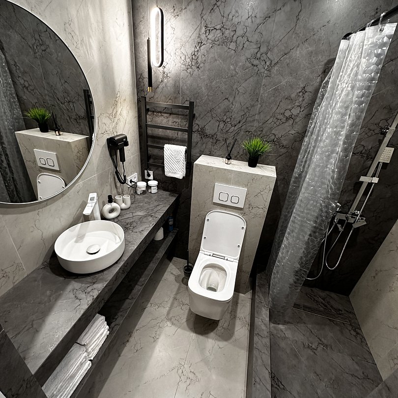 Люксовые апартаменты с дизайнерским ремонтом по типу полноценной квартиры. Номер оснащен прикроватными тумбами, комодом, шкафом для вещей, обеденной зоной и кухней с необходимой посудой.