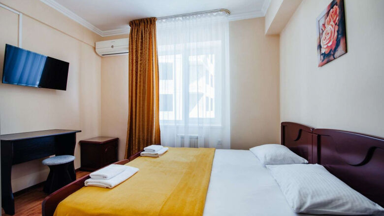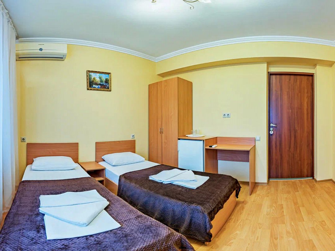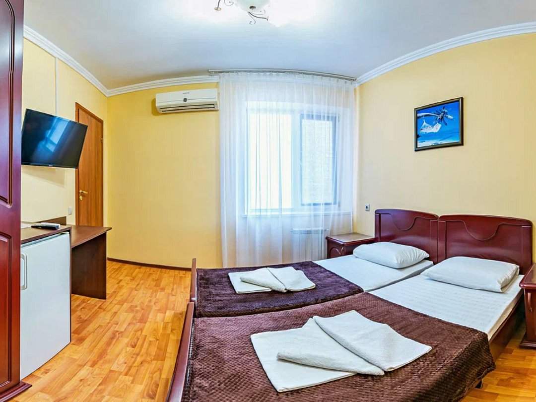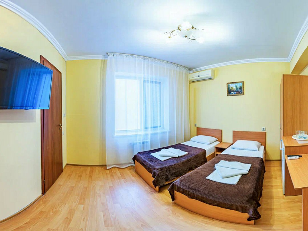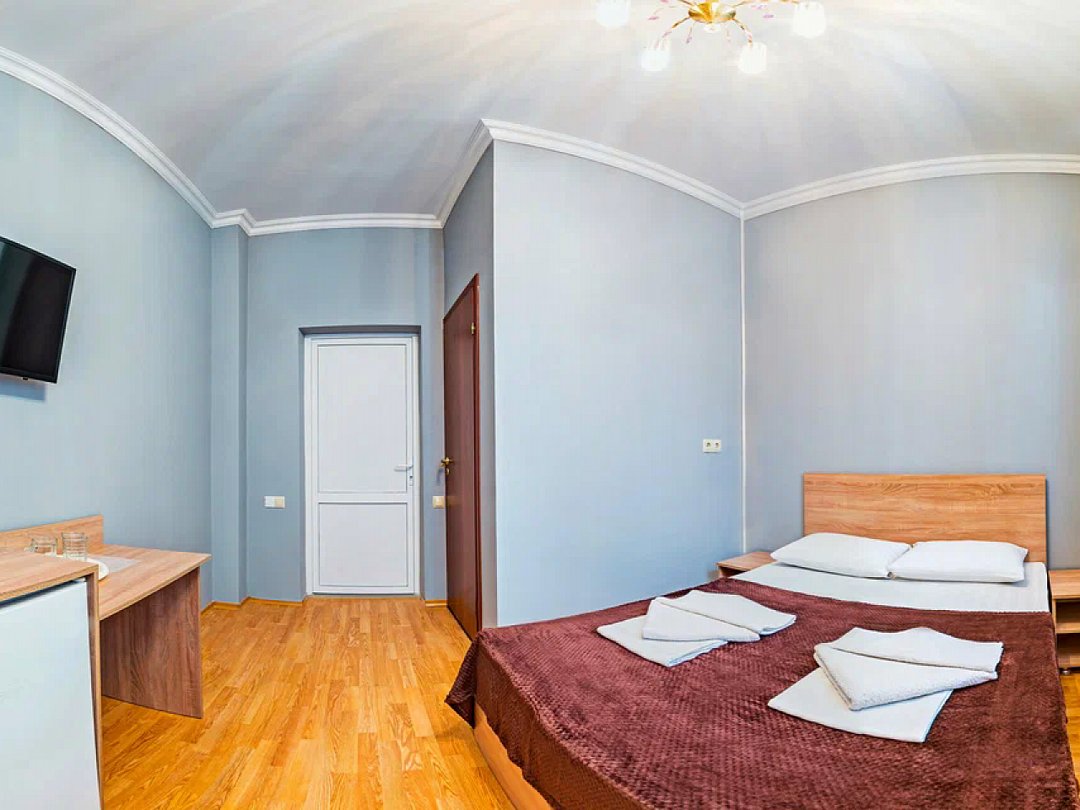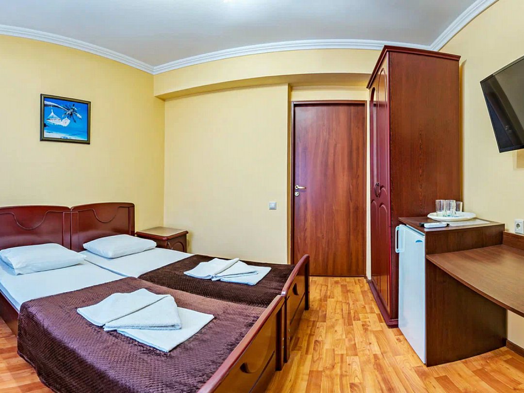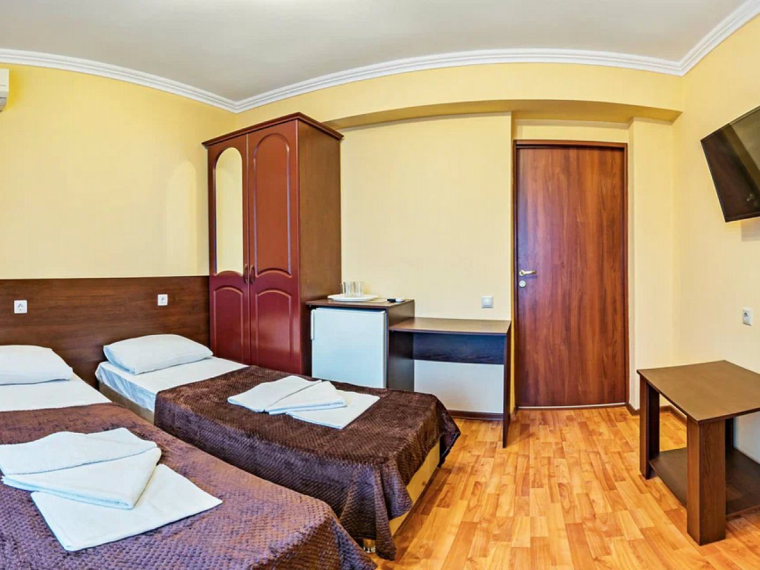 Номер оборудован всем необходимым для комфортного проживания: телевизор, сплит-система, двуспальная кровать или две односпальных кровати, прикроватная тумбочка, шкаф, мини-холодильник, журнальный столик, WI-FI. В номере имеется собственная ванная комната.