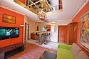 Трехкомнатные апартаменты: кухня, гостиная, две спальни. В первой спальне двуспальная кровать, телевизор. Во второй спальне двуспальная и двухярусная кровати. Большая ванная комната. Туалет отдельно от ванной. На кухне вся необходимая посуда и бытовая техника, в гостиной – большой раскладной диван.