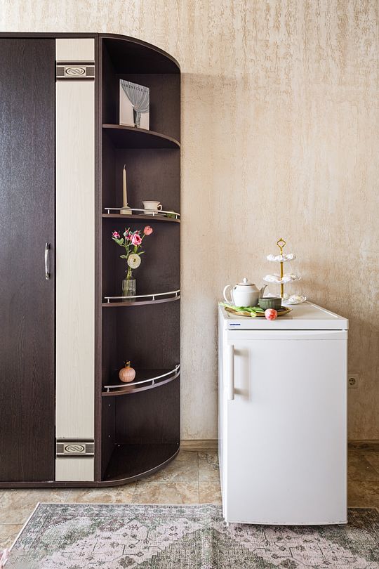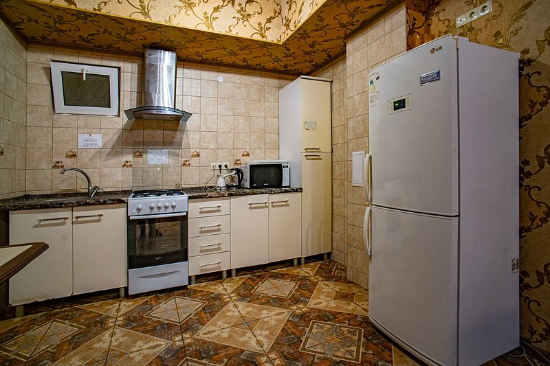 Общая кухня оборудована необходимой техникой. В вашем распоряжении плита, холодильник, микроволновая печь и электрический чайник.