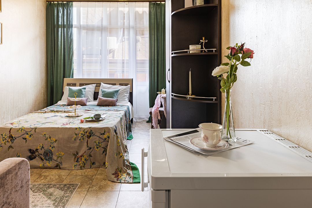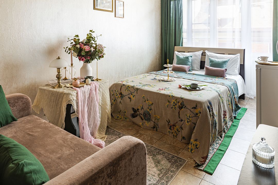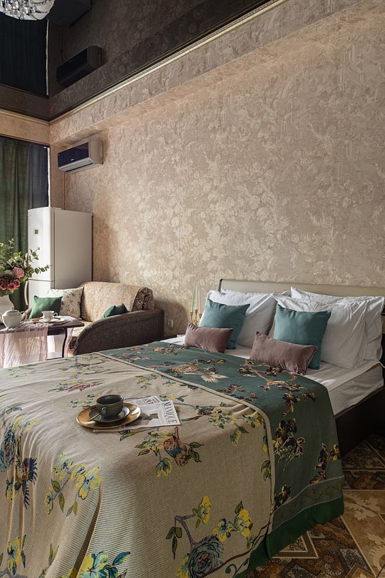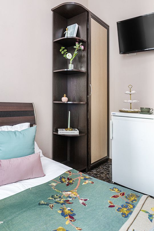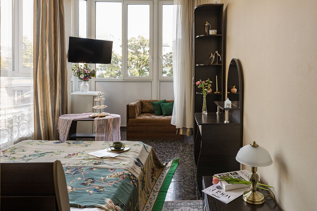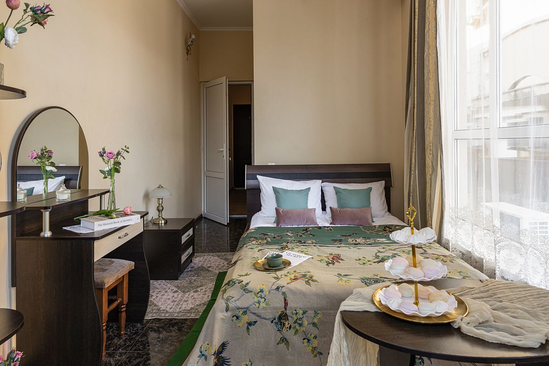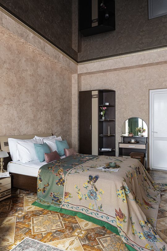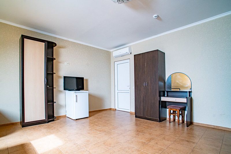 В номере имеется: диван раскладной двуспальный, две прикроватные тумбочки, платяной шкаф/вешалка, телевизор, холодильник, журнальный столик, туалетный столик с зеркалом, кондиционер.
