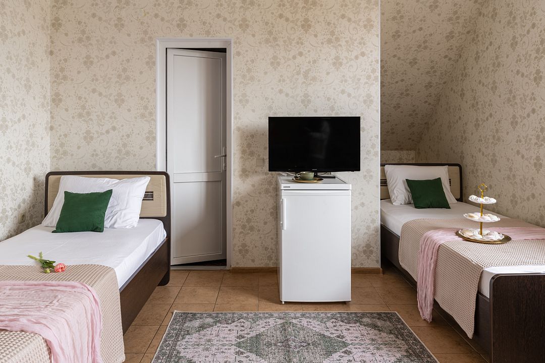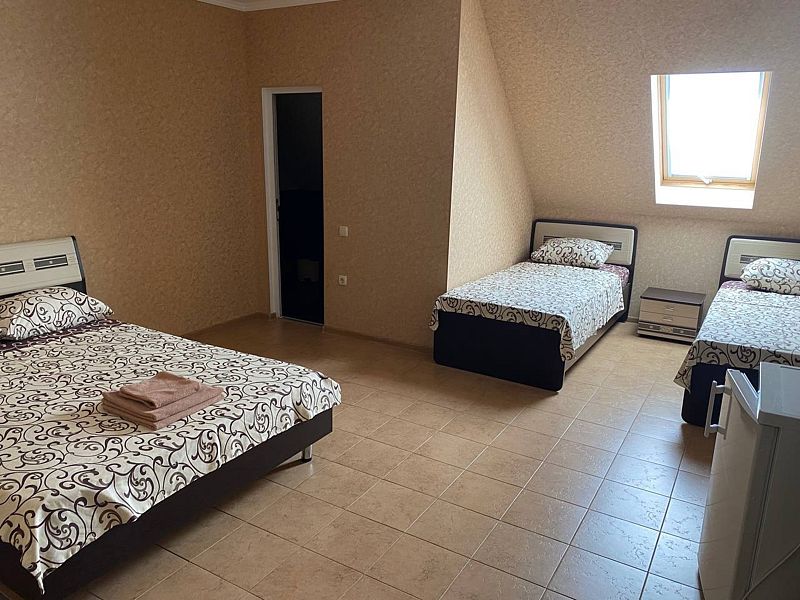 Номер оснащен: двуспальная кровать и две кровати-полуторки, прикроватные тумбочки, шкаф-вешалка, журнальный стол, зеркало, холодильник, кондиционер, телевизор, WI-Fi.