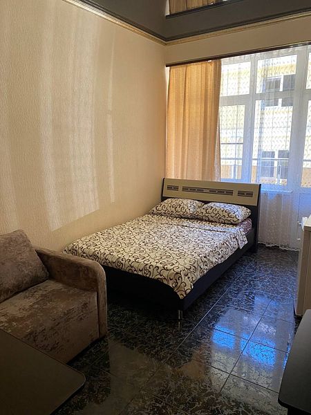 Просторный однокомнатный номер с двуспальной кроватью и ванной комнатой.