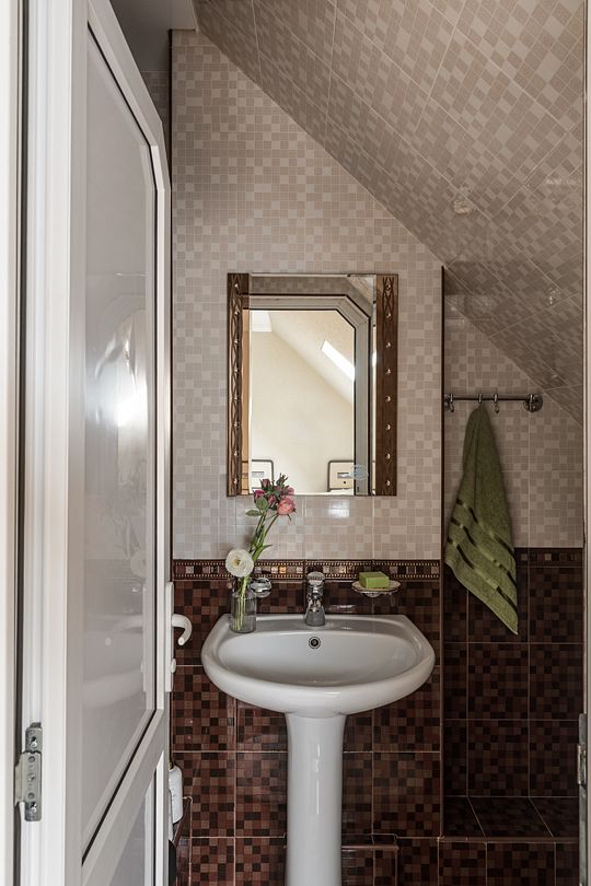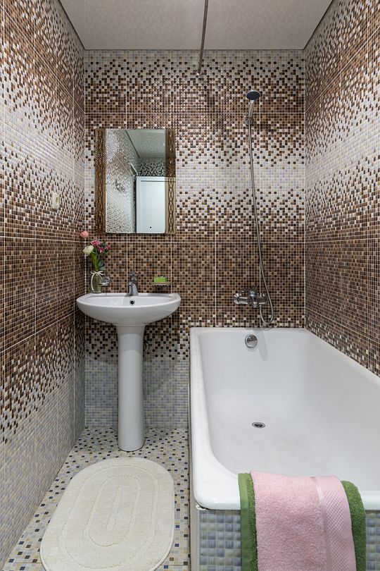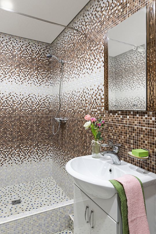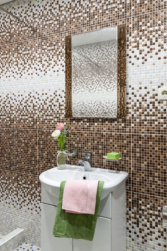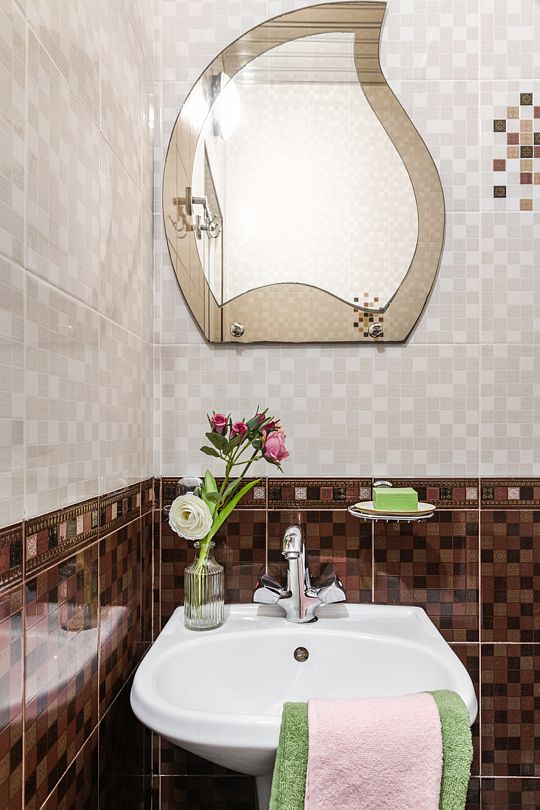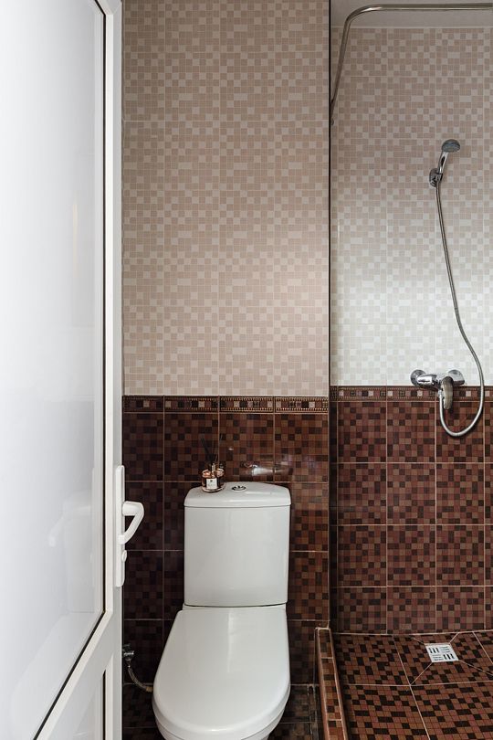 Ванная комната: санузел, душевая кабина, раковина, зеркало.