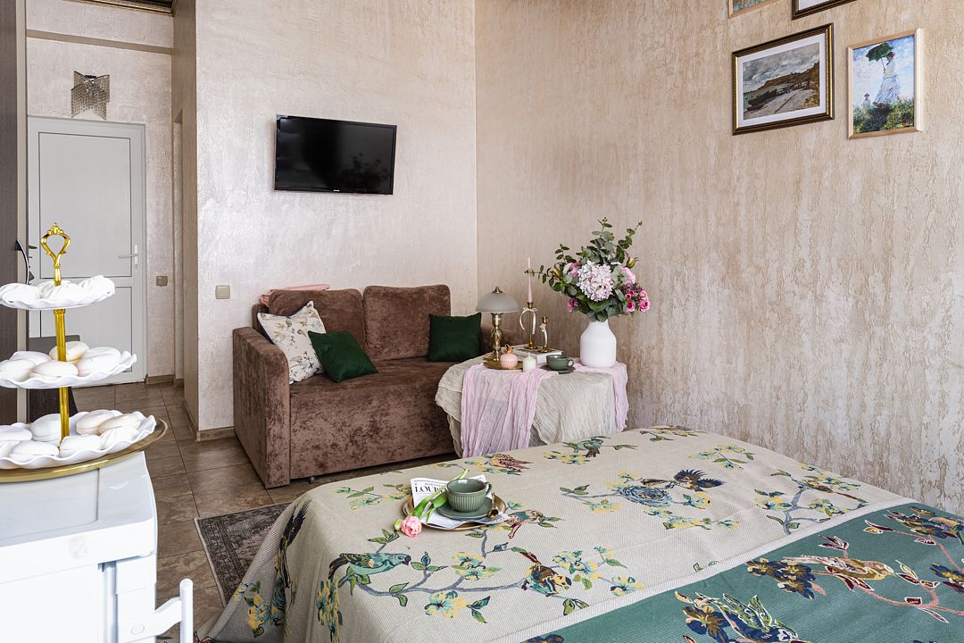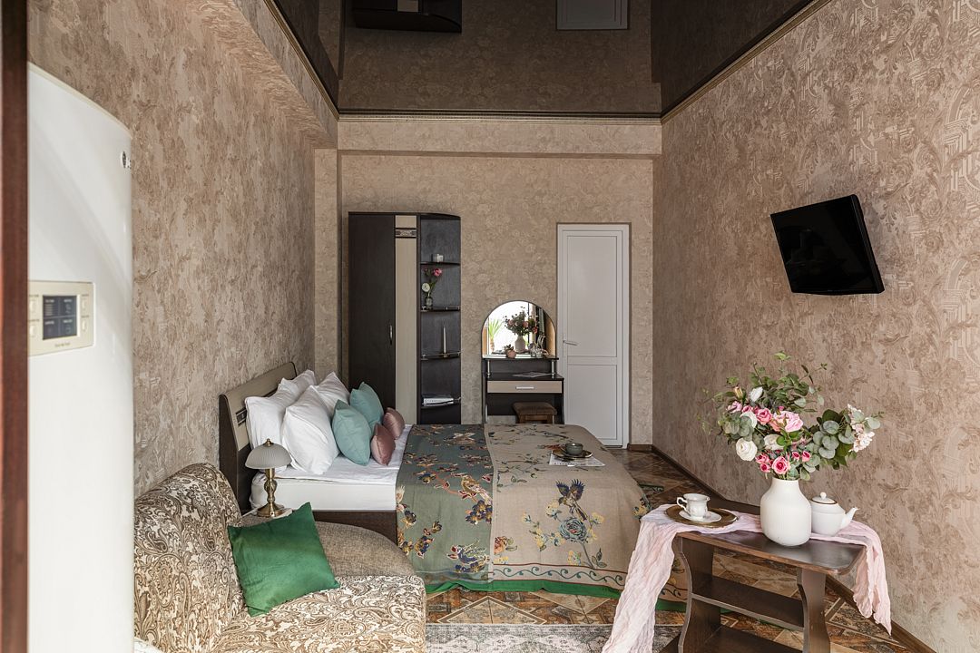 Номер оснащен: двуспальная кровать, кресло-кровать, прикроватные тумбочки, шкаф-вешалка, журнальный стол, зеркало, холодильник, кондиционер, телевизор, WI-Fi.