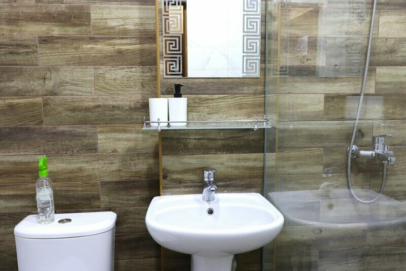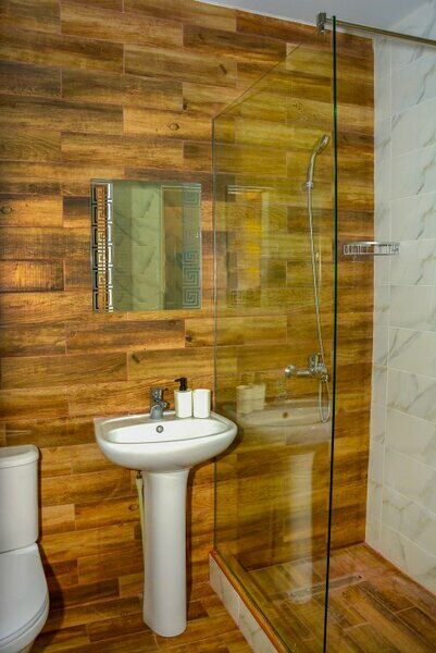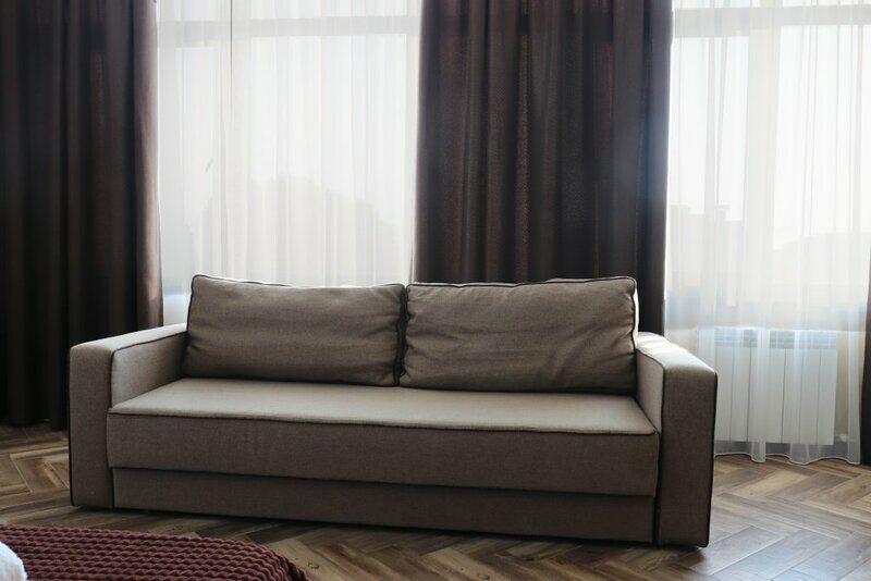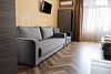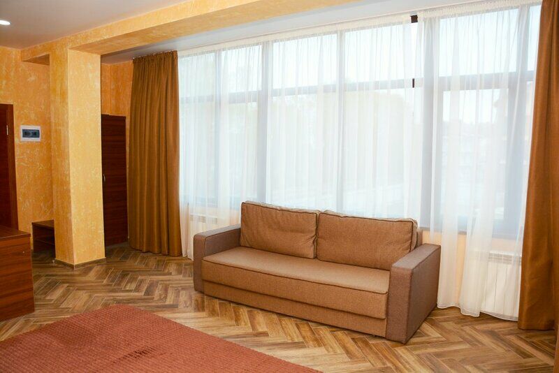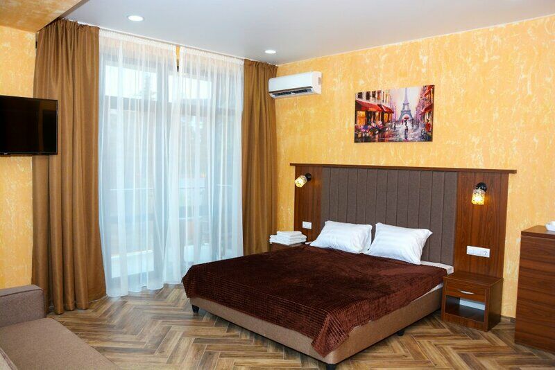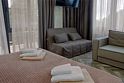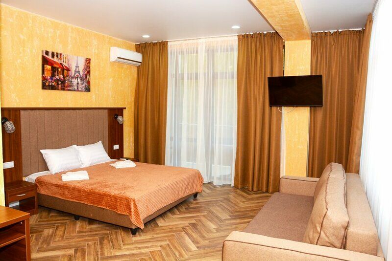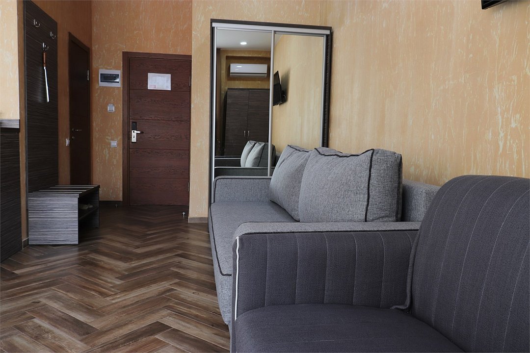 Сплит-система, холодильник, LED телевизор, удобные кровати: двуспальная (основное размещение), двуспальный диван-кровать и раскладная-кровать (дополнительное размещение), прикроватные тумбочки, столик с зеркалом, шкаф. Санузел в номере.
