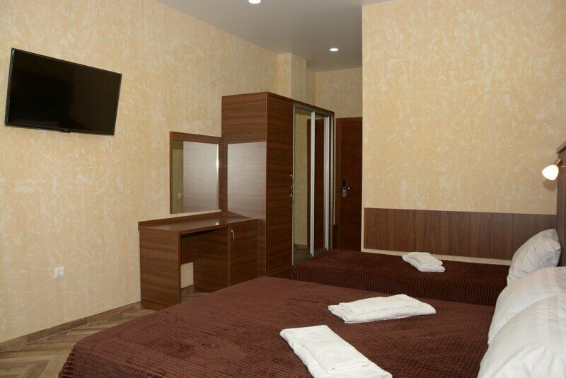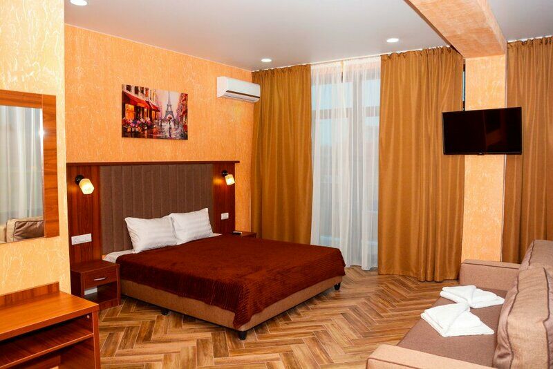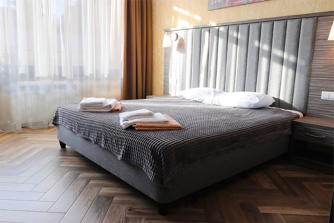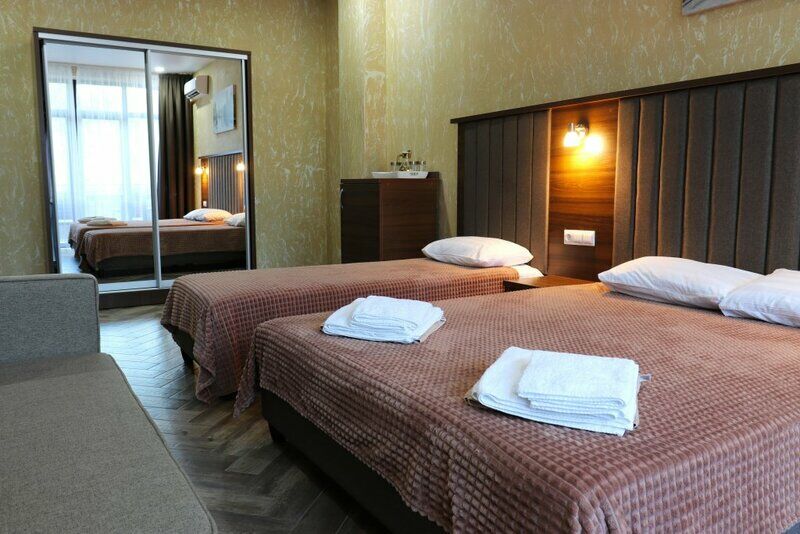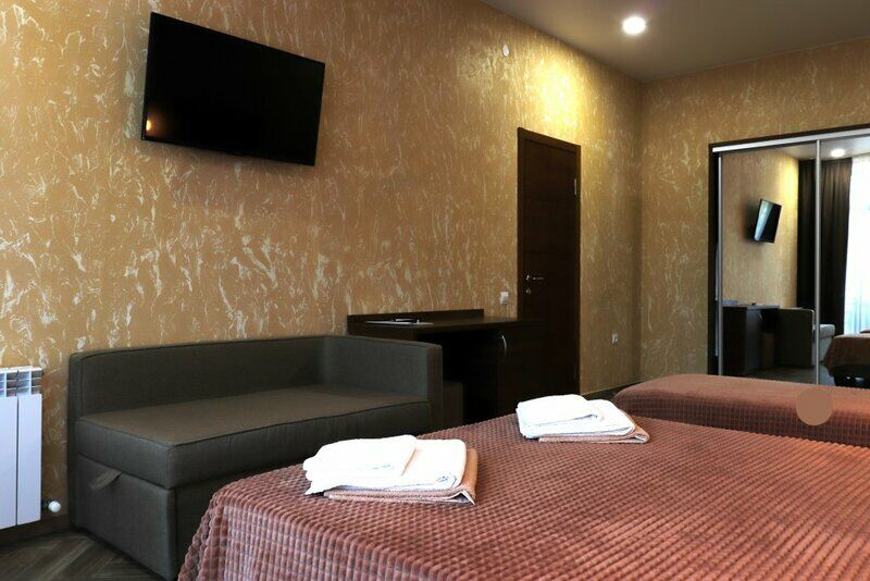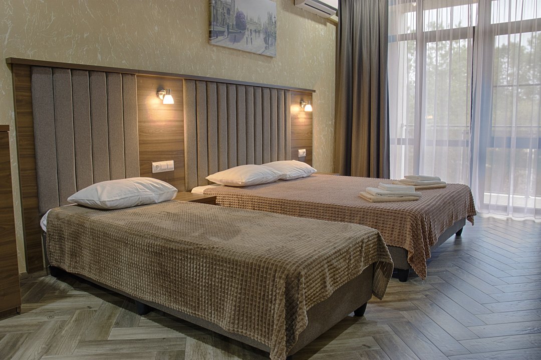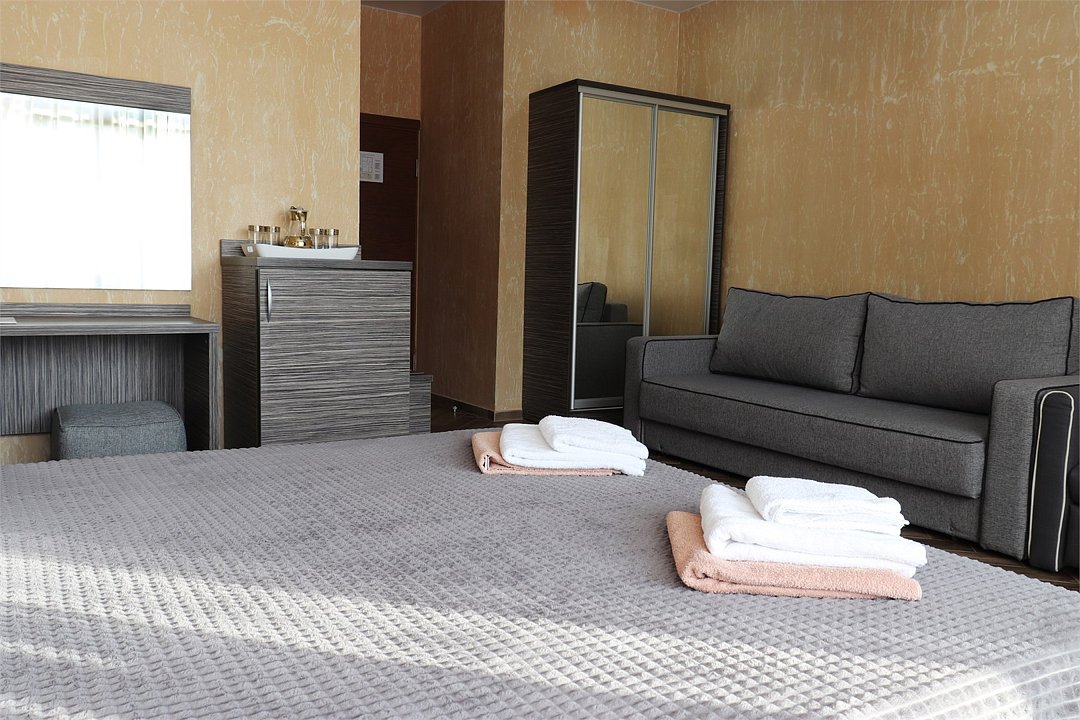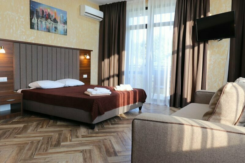 Сплит-система, холодильник, LED телевизор, удобные кровати: двуспальная или две односпальные кровати (основное размещение), диван-кровать (дополнительное размещение), прикроватные тумбочки, вешалка с зеркалом, шкаф. Санузел в номере.