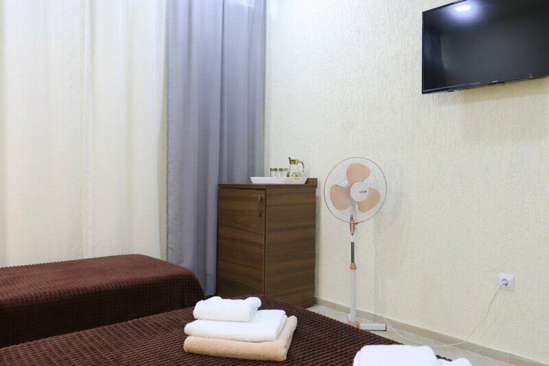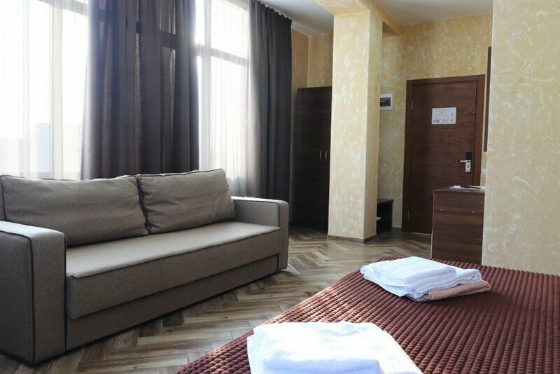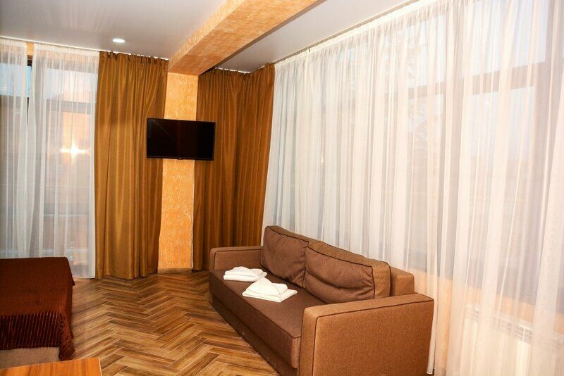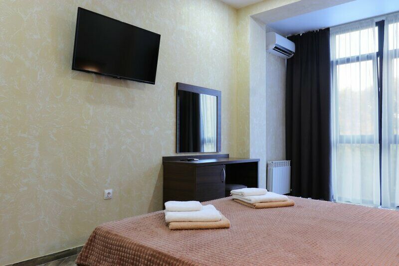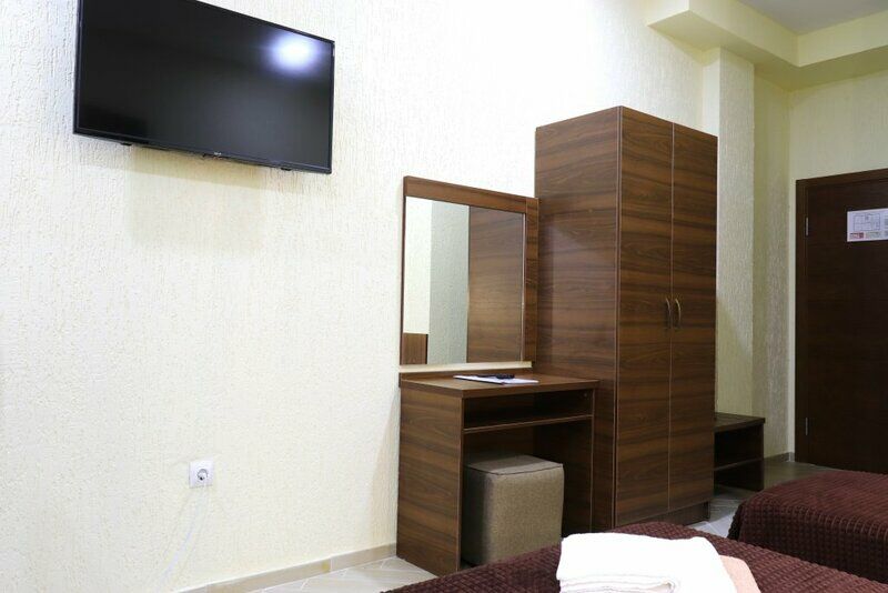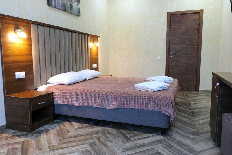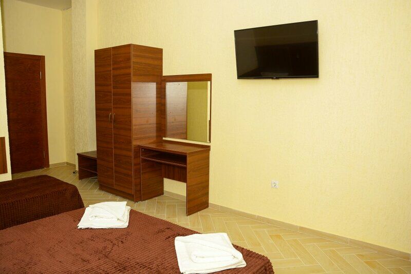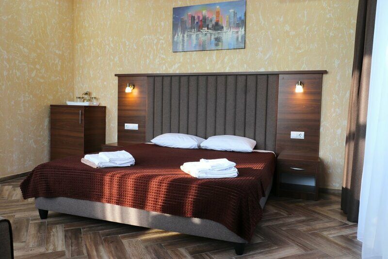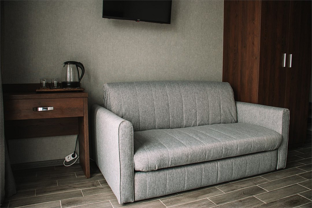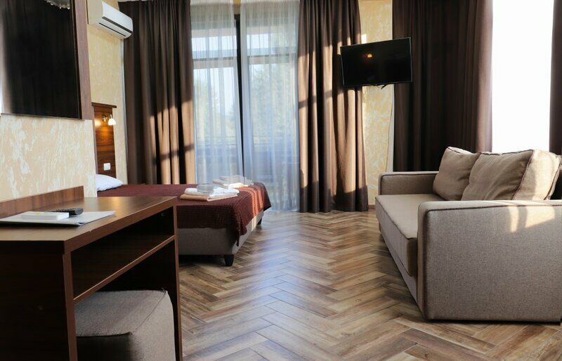 Сплит-система, холодильник, LED телевизор, удобные кровати: двуспальная или две односпальные кровати (основное размещение), диван-кровать (дополнительное размещение), прикроватные тумбочки, вешалка с зеркалом, шкаф. Санузел в номере.