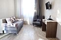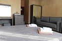 Сплит-система, холодильник, LED телевизор, удобные кровати: двуспальная (основное размещение), двуспальный диван и кресло-кровать (дополнительное размещение), прикроватные тумбочки, столик с зеркалом, шкаф. Санузел в номере.