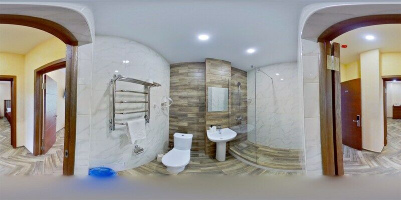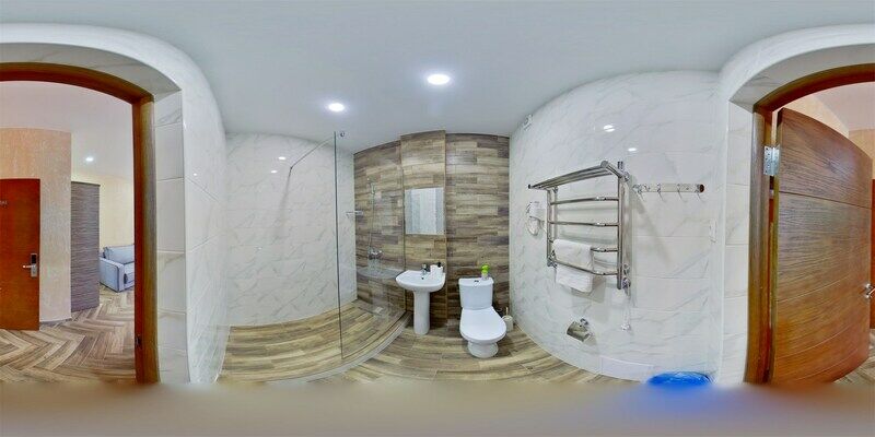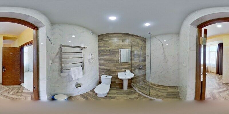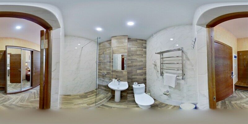 Сплит-система, холодильник, 2 современных телевизора, удобные кровати: две двуспальные (основное размещение), односпальная и раскладная-кровать (дополнительное размещение), прикроватные тумбочки, столик с зеркалом, шкаф. Санузел в номере.