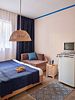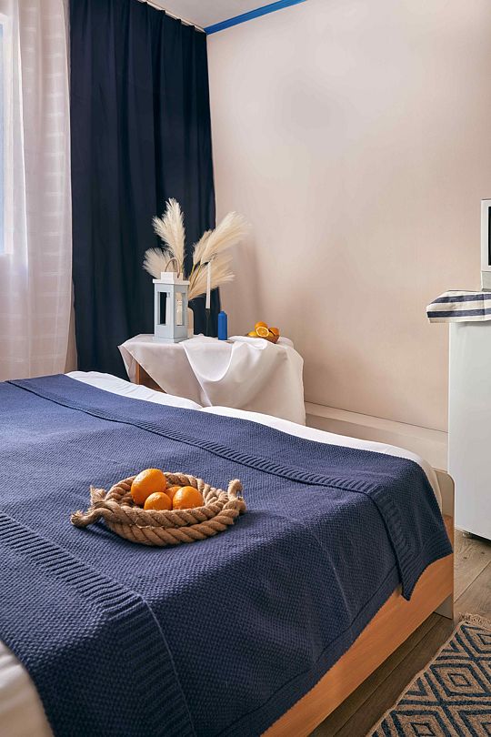 Включают в себя спальные места (двуспальная и односпальные кровати или двуспальная кровать и раскладное кресло), холодильник, телевизор, кондиционер, с/у в номере, шкаф, небольшой столик и тумбочка, зеркало.