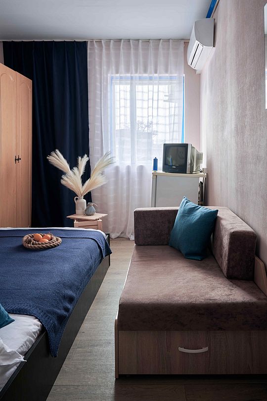 Включают в себя спальные места (раскладной диван и односпальные кровати), холодильник, телевизор, кондиционер, с/у в номере, шкаф, небольшой столик и тумбочка, зеркало.