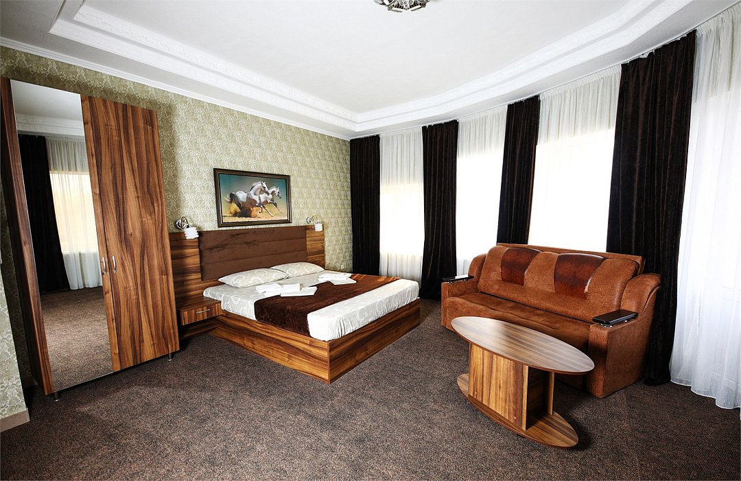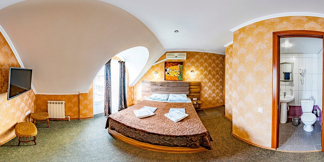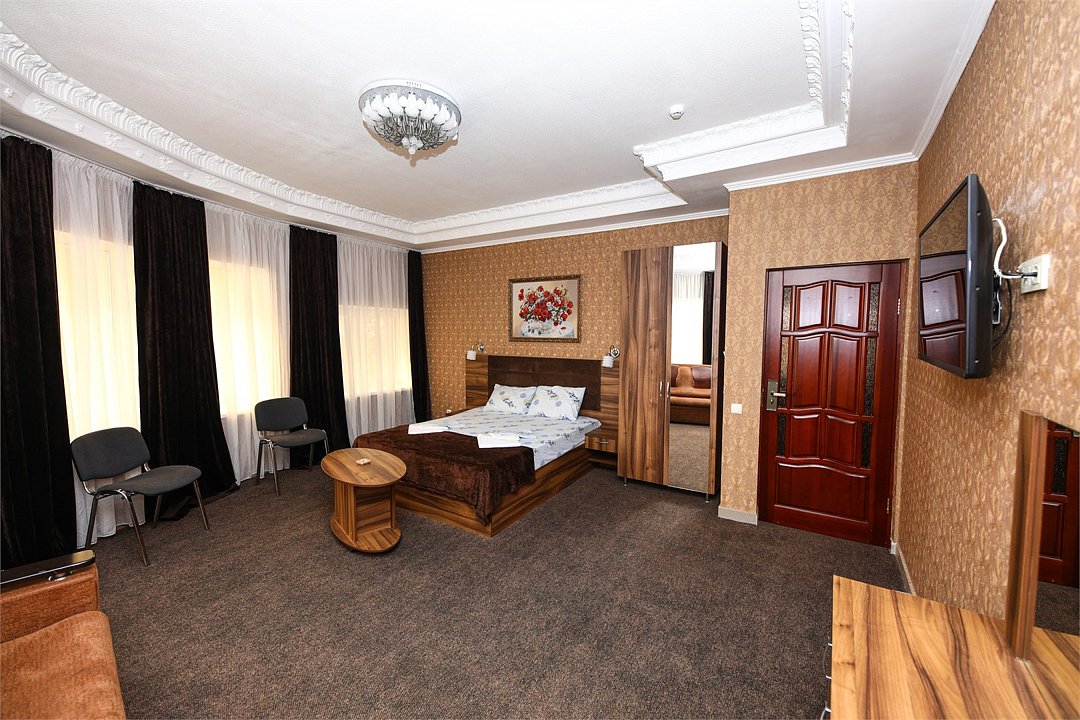 телевизор, Wi-Fi, холодильник, фен, кровать «King size», шкаф для одежды, душ, вид на город, диван-кровать, вешалки-плечикиВ гостиничном номере