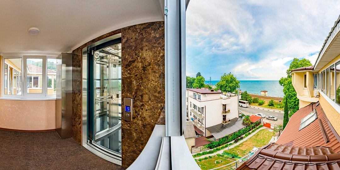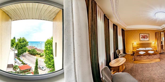 комфортабельный номер с личными удобствами видом на море и горы . номер расположен на шестом этаже отеля к которому вас поднимает прекрасный панорамный лифт из которого видно не только море но и окружающие вас красоты .Услуги и удобства