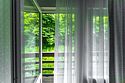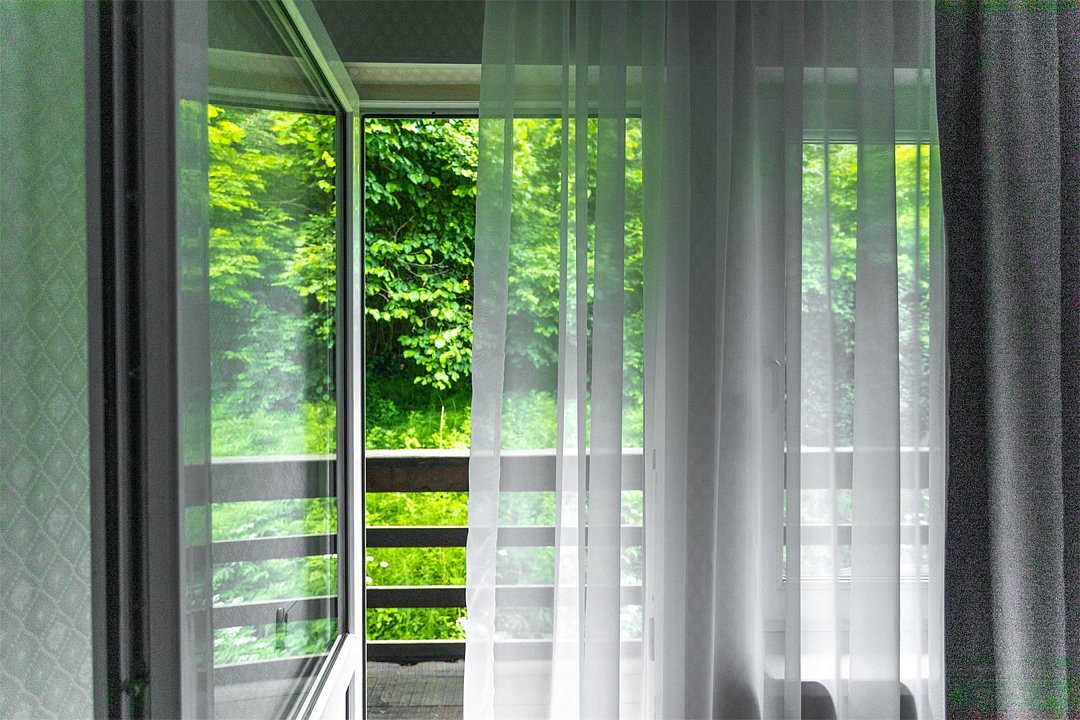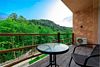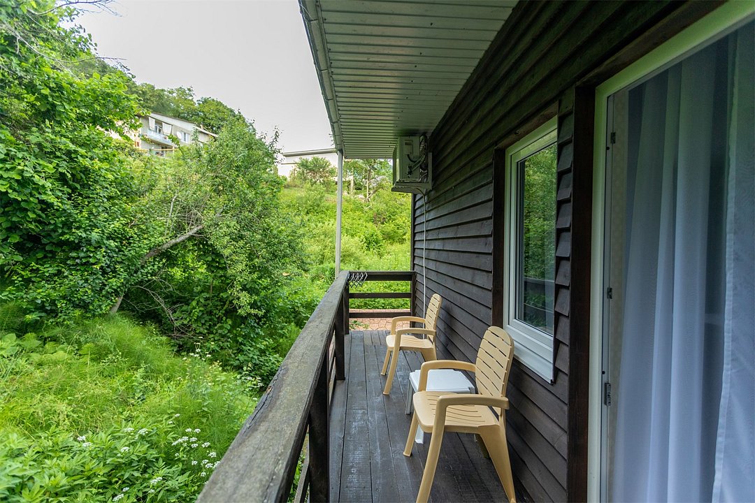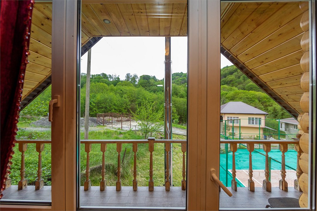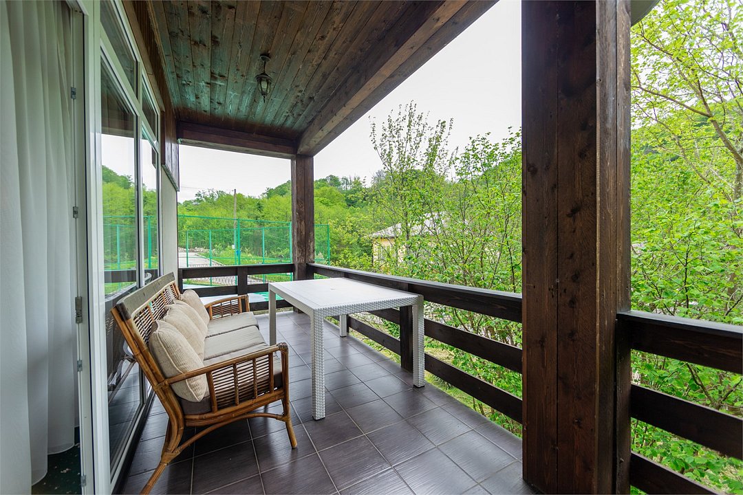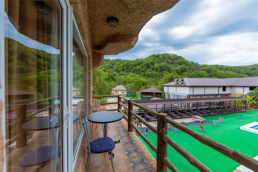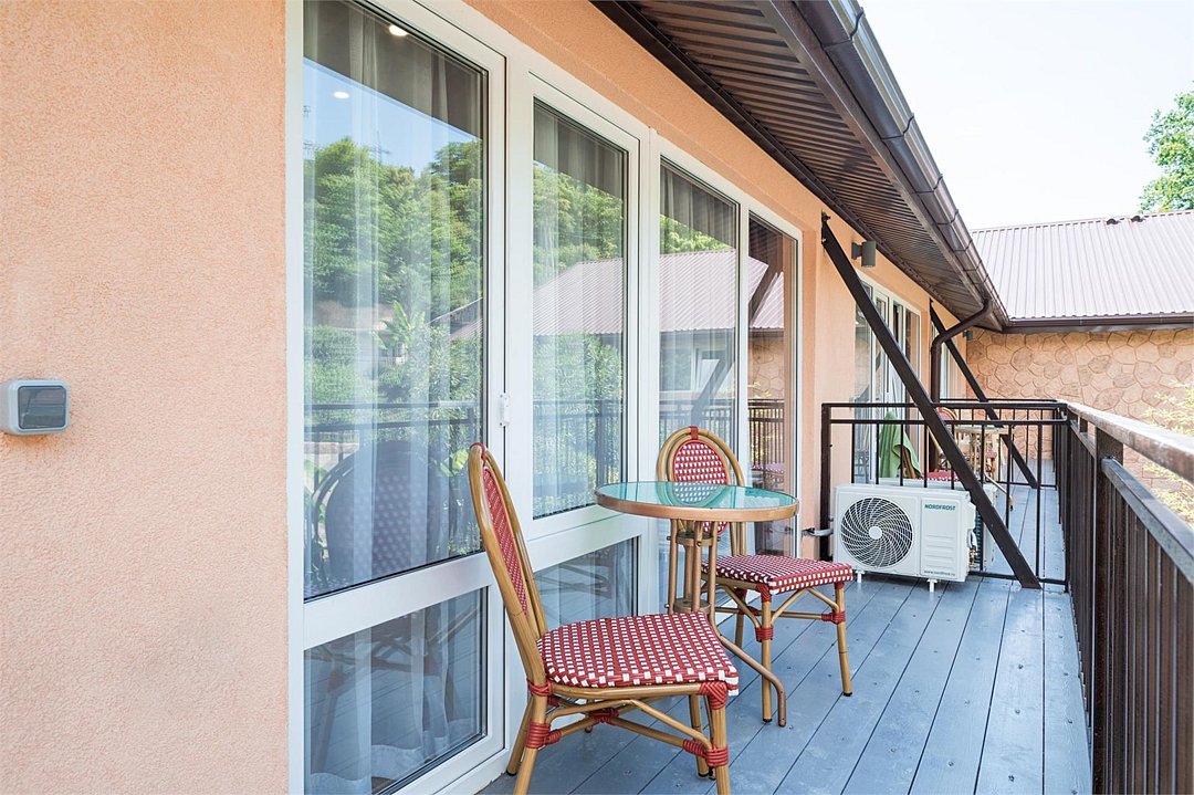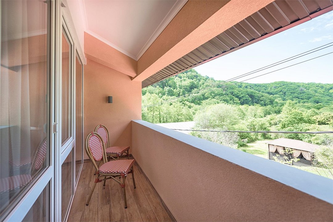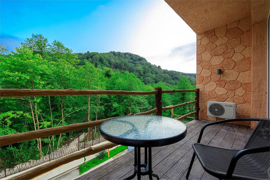 В номере есть балкон, с которого открывается живописный вид на горы и лес. На балконе установлены кресла и столик.
