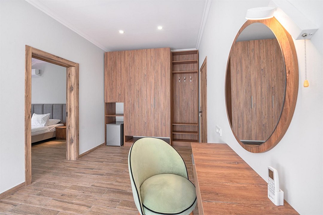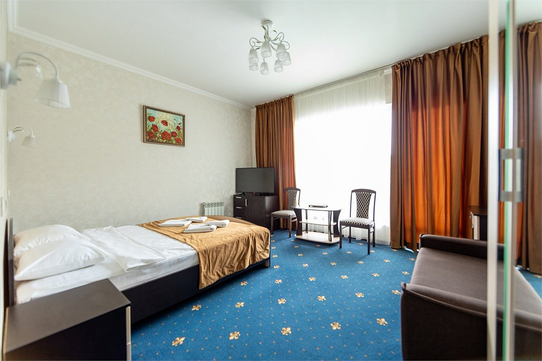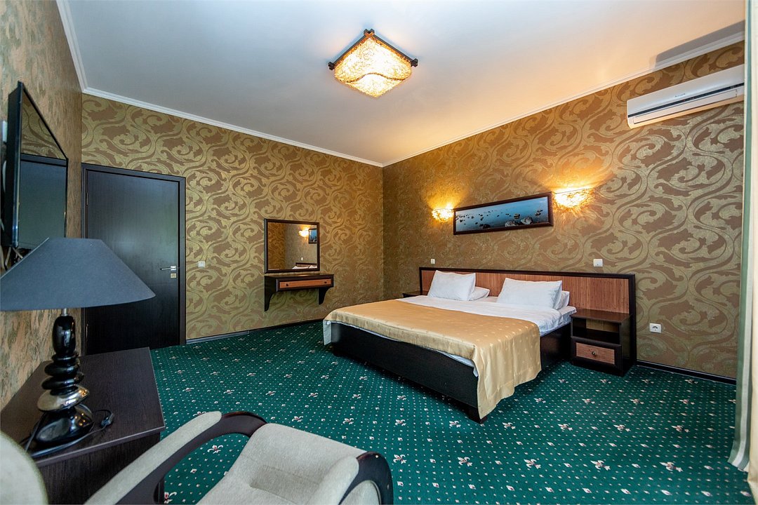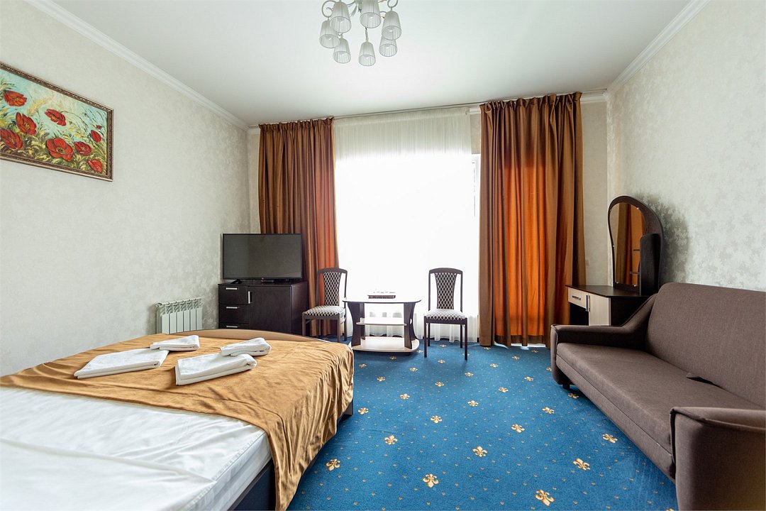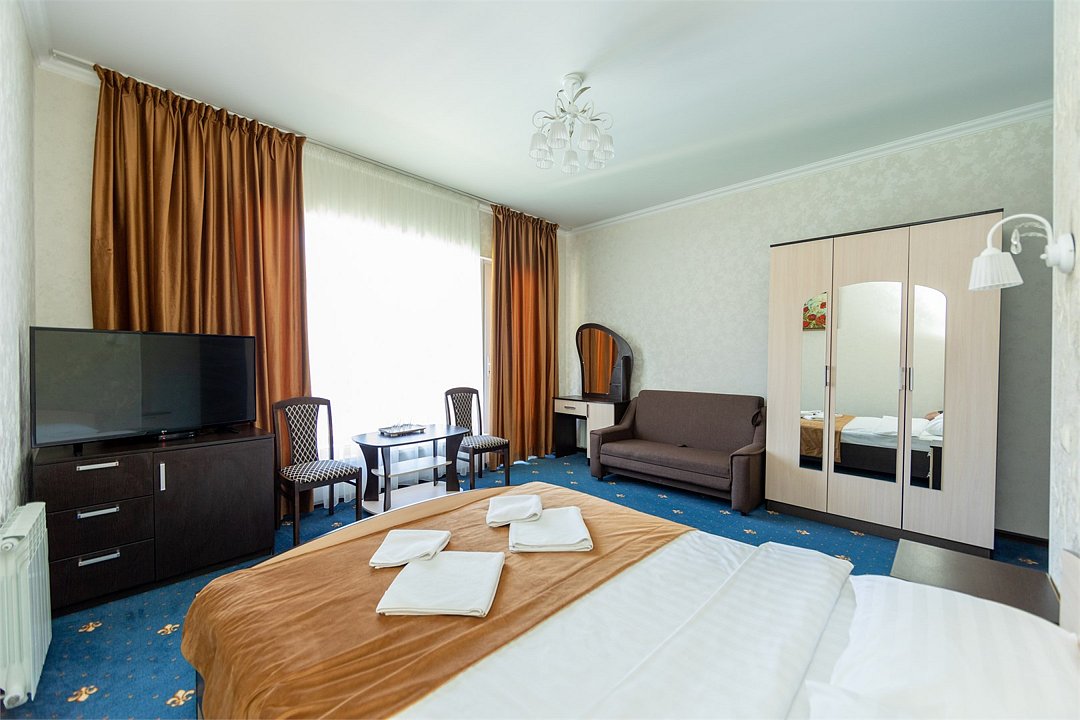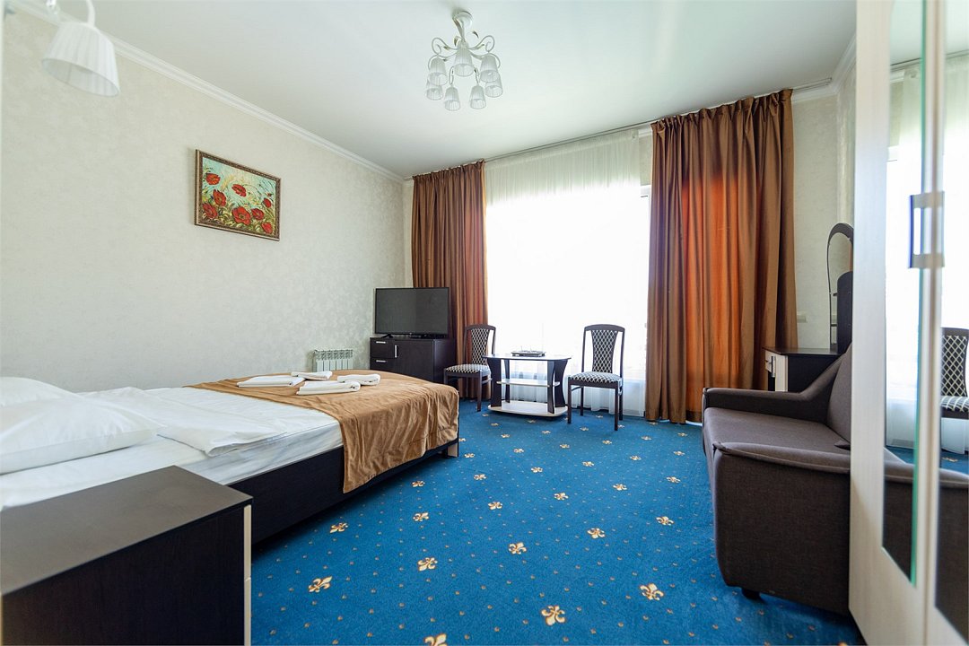 Однокомнатный, двухместный номер с современным ремонтом. Площадь 25 м2. В номере: Wi-Fi, кондиционер, холодильник, телевизор, фен, одёжный шкаф, двуспальная кровать, журнальный столик, прикроватные тумбочки. Возможно размещение на дополнительном месте (двуспальный диван). При размещении с маленькими детьми, бесплатно устанавливается детская кроватка. Номера расположены на первом и втором этаже. Особо надо отметить широкие балконы, где также можно посидеть за столиком с близким вам человеком. Кроме всего этого, из окон комнат вас ждут волнующие виды горных пейзажей, внутреннего двора отеля с бассейнами.Услуги и удобства