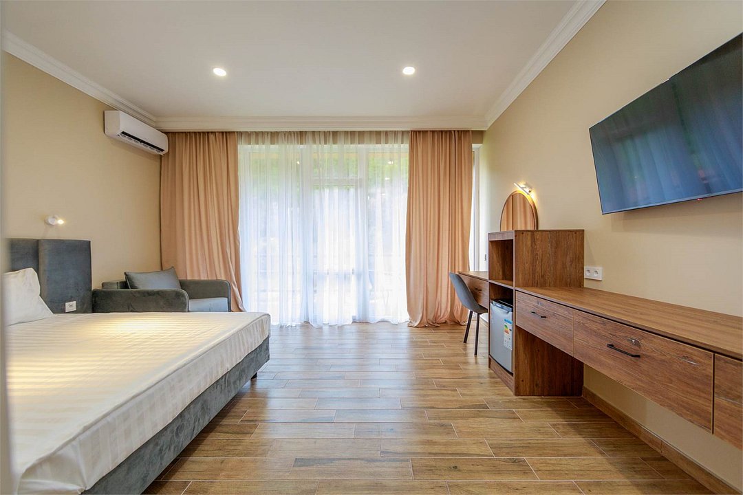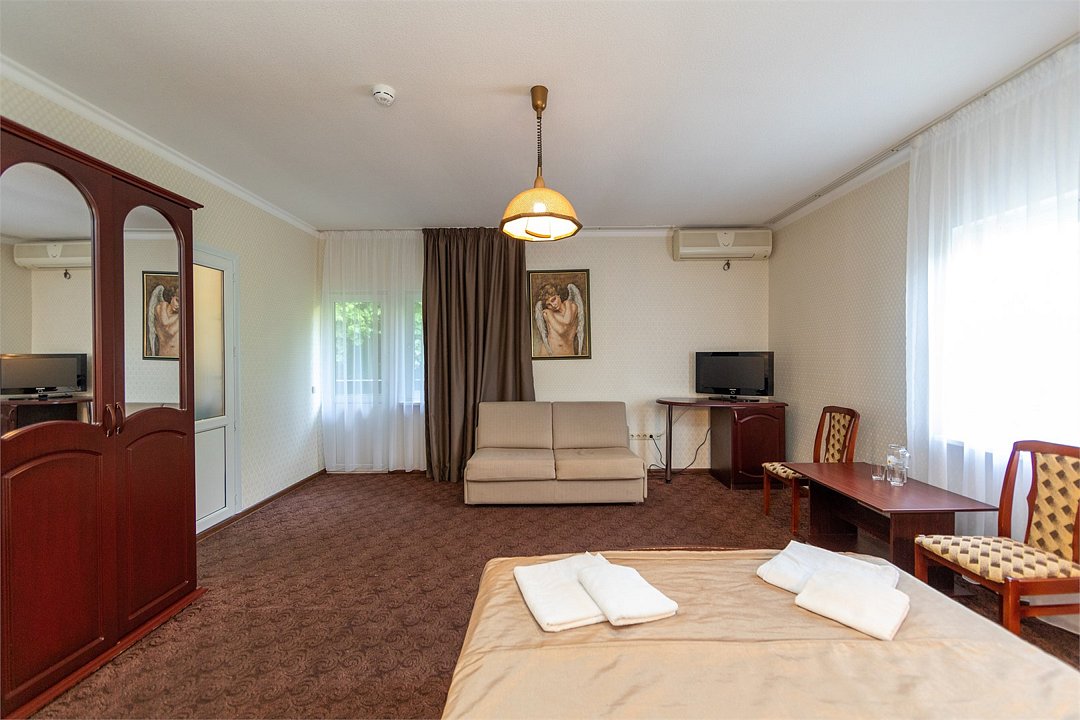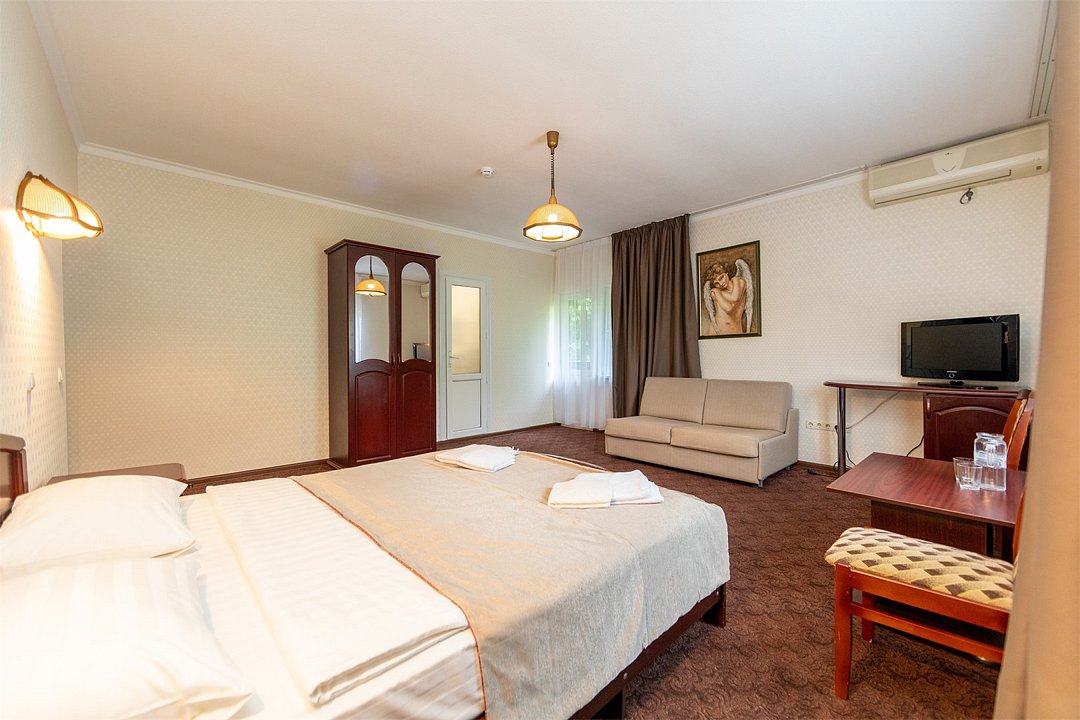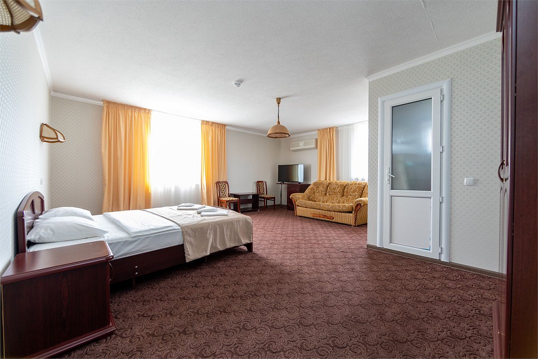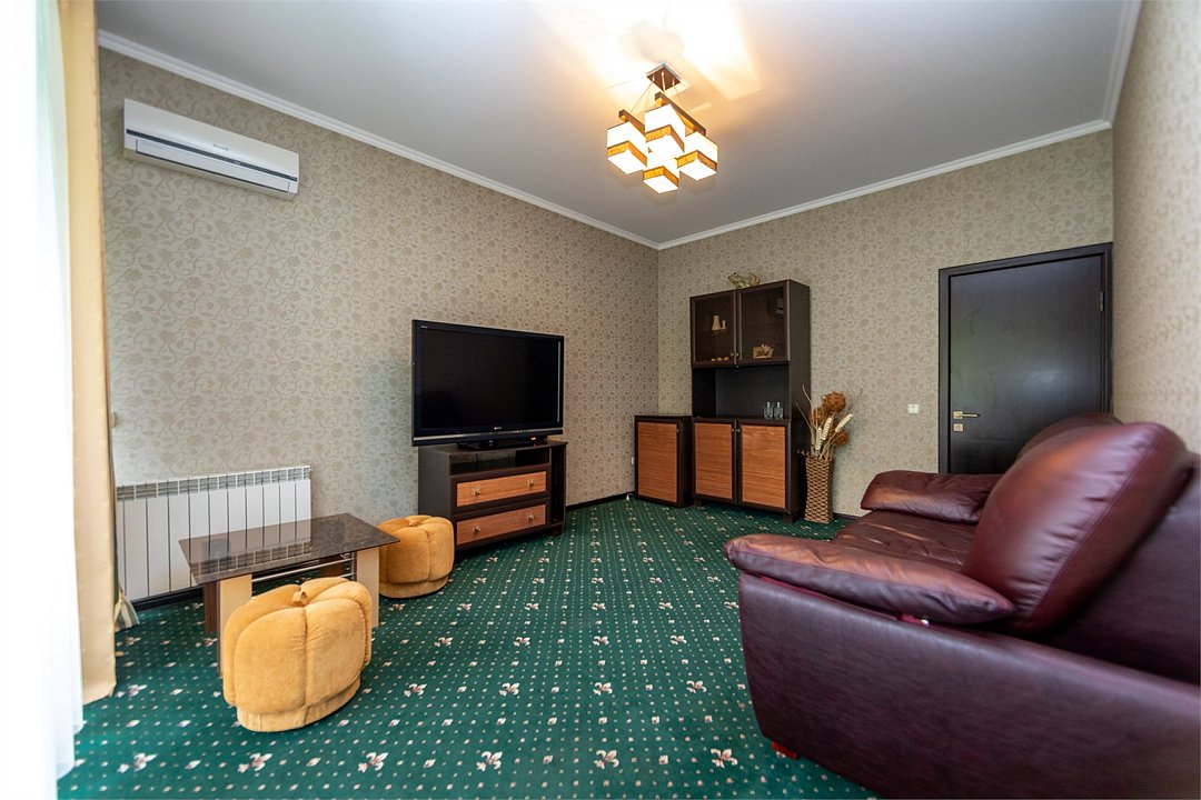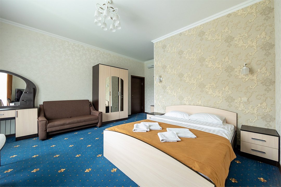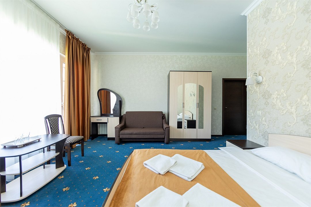Просторный двухкомнатный номер повышенной комфортности, общей площадью 90 м2. В номере: спальная комната, гостиная комната с диваном необходимой мебелью. Wi-Fi, два кондиционера, два телевизора, фен и ванная комната. В спальной комнате установлена двуспальная кровать, в гостиной предусмотрено два дополнительных места (диван-кровать). При размещении с маленькими детьми, бесплатно предоставляется детская кроватка. Номера расположены на первом и втором этаже в отдельно стоящих коттеджах, что позволяет гостям отеля уединяться в спокойной атмосфере и не тревожить друг друга. В номере есть балкон, с которого открывается живописный вид на горы и парковую зону. На балконе установлены кресла и столик.Услуги и удобства