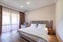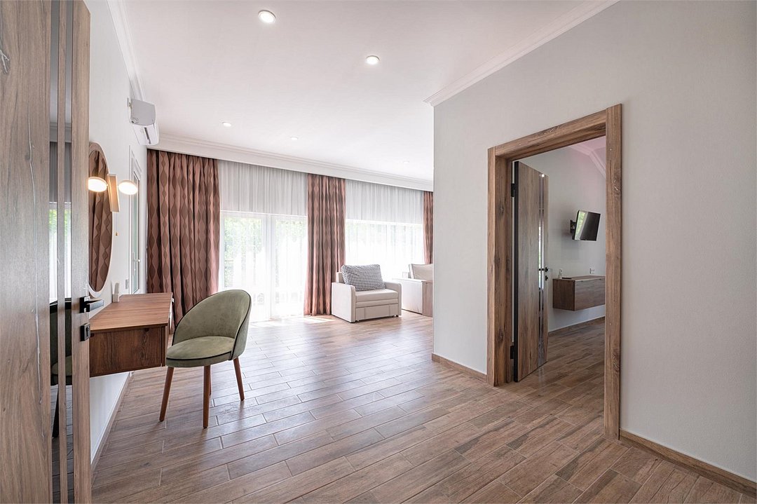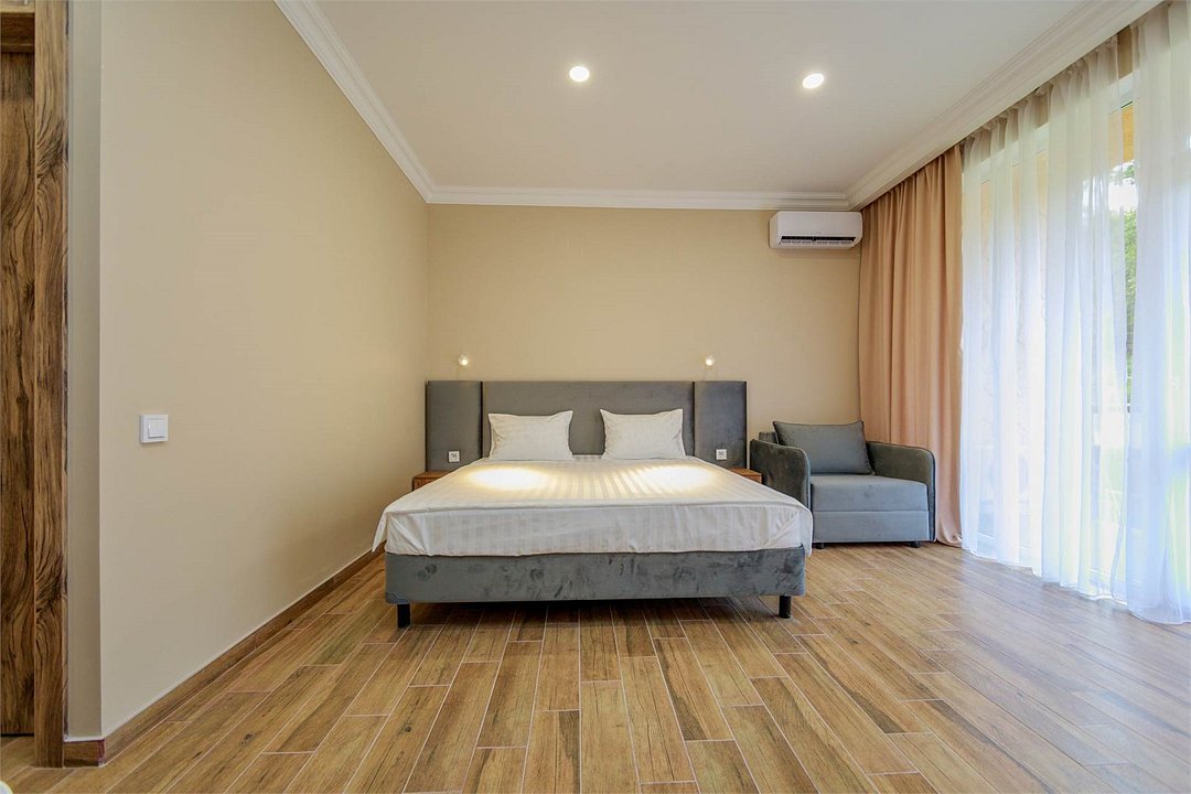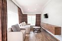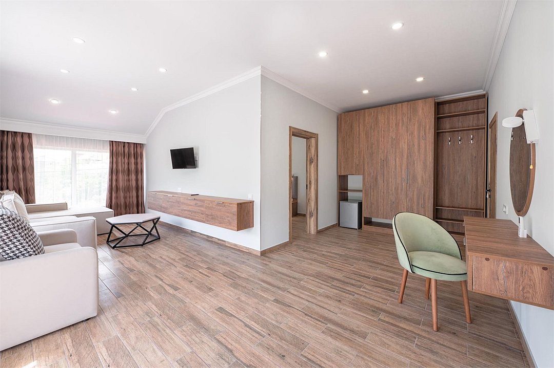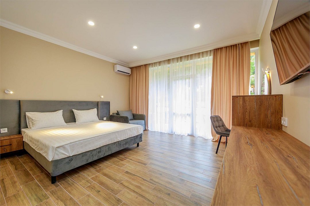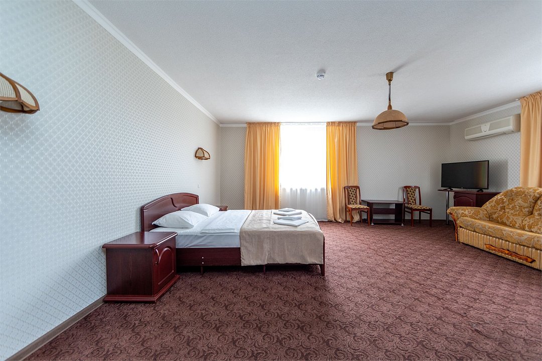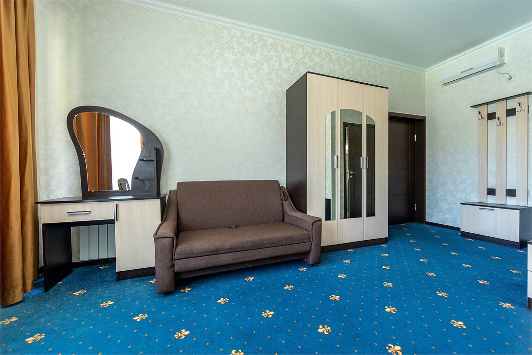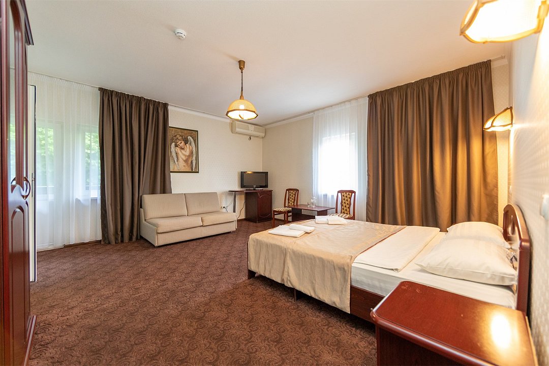 Просторный двухкомнатный номер повышенной комфортности, общей площадью 90 м2. В номере: спальная комната, гостиная комната с диваном необходимой мебелью. Wi-Fi, два кондиционера, два телевизора, фен и ванная комната. В спальной комнате установлена двуспальная кровать, в гостиной предусмотрено два дополнительных места (диван-кровать). При размещении с маленькими детьми, бесплатно предоставляется детская кроватка. Номера расположены на первом и втором этаже в отдельно стоящих коттеджах, что позволяет гостям отеля уединяться в спокойной атмосфере и не тревожить друг друга. В номере есть балкон, с которого открывается живописный вид на горы и парковую зону. На балконе установлены кресла и столик.Услуги и удобства