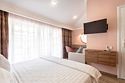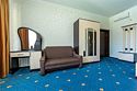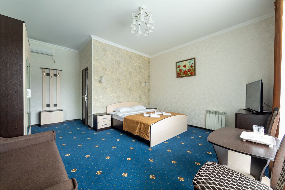 Однокомнатный, двухместный номер с современным ремонтом. Площадь 25 м2. В номере: Wi-Fi, кондиционер, холодильник, телевизор, фен, одёжный шкаф, двуспальная кровать, журнальный столик, прикроватные тумбочки. Возможно размещение на дополнительном месте (кресло-кровать). При размещении с маленькими детьми, бесплатно устанавливается детская кроватка. Номера расположены втором этаже. В номере есть балкон. На балконе установлены кресла и столик.Услуги и удобства