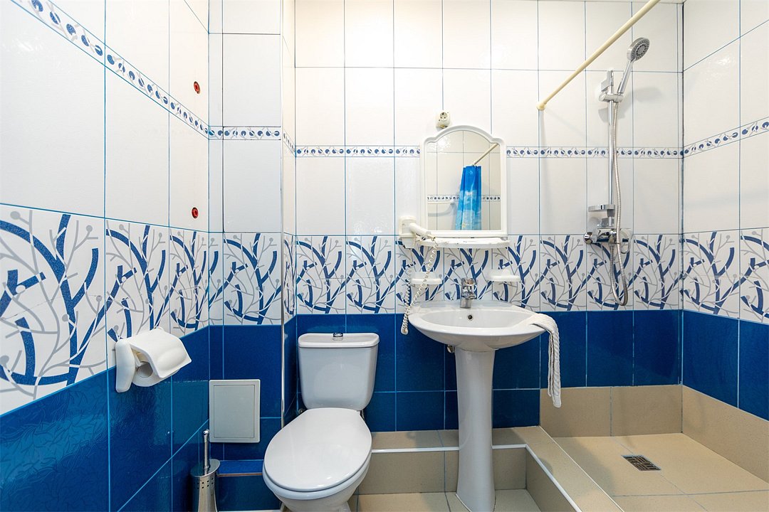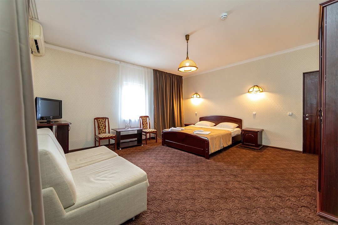 Однокомнатный, двухместный номер с современным ремонтом. Площадь 25 м2. В номере: Wi-Fi, кондиционер, холодильник, телевизор, фен и необходимая мебель: одёжный шкаф, двуспальная кровать, журнальный столик, прикроватные тумбочки. Помимо двух основных мест возможно размещение на дополнительном месте (двуспальный диван). При размещении с маленькими детьми бесплатно устанавливается детская кроватка. Номера расположены на первом и третьем этаже.Услуги и удобства