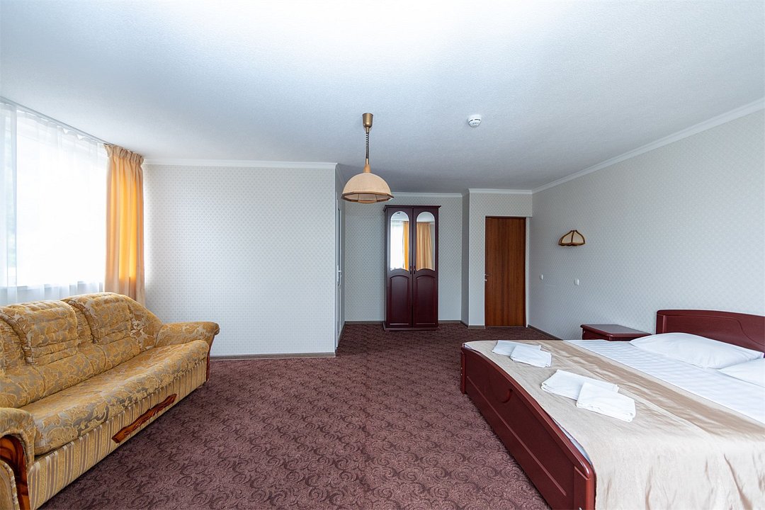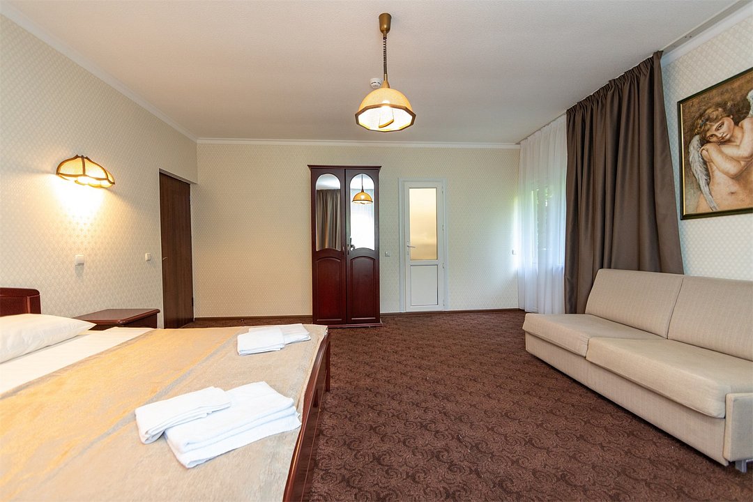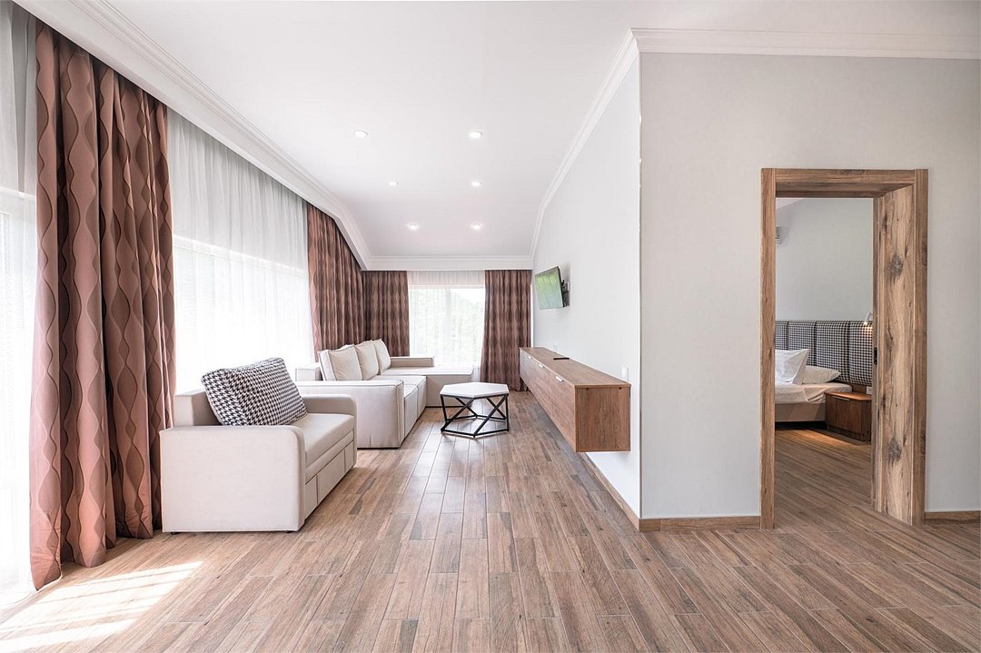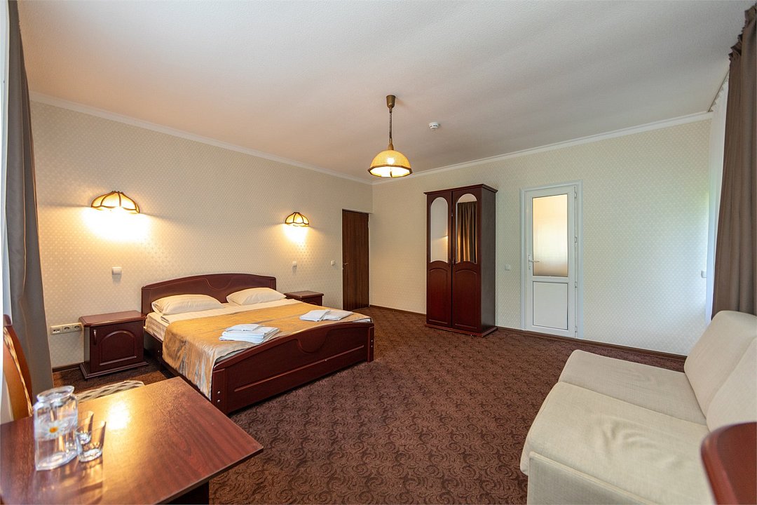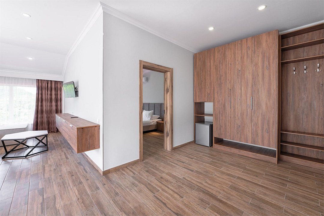 Просторный двухкомнатный номер повышенной комфортности, общей площадью 45 м2. В номере: спальная комната, гостиная комната с диваном необходимой мебелью, Wi-Fi, кондиционер, телевизор, фен и ванная комната. В спальной комнате установлена двуспальная кровать, в гостиной предусмотрено два дополнительных места (диван-кровать). При размещении с маленькими детьми, бесплатно предоставляется детская кроватка. Единственный номер расположен на втором этаже. В номере есть балкон, с которого открывается живописный вид на горы и лес. На балконе установлены кресла и столик.Услуги и удобства
