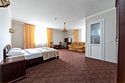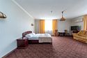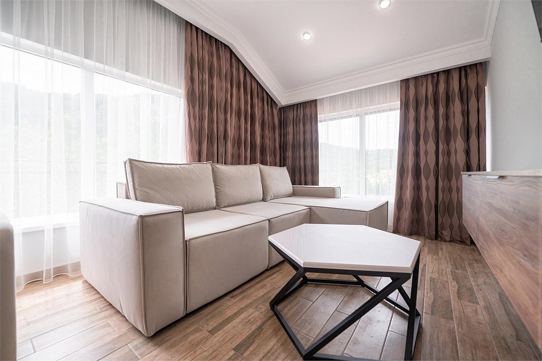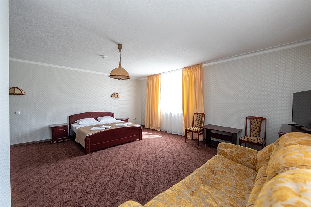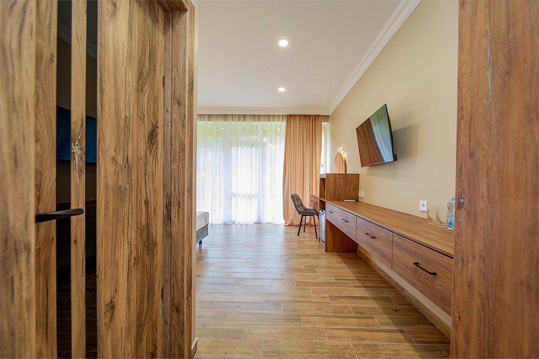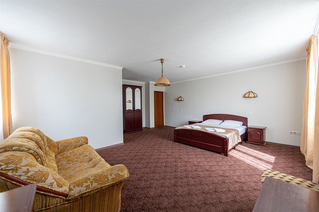 Просторный двухкомнатный номер повышенной комфортности, общей площадью 45 м2. В номере: спальная комната, гостиная комната с диваном необходимой мебелью, Wi-Fi, кондиционер, телевизор, фен и ванная комната. В спальной комнате установлена двуспальная кровать, в гостиной предусмотрено два дополнительных места (диван-кровать). При размещении с маленькими детьми, бесплатно предоставляется детская кроватка. Единственный номер расположен на втором этаже. В номере есть балкон, с которого открывается живописный вид на горы и лес. На балконе установлены кресла и столик.Услуги и удобства