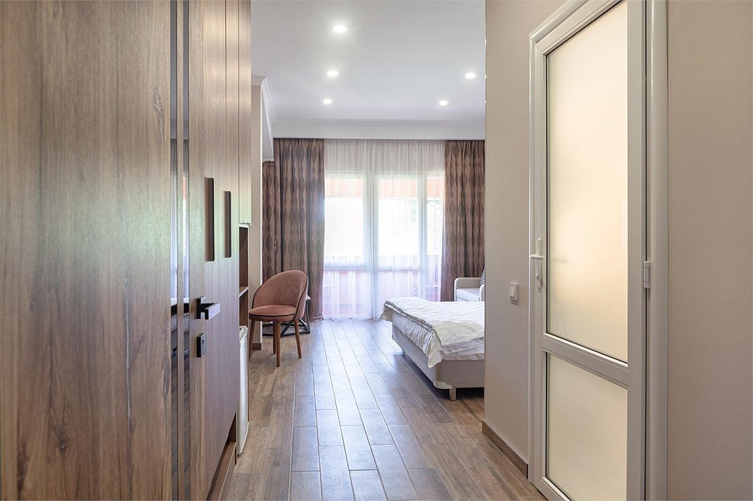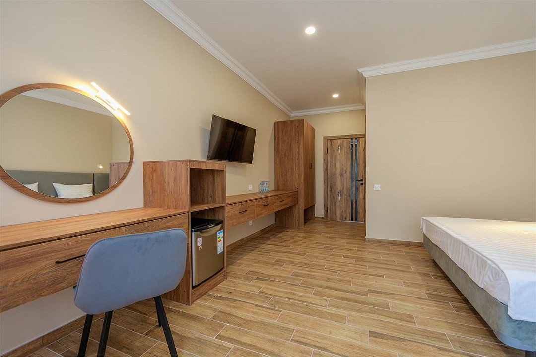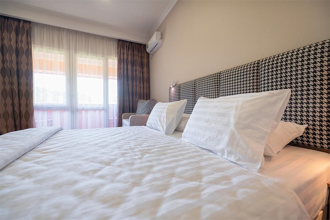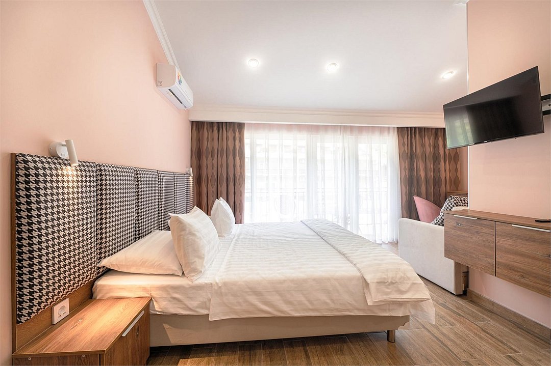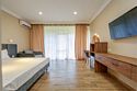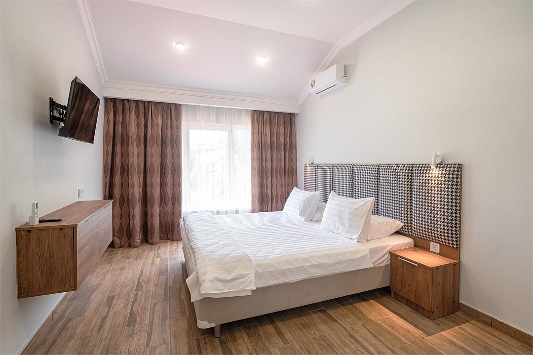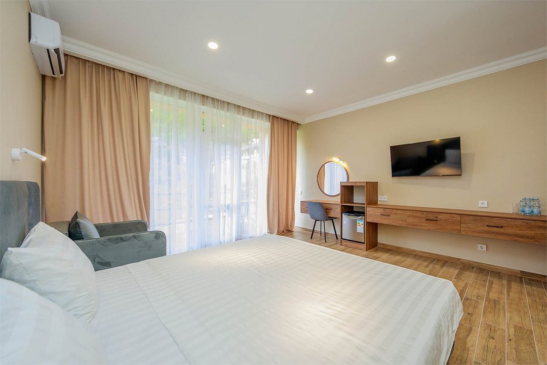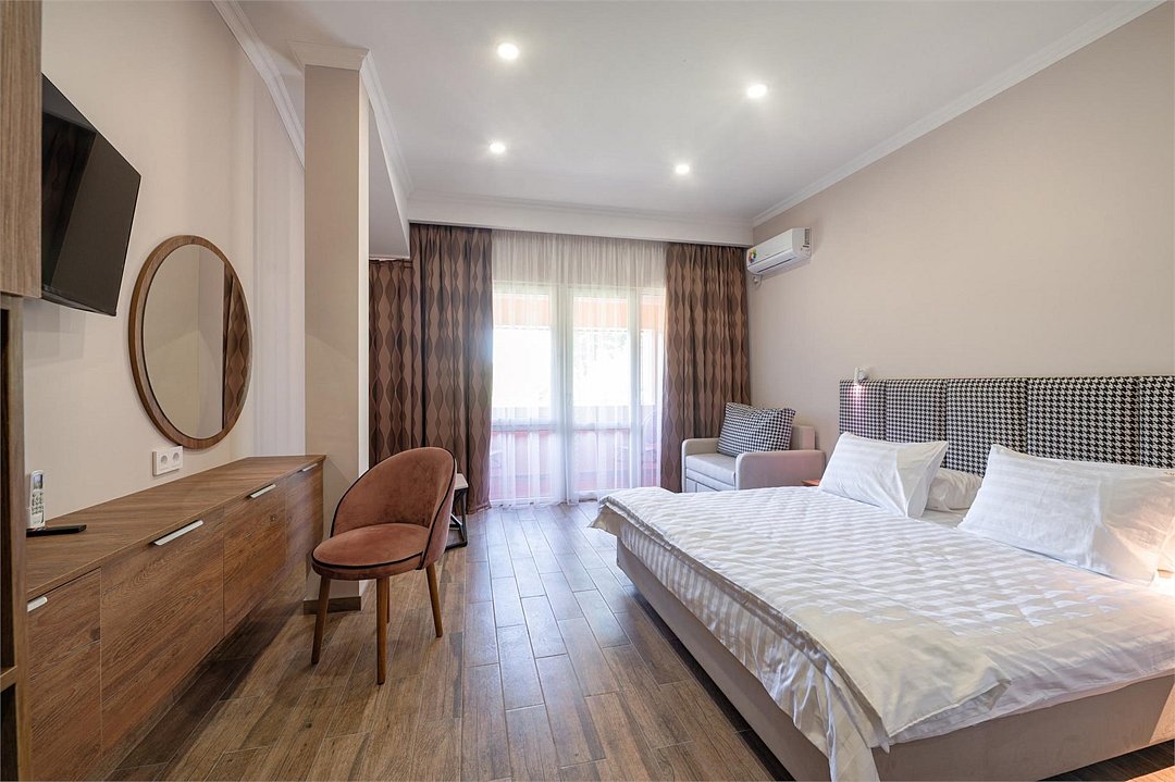 Однокомнатный, двухместный номер с современным ремонтом. Площадь 25-30 м2. В номере: Wi-Fi, кондиционер, холодильник, телевизор, фен, сейф, одёжный шкаф, двуспальная кровать, журнальный столик, прикроватные тумбочки. Возможно размещение на дополнительном месте (двуспальный диван или еврораскладушка). При размещении с маленькими детьми, бесплатно устанавливается детская кроватка. Номера расположены на первом и втором этаже. Особо надо отметить широкие балконы, где также можно посидеть за столиком с близким вам человеком. Кроме всего этого, из окон комнат вас ждут волнующие виды горных пейзажей, внутреннего двора отеля с бассейнами.Услуги и удобства