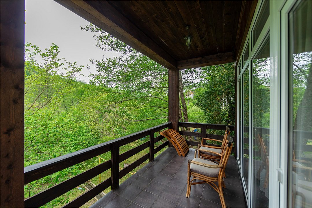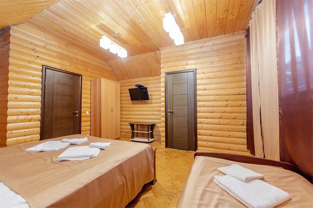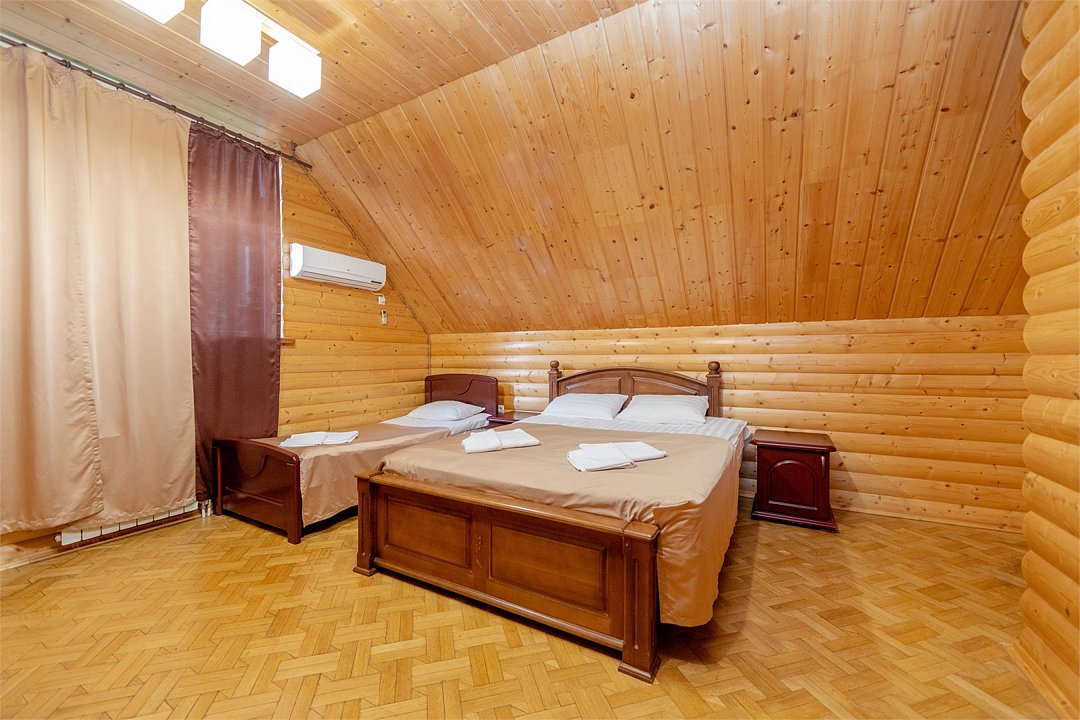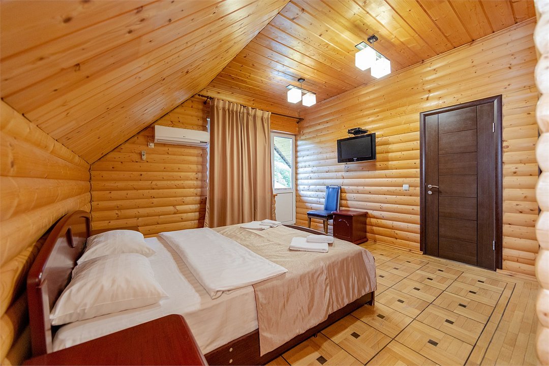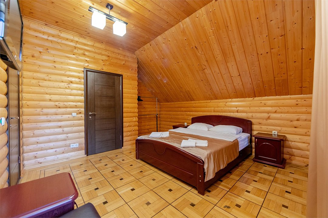 Просторный номер представляет собой отдельно стоящий двухуровневый трёхкомнатный коттедж, общей площадью 150 м2. В номере: две спальни, просторная гостиная, которые идеально подойдут для большой семьи или дружной компании. Wi-Fi, два кондиционера, телевизоры, фен, сейф, две ванные комнаты. При размещении с маленькими детьми, бесплатно предоставляется детская кроватка. При входе в номер оборудована большая терраса с мебелью, с которой открывается живописный вид на горы и лес.Услуги и удобства