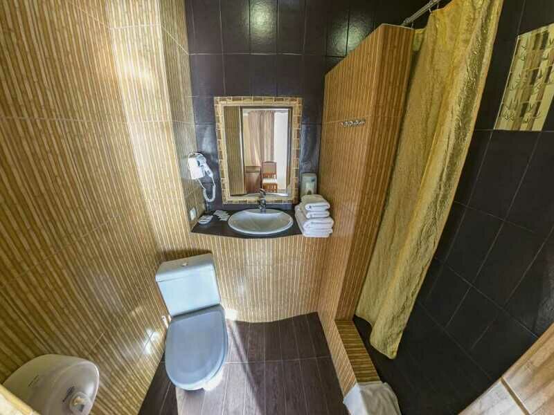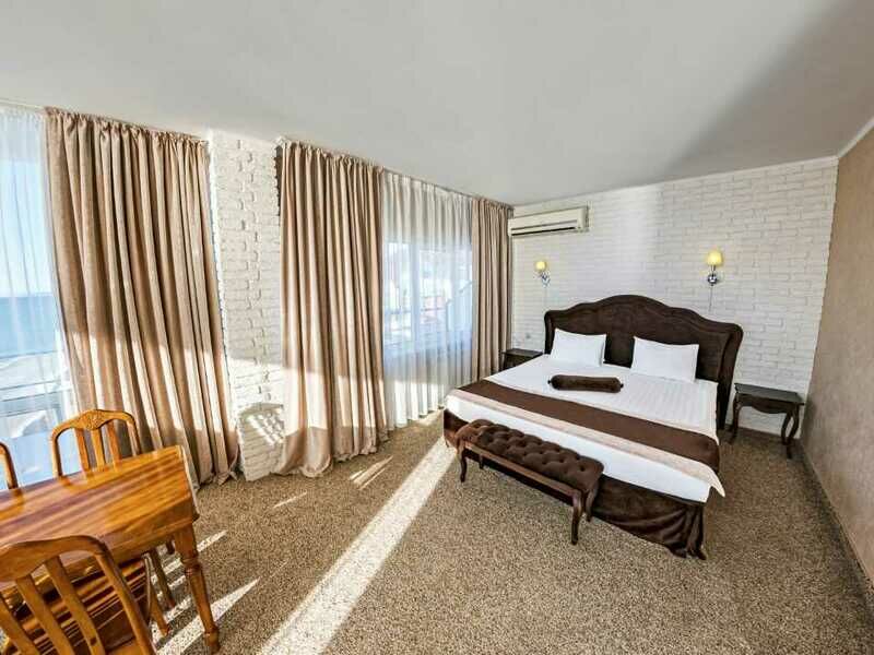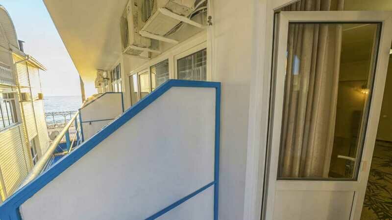 Корпус состоит из пяти этажей. Он оснащен лифтом. Здание гостиницы находится на первой береговой линии города. Гости смогут разместиться в номерах Стандарт, которые вмещают пять человек, а также в трехместных люксах с чудесными видами но море. Интерьер номеров современный. Вся мебель отличного качества. В них имеется санузел, а также техника - фен, холодильник, телевизор и кондиционер.