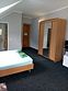 Трехместный номер стандарт, расположен на третьем этаже гостиницы, общей площадью 16 кв.м. В номере представлены двуспальная кровать и кресло-кровать, санузел. Оснащен кондиционером, ТВ, шкафом, прикроватными тумбочками.