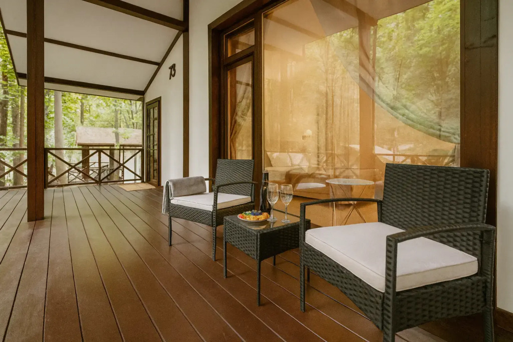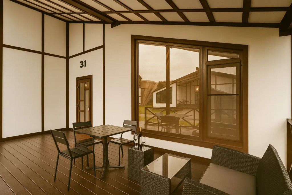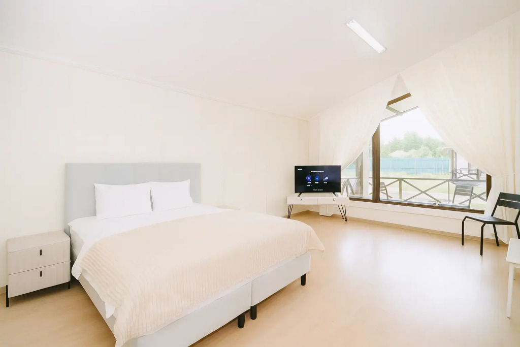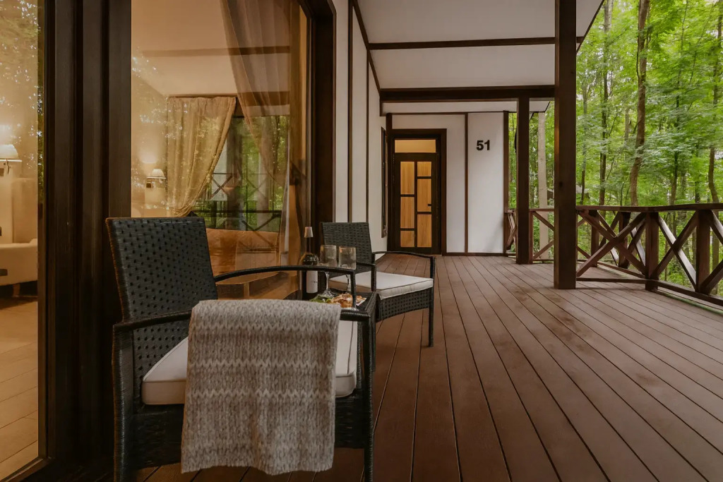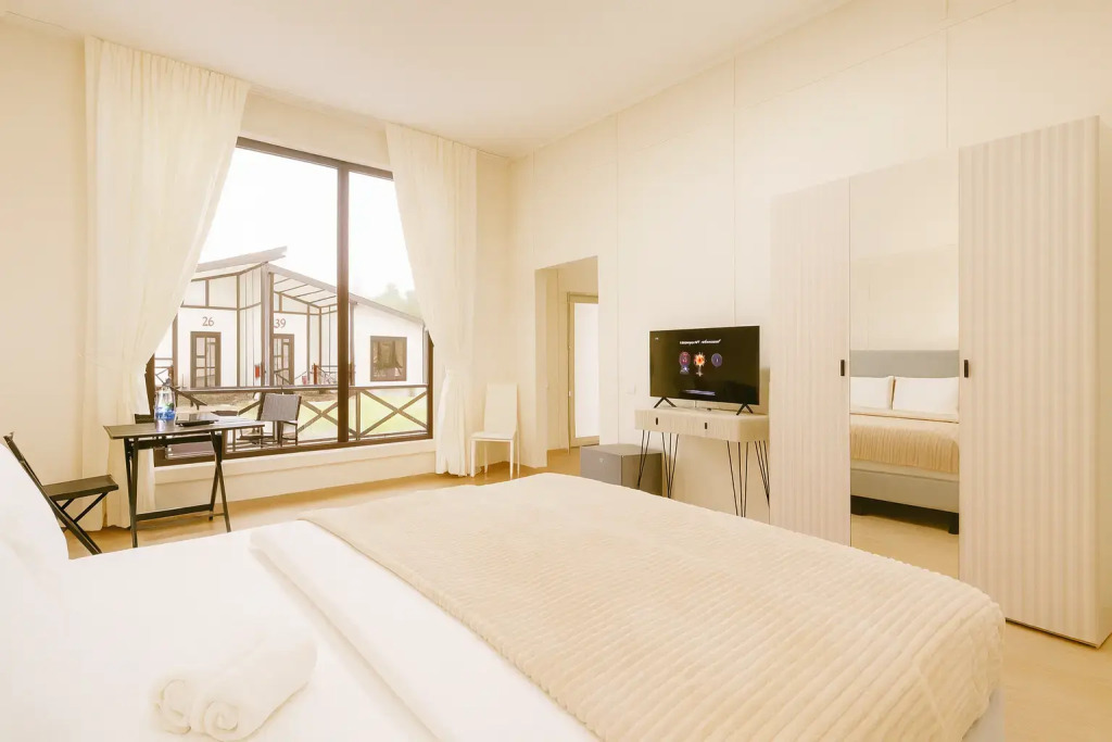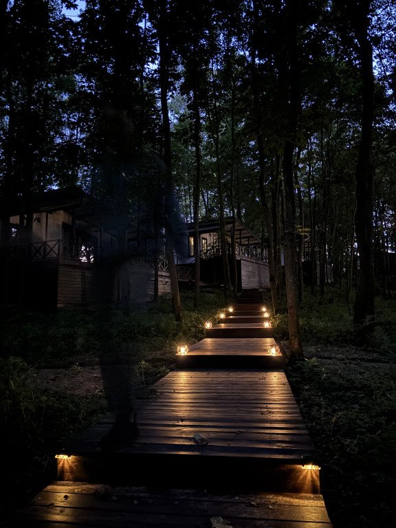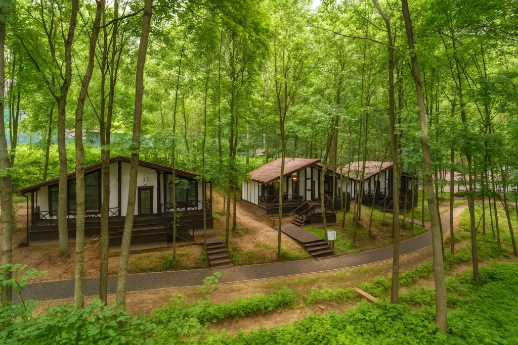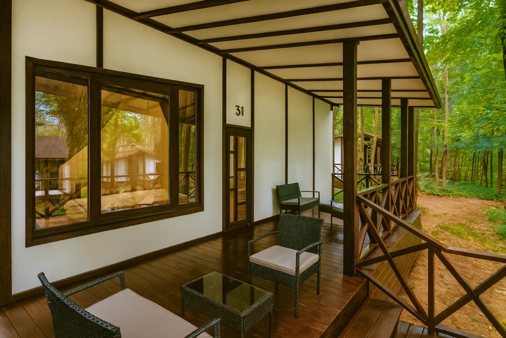 Для гостей подготовлены коттеджи в эко-стиле с панорамными окнами и верандами. Каждый номер оформлен с использованием натуральных отделочных материалов и оснащён необходимой мебелью и принадлежностями для проживания.