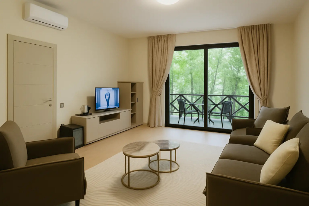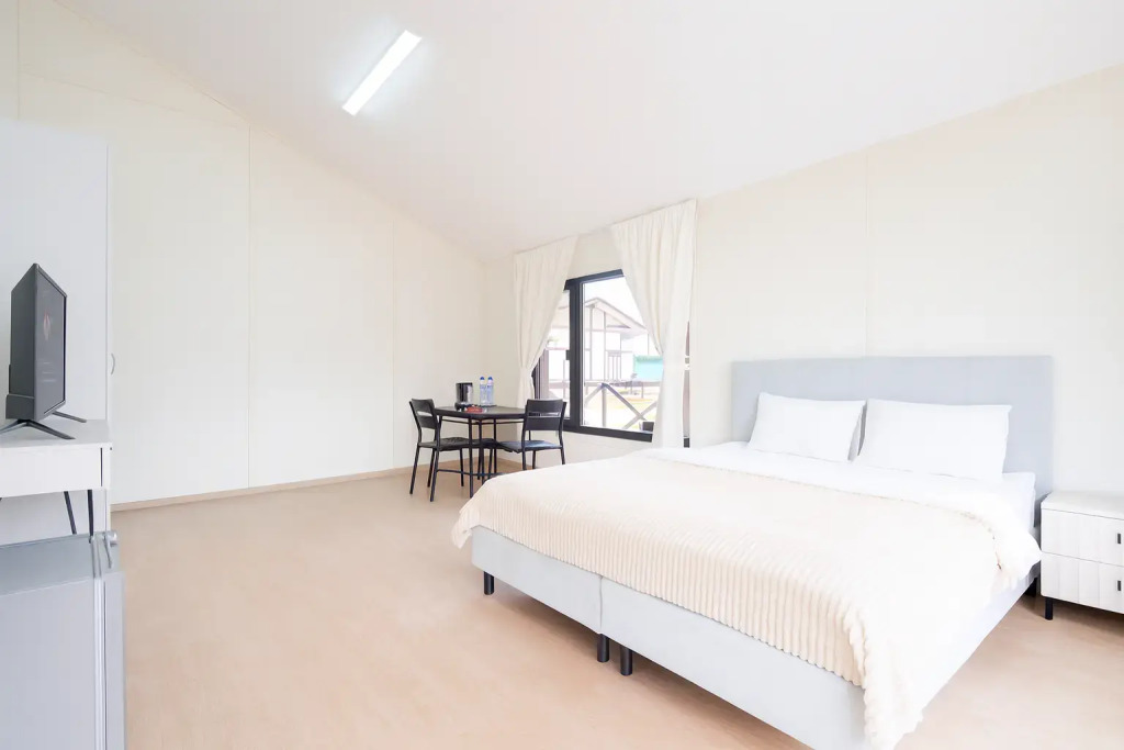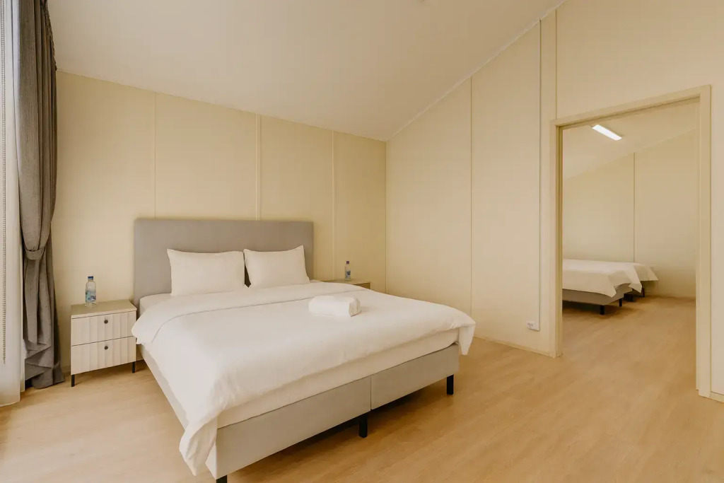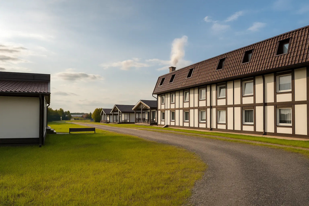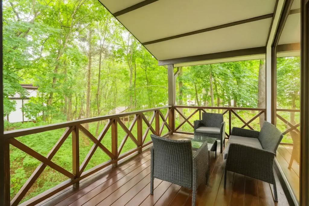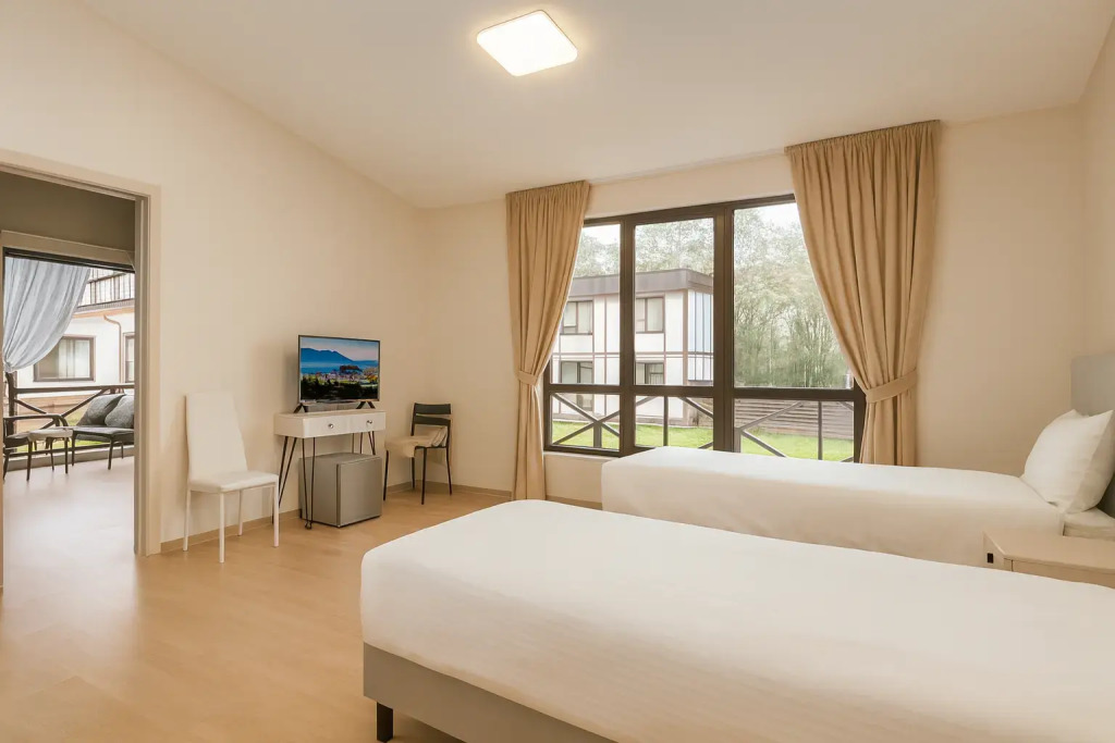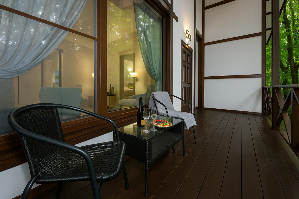 Для гостей подготовлены коттеджи в эко-стиле с панорамными окнами и верандами. Каждый номер оформлен с использованием натуральных отделочных материалов и оснащён необходимой мебелью и принадлежностями для проживания.